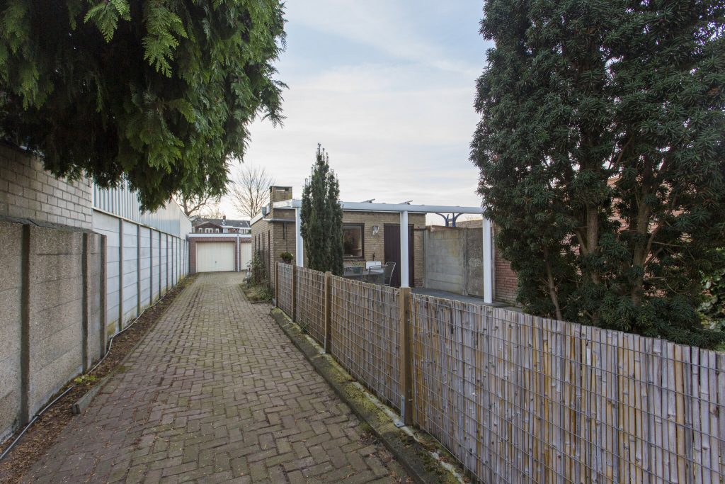 De woning beschikt over een flinke achtertuin gelegen op het zonnige westen. De tuin is onderhoudsvriendelijk en volledig voorzien van sierbestrating. Daarnaast vindt u hier enkele plantenborders. Aan de achterzijde vindt u een van de garages. Aan deze garage staat een sfeervolle overkapping. Tevens heeft u vanuit hier toegang tot de andere garages op het achter terrein. Aan de voorzijde van de woning heeft u via een openslaande poort toegang tot de inrit naar het achter terrein. De poort is breed genoeg om met de auto achterom te rijden.
