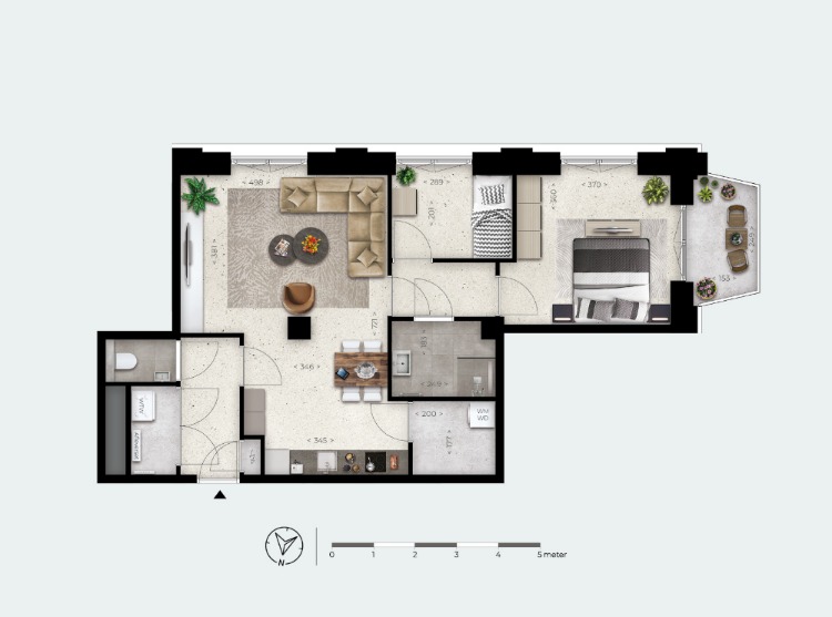 Ook is er van dit appartement een alternatieve indeling beschikbaar met twee slaapkamers. Deze variant heeft een woonkamer met open keuken van 31 m² en twee slaapkamers van 14 m² en 6 m².