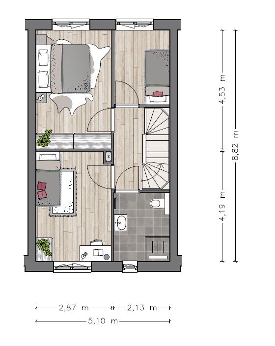 Type B1 is een fraaie tussenwoning op een ruim perceel en komt vier keer voor in het project. Deze ruime tussenwoningen met een beukmaat van 5,4 meter kennen een uiterst functionele indeling. De begane grond biedt ruimte aan een woonkamer met keuken, een trapkast en een hal met trapopgang en toilet. Op de eerste verdieping biedt de type B1 woning onder meer 3 slaapkamers en een badkamer. Op de tweede verdieping bevind zich een aparte technische ruimte met opstelmogelijkheid voor wasmachine en droger. De tuin van deze woning is voorzien van een berging. De woningen op kavel 3 & 13 zijn wit gekeimd en zijn voorzien van een dwarskap. Dit zorgt voor