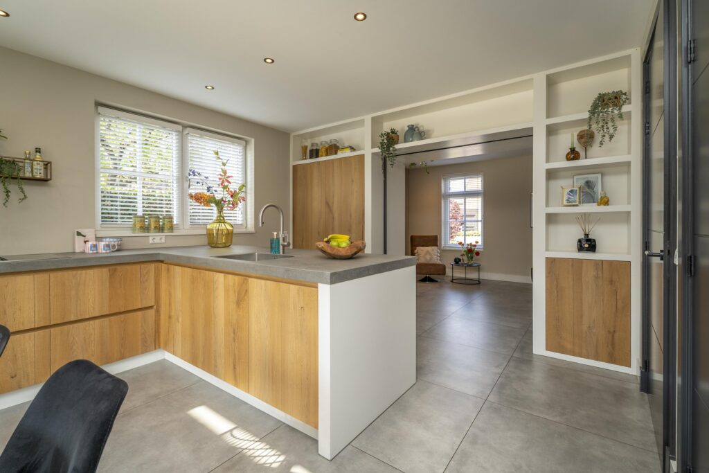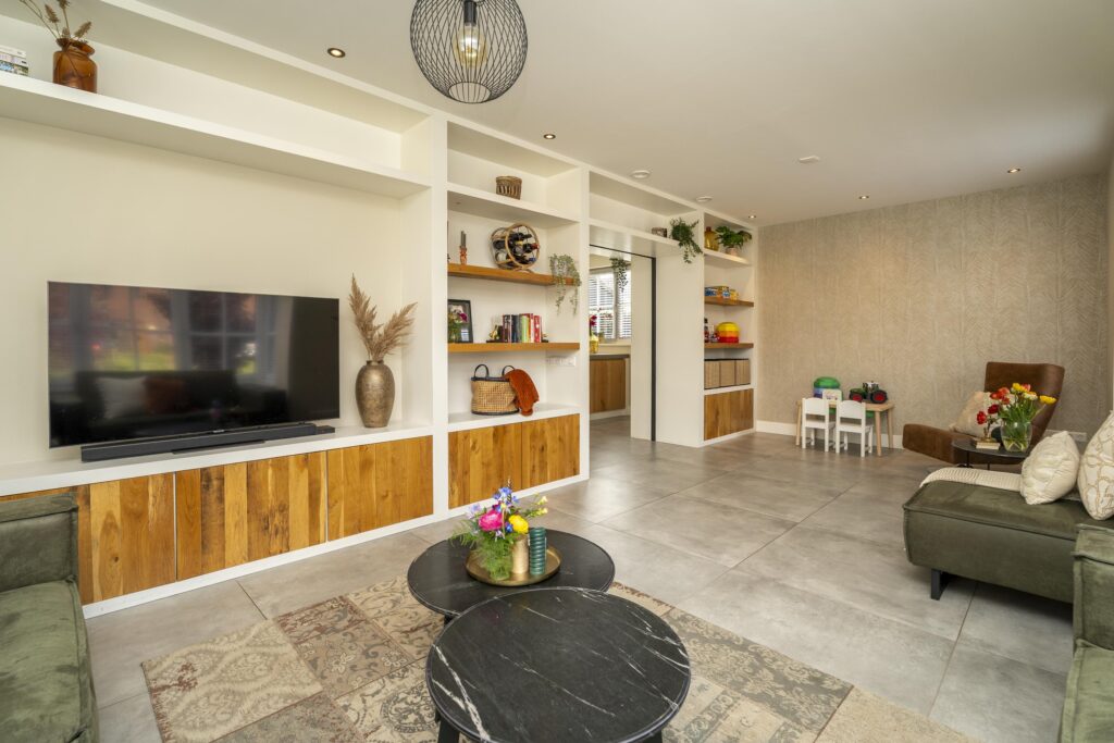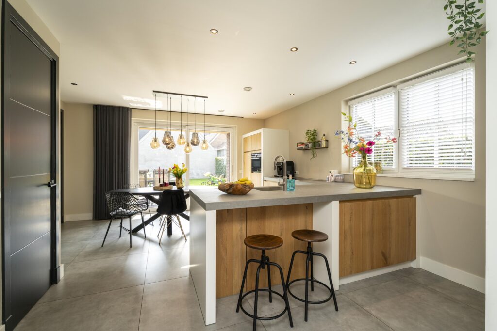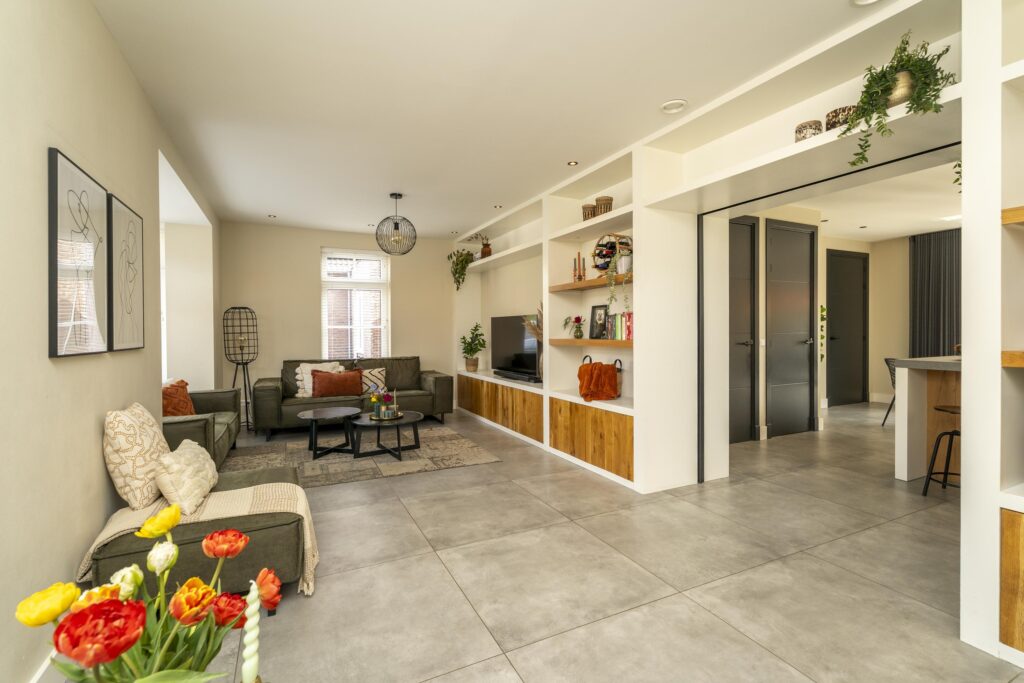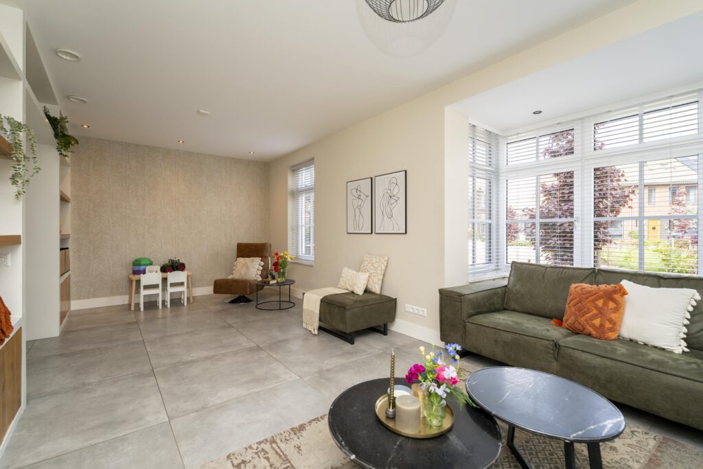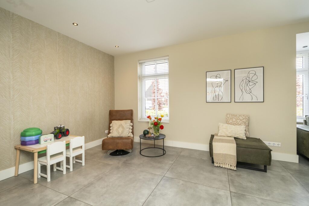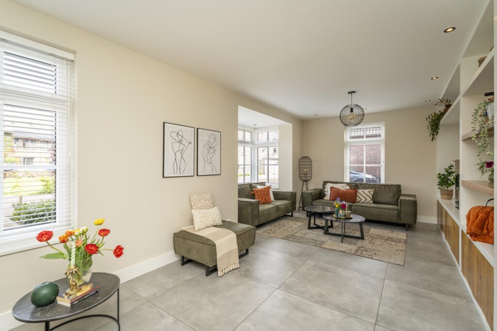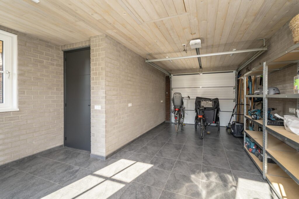 Via de entree betreedt u de woning en komt u binnen in de hal met meterkast, trapopgang en toegang tot de leefruimte. De hal is strak afgewerkt en vormt een mooie verbinding tussen de verschillende vertrekken. Vanuit de hal loopt u via de keuken naar de ruime en lichte woonkamer. Deze sfeervolle leefruimte is voorzien van maatwerk kastenwanden die zorgen voor zowel karakter als praktische opbergruimte. In de kastenwand zijn prachtige schuifdeuren aanwezig om de woonkamer van de keuken te kunnen scheiden. Grote raampartijen zorgen voor een prettige lichtinval en een fijne verbinding met de tuin. De woonkamer staat in open verbinding met de royale woonkeuken aan de achterzijde van de woning. De keuken is modern en strak uitgevoerd en voorzien van een eiland met een barretje. De hoogwaardige inbouwapparatuur bestaat uit een inductiekookplaat met geïntegreerde afzuiging, een (stoom)oven, koelkast, vaatwasser en een RVS spoelbak met Quooker. Ook vindt u in de keuken een ruime vaste kast. Middels een schuifpui in de keuken heeft u direct toegang tot het terras onder de overkapping, wat het binnen- en buitenleven naadloos met elkaar verbindt. De gehele begane grond is afgewerkt met een moderne tegelvloer voorzien van comfortabele vloerverwarming met koelfunctie. Zowel de wanden als plafonds zijn strak gestuct, wat zorgt voor een hoogwaardige en instapklare uitstraling. De keuken geeft toegang tot een portaal waar de toiletruimte, inpandige garage en een bergkast zich bevinden. De toiletruimte is modern uitgevoerd met een hangend toilet en een fonteintje. De royale garage biedt volop bergruimte en is voorzien van elektra, water en vloerverwarming. Ook heeft de garage een elektrische garagedeur en een vliering met nog meer handige bergruimte. Een ideale basis voor wie op zoek is naar modern woonplezier zonder concessies.