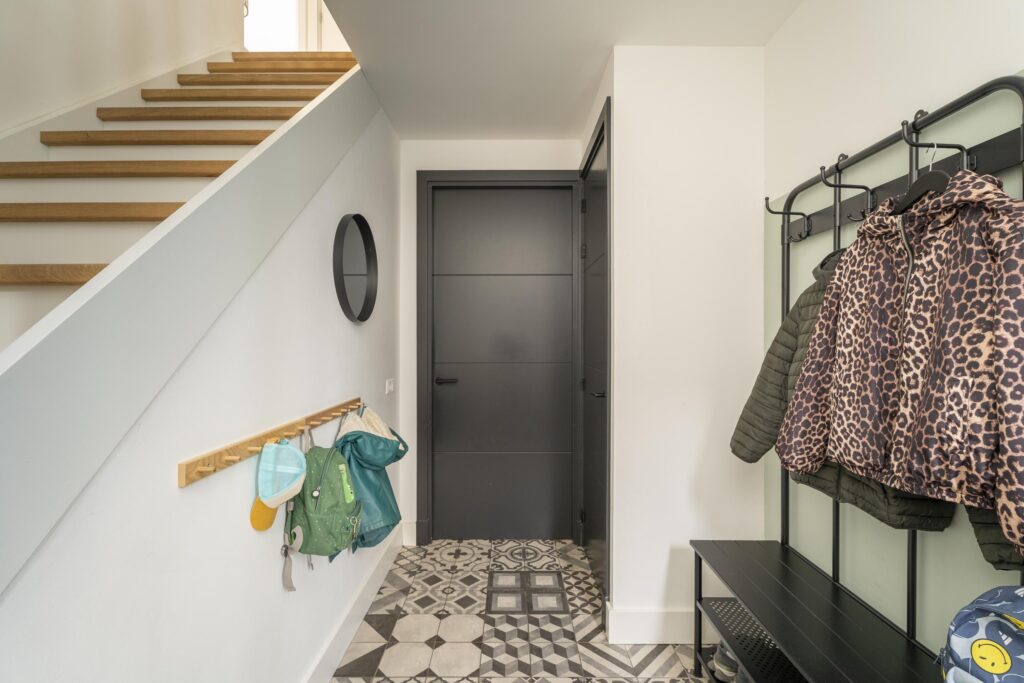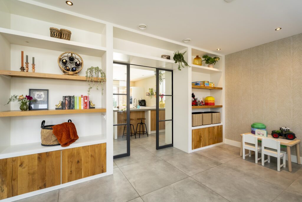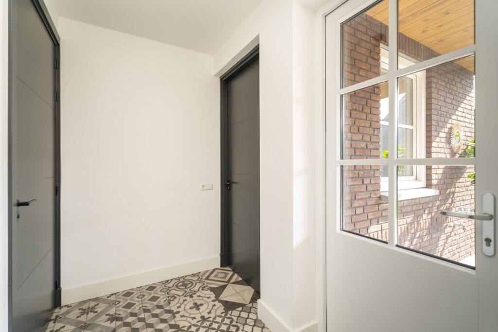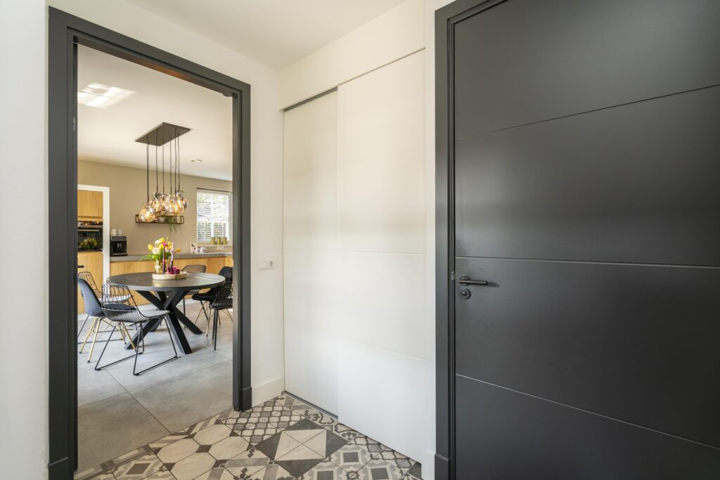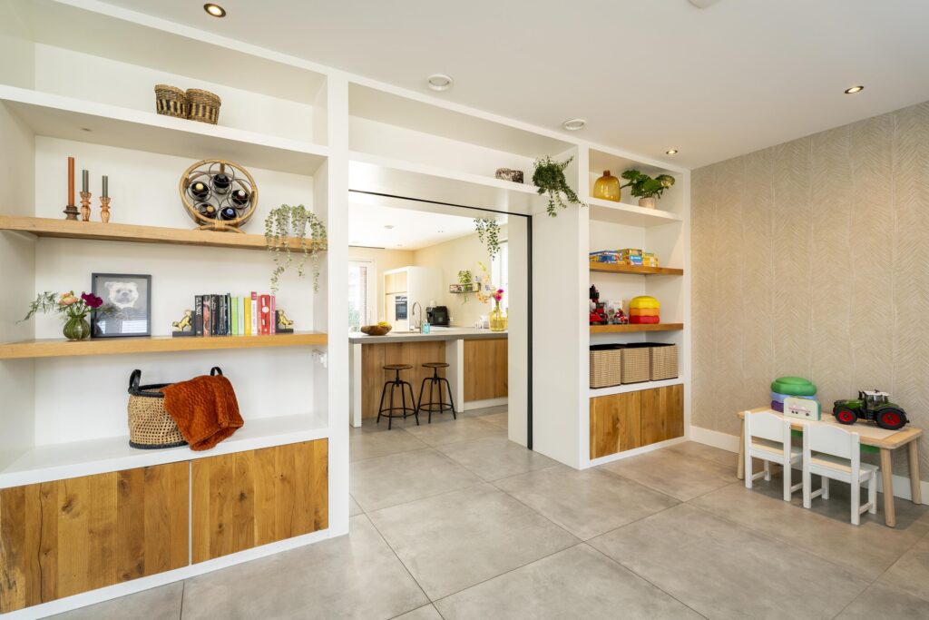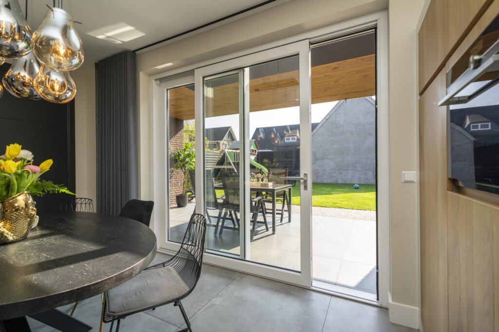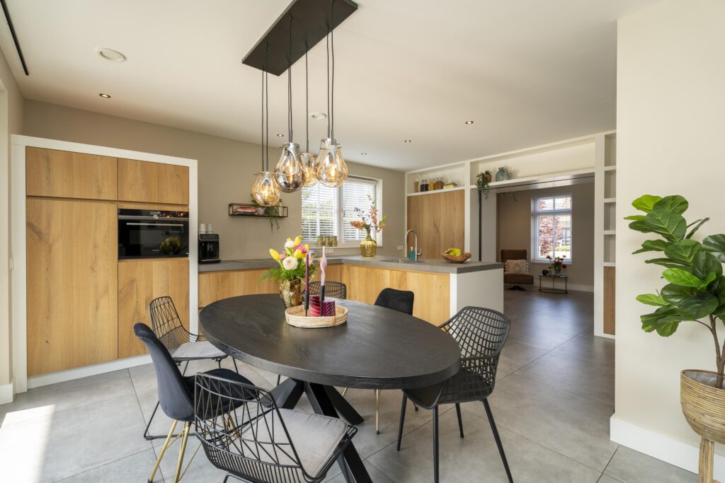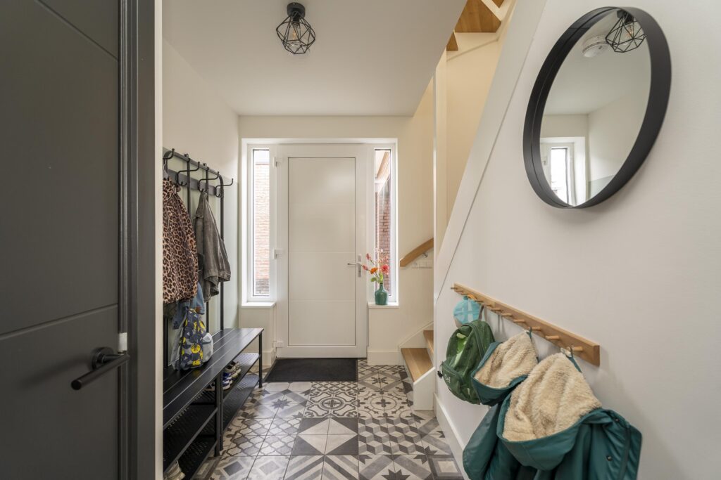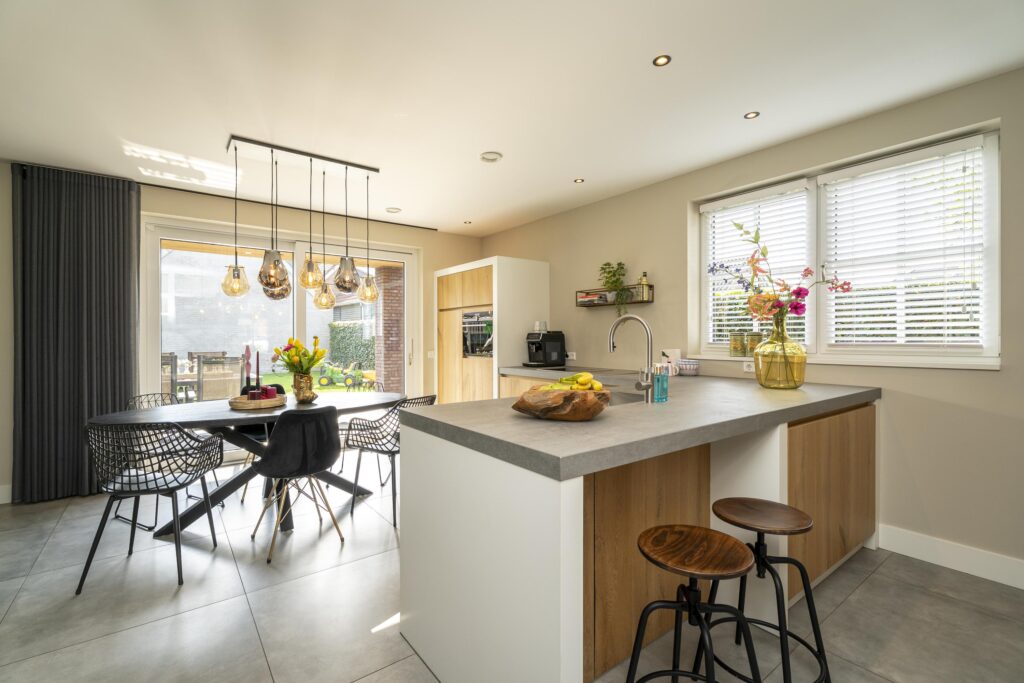 Via de entree betreedt u de woning en komt u binnen in de hal met meterkast, trapopgang en toegang tot de leefruimte. De hal is strak afgewerkt en vormt een mooie verbinding tussen de verschillende vertrekken. Vanuit de hal loopt u via de keuken naar de ruime en lichte woonkamer. Deze sfeervolle leefruimte is voorzien van maatwerk kastenwanden die zorgen voor zowel karakter als praktische opbergruimte. In de kastenwand zijn prachtige schuifdeuren aanwezig om de woonkamer van de keuken te kunnen scheiden. Grote raampartijen zorgen voor een prettige lichtinval en een fijne verbinding met de tuin. De woonkamer staat in open verbinding met de royale woonkeuken aan de achterzijde van de woning. De keuken is modern en strak uitgevoerd en voorzien van een eiland met een barretje. De hoogwaardige inbouwapparatuur bestaat uit een inductiekookplaat met geïntegreerde afzuiging, een (stoom)oven, koelkast, vaatwasser en een RVS spoelbak met Quooker. Ook vindt u in de keuken een ruime vaste kast. Middels een schuifpui in de keuken heeft u direct toegang tot het terras onder de overkapping, wat het binnen- en buitenleven naadloos met elkaar verbindt. De gehele begane grond is afgewerkt met een moderne tegelvloer voorzien van comfortabele vloerverwarming met koelfunctie. Zowel de wanden als plafonds zijn strak gestuct, wat zorgt voor een hoogwaardige en instapklare uitstraling. De keuken geeft toegang tot een portaal waar de toiletruimte, inpandige garage en een bergkast zich bevinden. De toiletruimte is modern uitgevoerd met een hangend toilet en een fonteintje. De royale garage biedt volop bergruimte en is voorzien van elektra, water en vloerverwarming. Ook heeft de garage een elektrische garagedeur en een vliering met nog meer handige bergruimte. Een ideale basis voor wie op zoek is naar modern woonplezier zonder concessies.