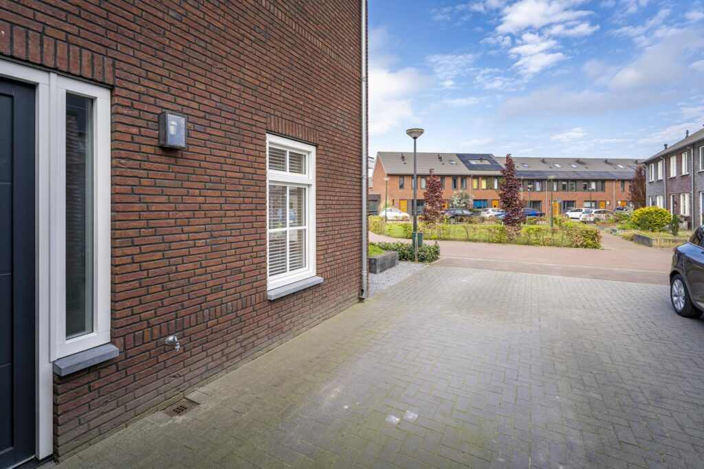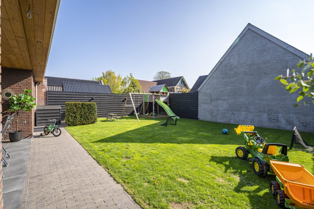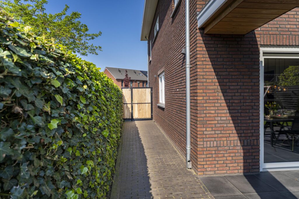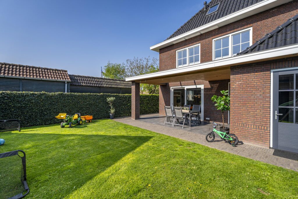 De voortuin, stijlvol aangelegd met sierbestrating en een plantenborder, biedt een verzorgde entree naar de woning. De woning is aan de voorzijde aan een groen pleintje gelegen. De ruime oprit beschikt over plek voor twee auto’s en geeft direct toegang tot de woning en de garage. De ruime achtertuin vormt een opvallend onderdeel van de woning. Dankzij de fijne en vrije ligging op het oosten geniet u hier heerlijk van de zon of juist schaduw. De achtertuin is prachtig aangelegd met sierbestrating, gazon en een mooie groene haag. Er is volop ruimte voor een speelgedeelte én voor gezellig samenzijn op het terras onder de ruime overkapping. De overkapping met inbouwspots en een lichtstraat is verweven met de woning en vormt zo een prachtig geheel. De tuin is via de zijkant bereikbaar vanaf de voorzijde van de woning.