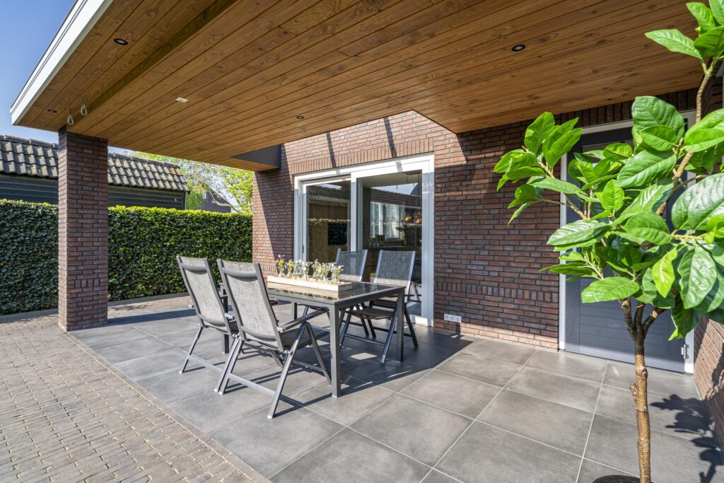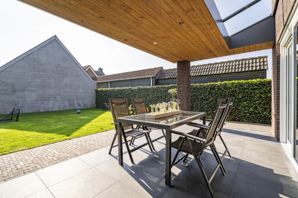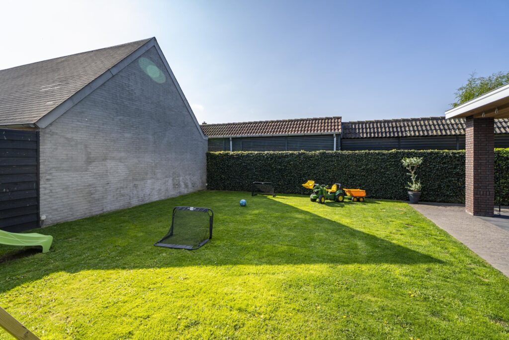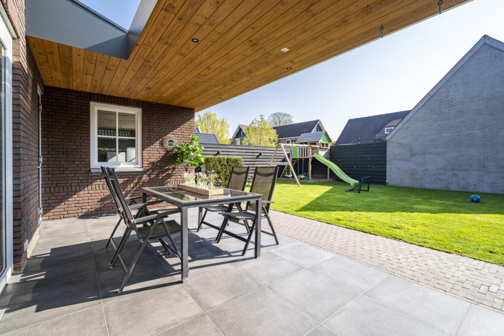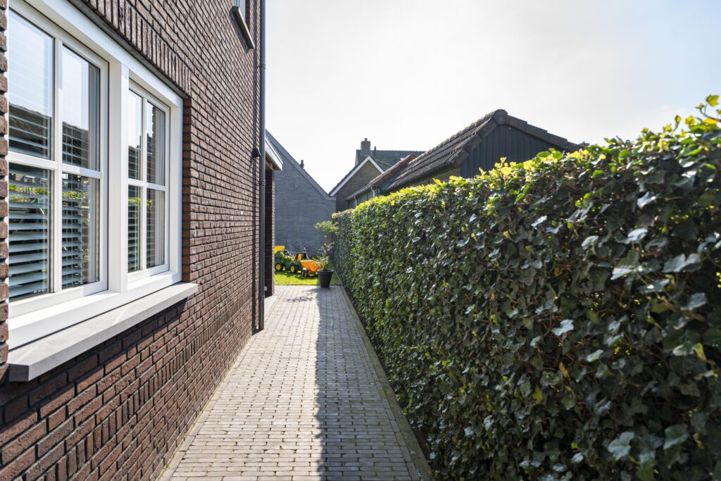 De voortuin, stijlvol aangelegd met sierbestrating en een plantenborder, biedt een verzorgde entree naar de woning. De woning is aan de voorzijde aan een groen pleintje gelegen. De ruime oprit beschikt over plek voor twee auto’s en geeft direct toegang tot de woning en de garage. De ruime achtertuin vormt een opvallend onderdeel van de woning. Dankzij de fijne en vrije ligging op het oosten geniet u hier heerlijk van de zon of juist schaduw. De achtertuin is prachtig aangelegd met sierbestrating, gazon en een mooie groene haag. Er is volop ruimte voor een speelgedeelte én voor gezellig samenzijn op het terras onder de ruime overkapping. De overkapping met inbouwspots en een lichtstraat is verweven met de woning en vormt zo een prachtig geheel. De tuin is via de zijkant bereikbaar vanaf de voorzijde van de woning.