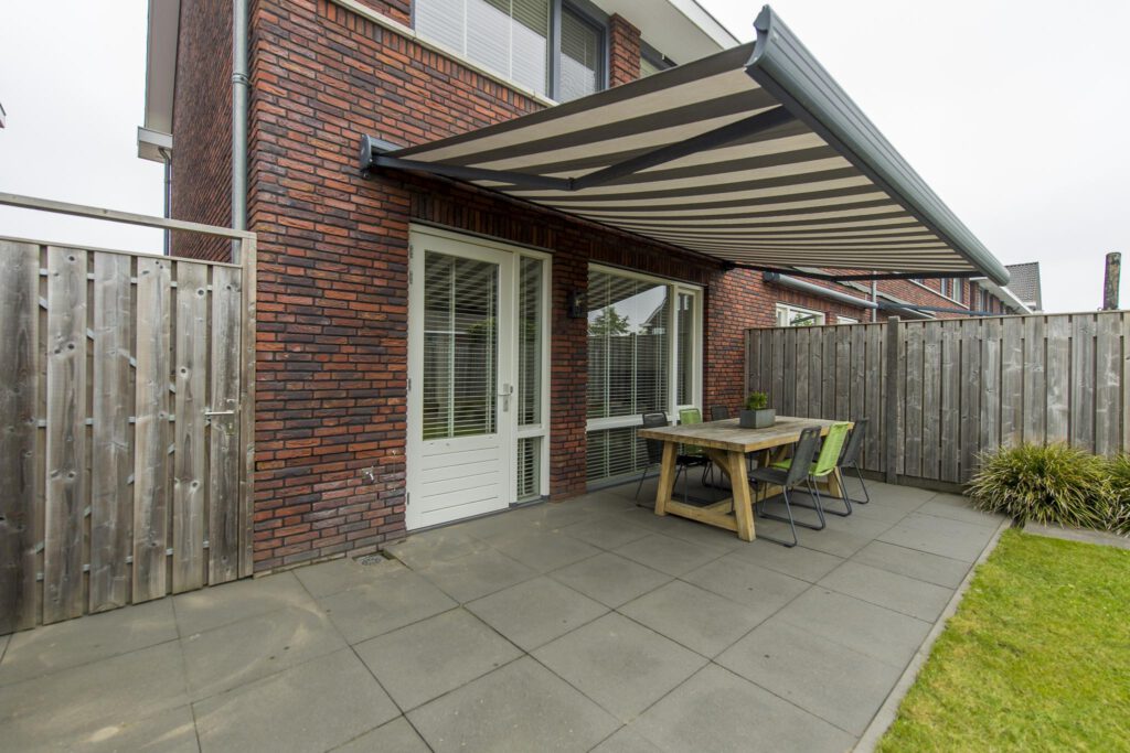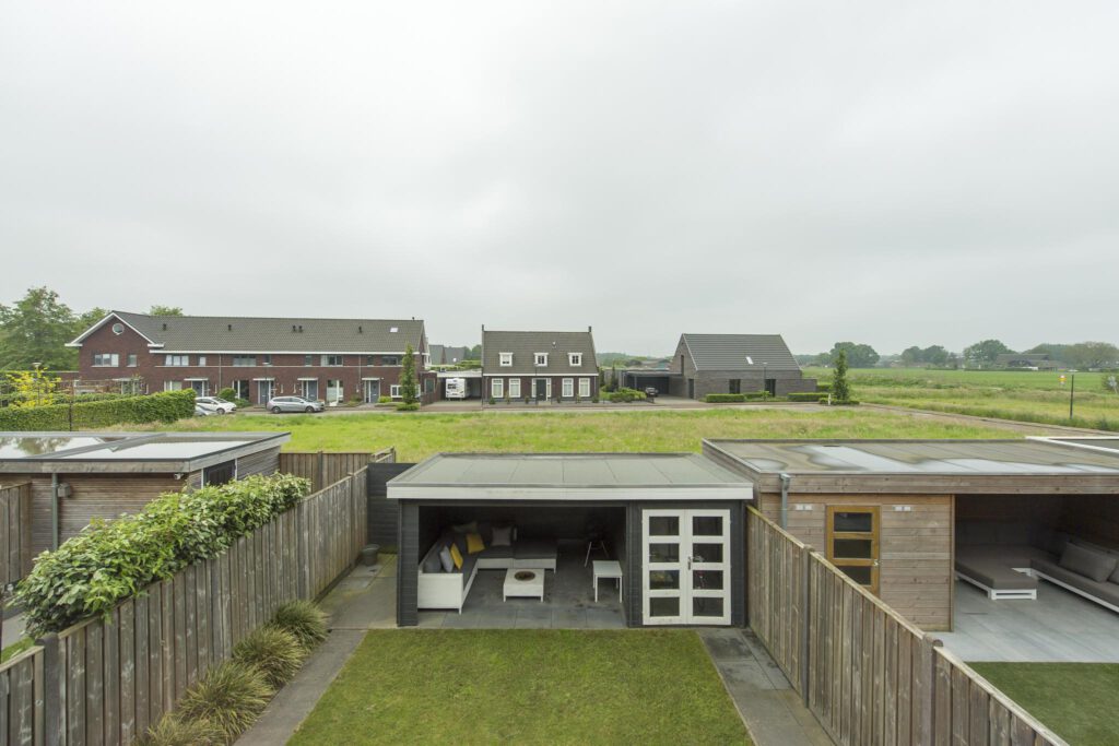De woning beschikt over zowel een voor- als achtertuin. De fraai aangelegde achtertuin is gelegen op het zonnige zuiden. De tuin is voorzien van sierbestrating, gazon en plantenborders. Aan de woning vindt u daarnaast een zonnescherm over nagenoeg de volledige breedte van de woning. Achter op het perceel staat de houten berging met daaraan een ruime sfeervolle overkapping. Aan de voorzijde van de tuin vindt u daarnaast de achterom.