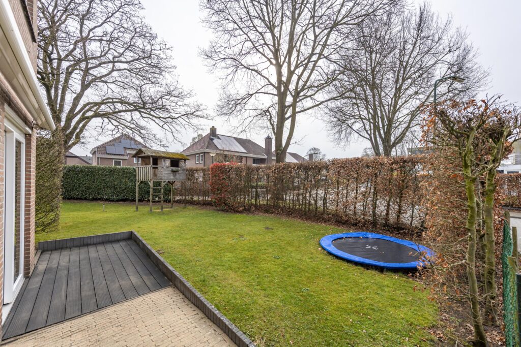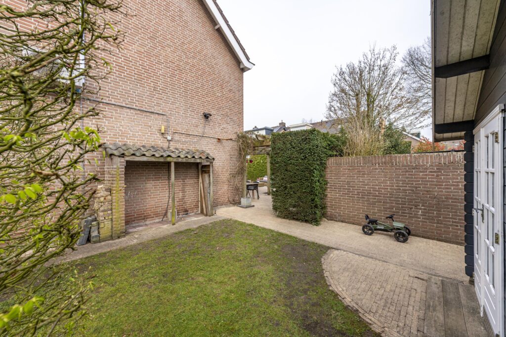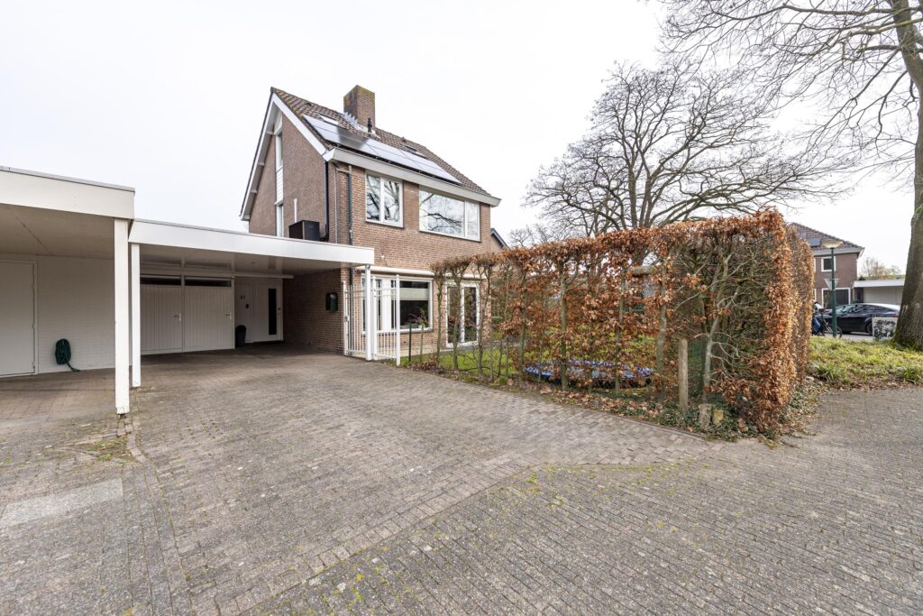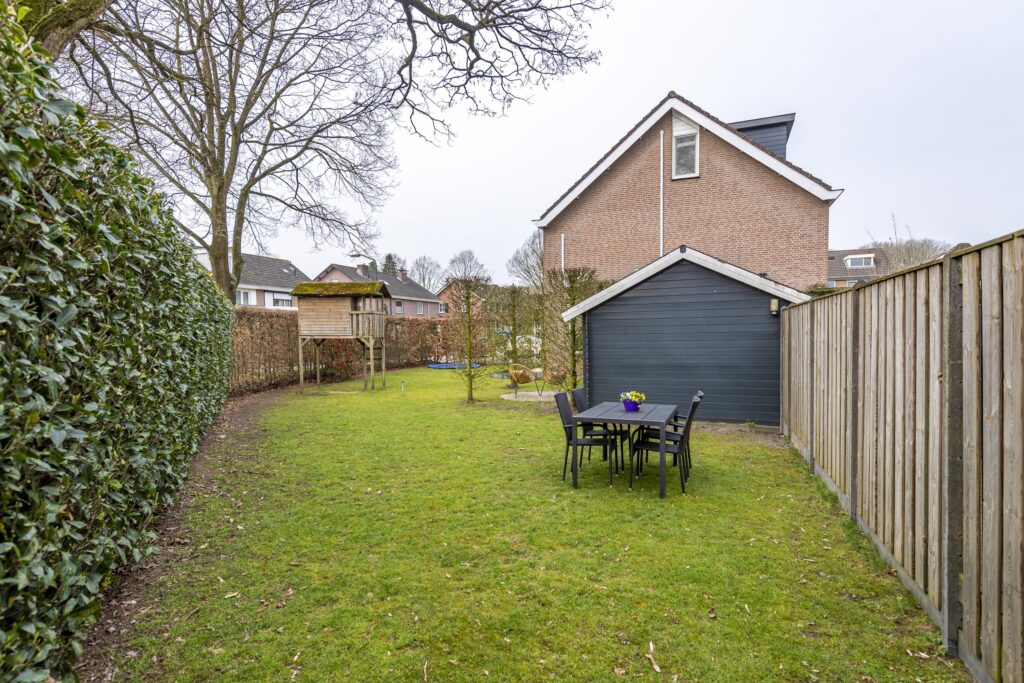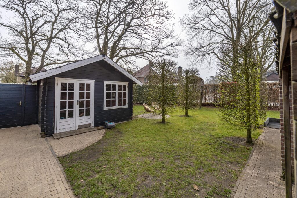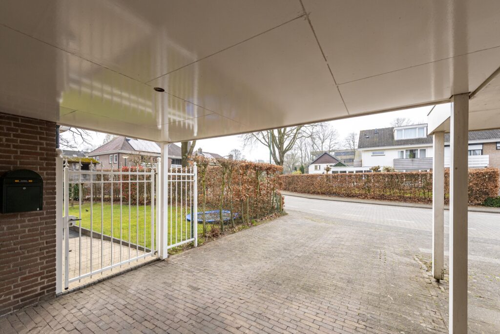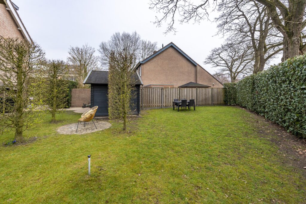 De woning is voorzien van een zeer ruime tuin rondom de woning, waardoor er altijd een plekje in de zon te vinden is. De tuin is tevens omgeven door groene hagen wat zorgt voor veel privacy. De tuin is voorzien van een houten chalet, gazon, plantenborders en meerdere terrassen met sierbestrating. Een van de terrassen is voorzien van een overkapping. Vanuit de tuin heeft u op verschillende plaatsen toegang tot de woning. Door de vele raampartijen heeft u, vanuit de woning, een prachtig uitzicht op de tuin. Via een poort aan de voorzijde bereikt u de oprit. Deze oprit is voorzien van een carport, biedt plaats aan meerdere auto’s en geeft toegang tot zowel de voordeur als de berging. De berging biedt veel bergruimte, heeft een grijze gietvloer en is voorzien van elektra.