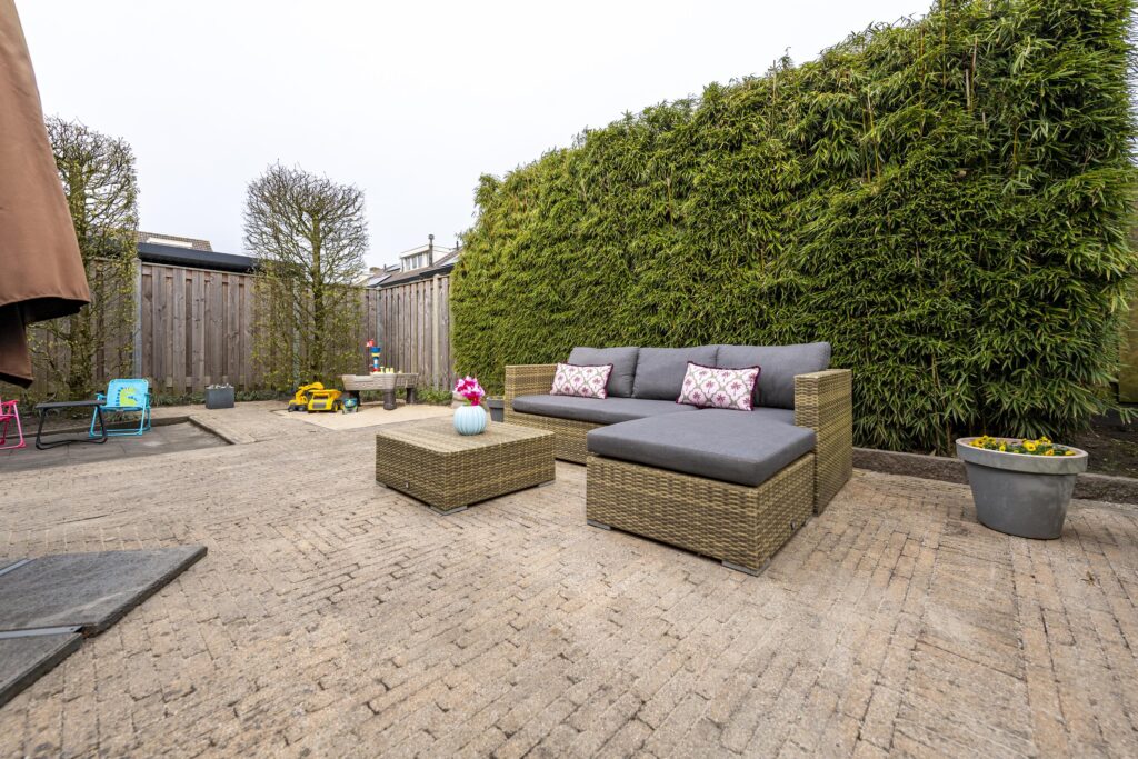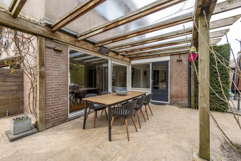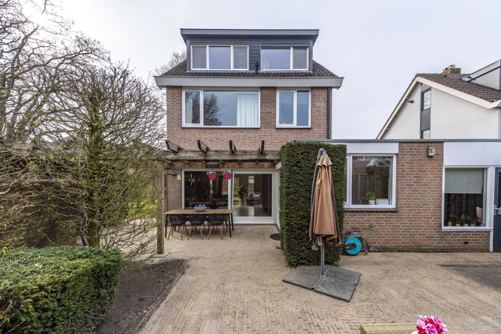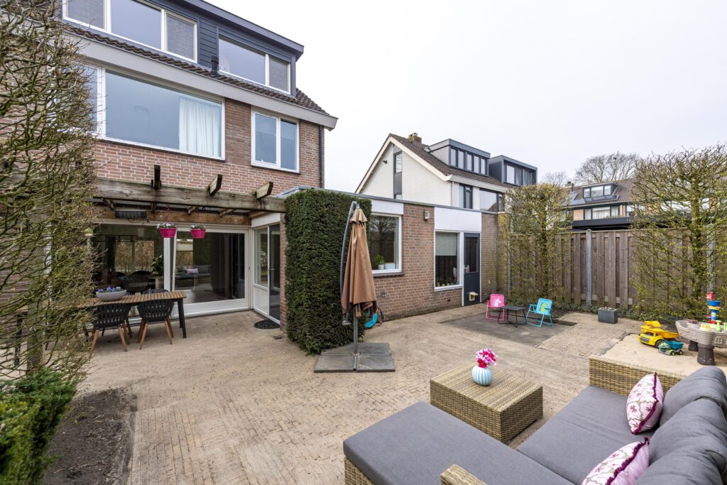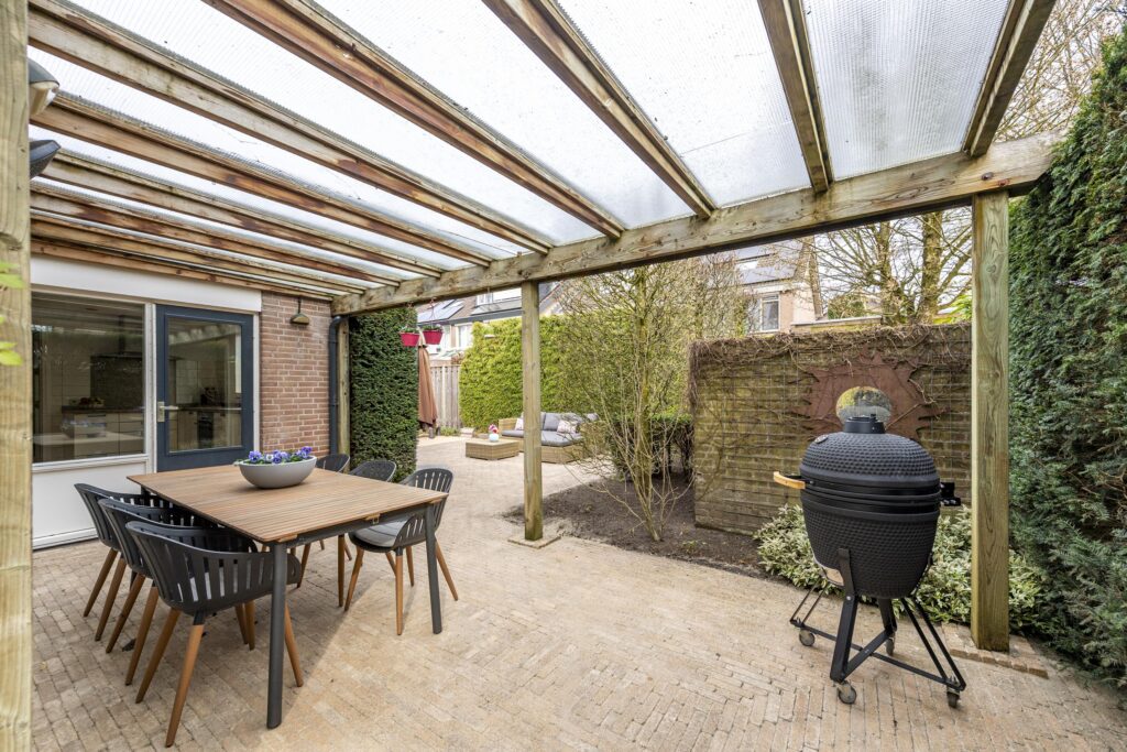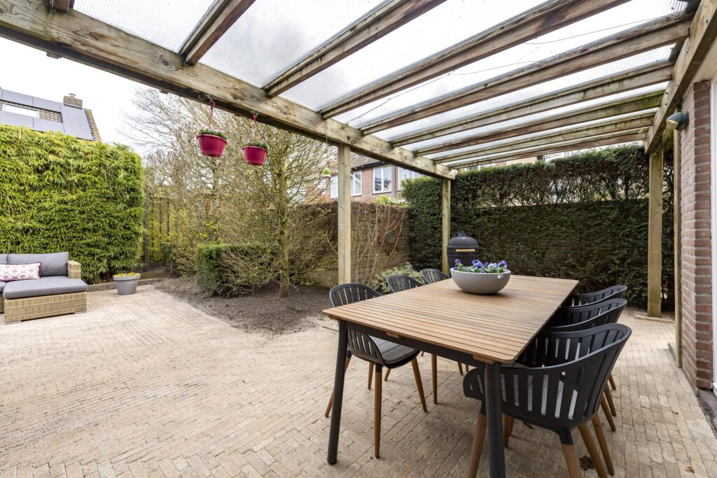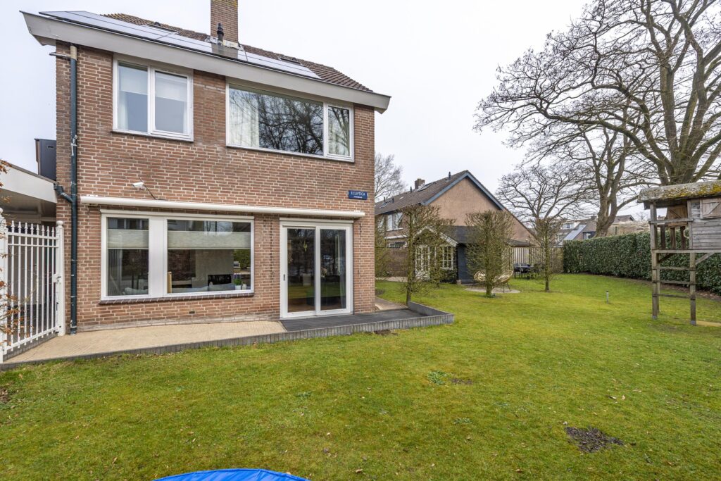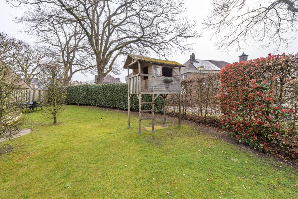 De woning is voorzien van een zeer ruime tuin rondom de woning, waardoor er altijd een plekje in de zon te vinden is. De tuin is tevens omgeven door groene hagen wat zorgt voor veel privacy. De tuin is voorzien van een houten chalet, gazon, plantenborders en meerdere terrassen met sierbestrating. Een van de terrassen is voorzien van een overkapping. Vanuit de tuin heeft u op verschillende plaatsen toegang tot de woning. Door de vele raampartijen heeft u, vanuit de woning, een prachtig uitzicht op de tuin. Via een poort aan de voorzijde bereikt u de oprit. Deze oprit is voorzien van een carport, biedt plaats aan meerdere auto’s en geeft toegang tot zowel de voordeur als de berging. De berging biedt veel bergruimte, heeft een grijze gietvloer en is voorzien van elektra.