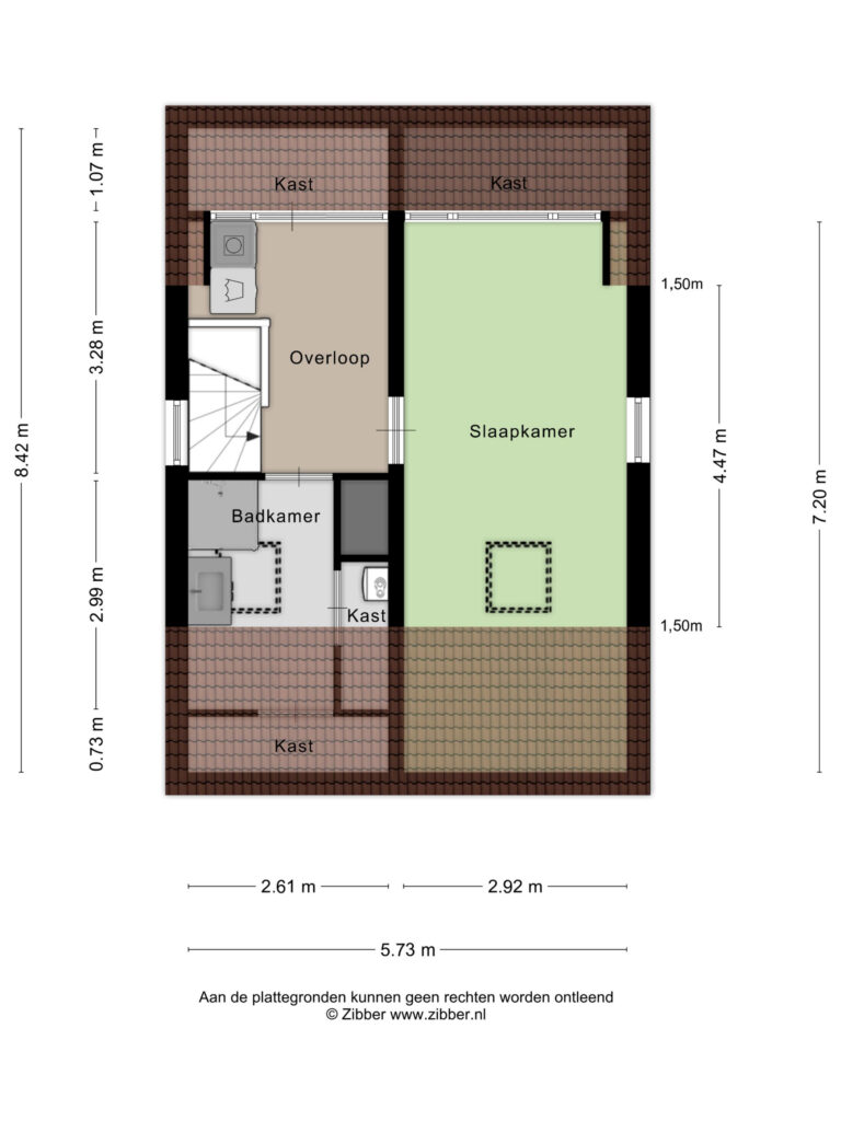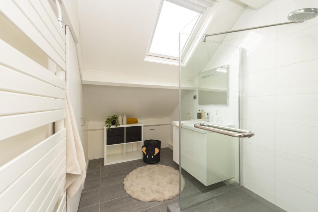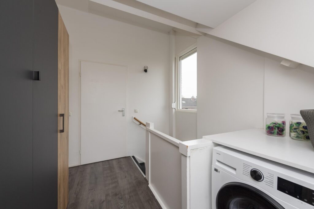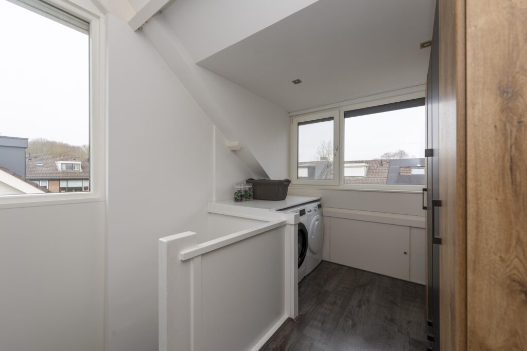 De tweede verdieping is verdeeld in een lichte voorzolder, badkamer en grote slaapkamer. Op de voorzolder vindt u de aansluitingen voor de wasapparatuur. De badkamer is deels betegeld en heeft een inloopdouche, wastafel in meubel en een designradiator. Via een deur heeft u vanuit de badkamer toegang tot een bergruimte. De badkamer heeft daglicht middels een dakraam. De hele verdieping is netjes afgewerkt met een laminaatvloer, hoge plinten, strak stucwerk op de wanden en heeft aan de achterzijde over de gehele breedte een mooie dakkapel. Deze is uitgevoerd met horren en elektrische, geïntegreerde rolluiken. De dakkapel in de grote slaapkamer zorgt voor veel daglicht net als het zij- en dakraam. Daarnaast is ook deze slaapkamer voorzien van een airconditioning. De slaapkamer, overloop en badkamer hebben opbergruimtes.