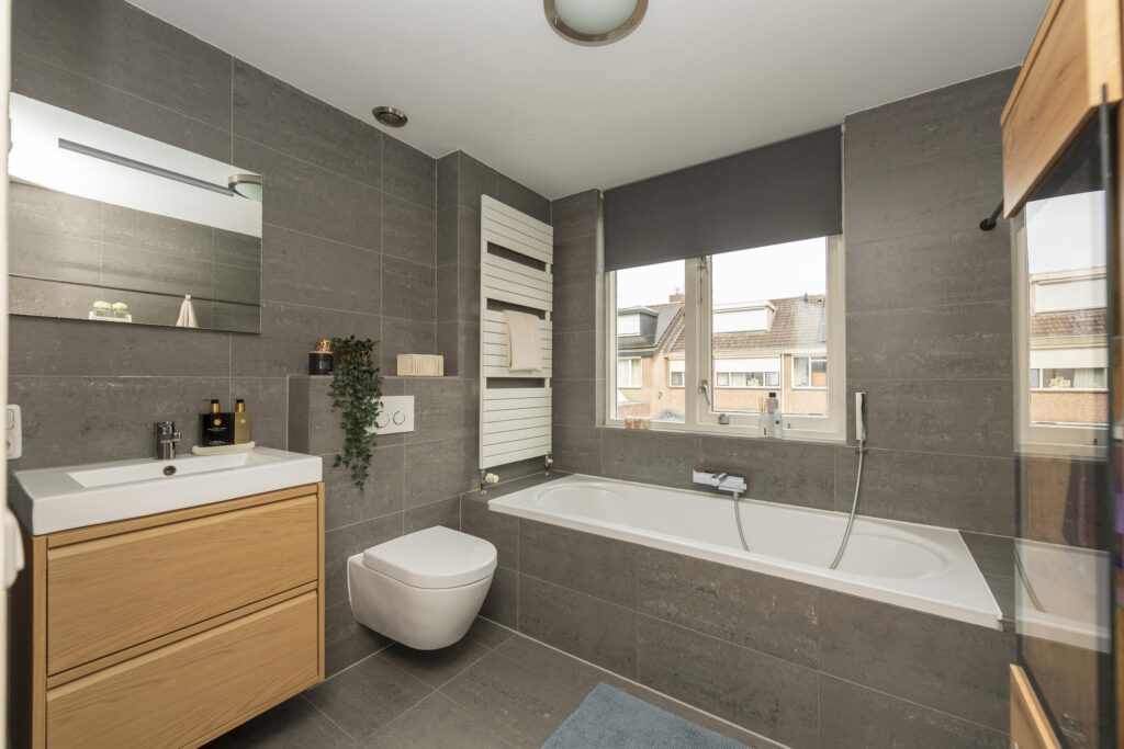 De overloop op de eerste verdieping geeft toegang tot drie slaapkamers en een badkamer. Twee slaapkamers zijn gelegen aan de voorzijde van de woning en één aan de achterzijde. Alle slaapkamers zijn netjes afgewerkt met een laminaatvloer, hoge plinten, stucwerk op de wanden, stucwerk op de plafonds en hebben horren. Twee van de slaapkamers zijn daarnaast voorzien van airconditioning. De luxe en moderne badkamer is volledig betegeld en voorzien van een ligbad, hangend toilet, designkranen en -radiator, wastafel in meubel en elektrische vloerverwarming.