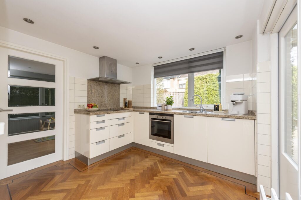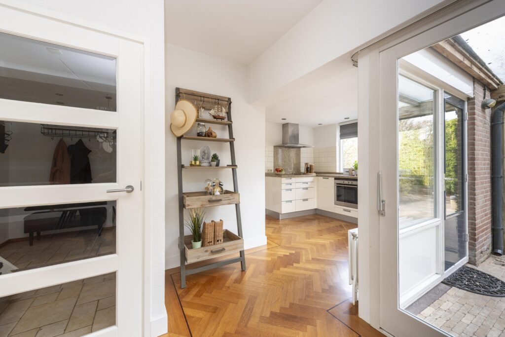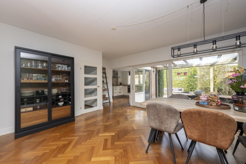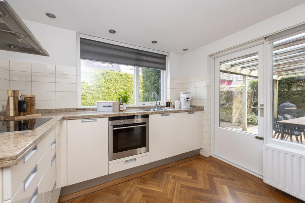 De hal/entree geeft toegang tot de meterkast, een toiletruimte en de woonkamer. Het toiletruimte is betegeld en voorzien van een fonteintje. De woonkamer is opgesplitst in een zit- en eetgedeelte en is afgewerkt met een parketvloer. Beide gedeelten zijn met een speels trapje (splitlevel living) van elkaar gescheiden. Het zitgedeelte is voorzien van een gashaard. Aan de voorzijde is tevens elektrische zonwering aanwezig. De keuken is opgesteld in een L-vormig keukenblok en is voorzien van verschillende inbouwapparatuur, te weten: een inductiekookplaat, RVS afzuigkap, combi-oven, vaatwasser (2024), close-in boiler en een RVS spoelbak. Via de keuken bereikt u de multifunctionele ruimte welke momenteel in gebruik is als speelruimte. De ruimte is afgewerkt met een mooie laminaatvloer, strak stucwerk op de wanden en inbouwspots in het plafond. Vanuit deze ruimte heeft u zowel toegang tot de achtertuin als de inpandige berging. De inpandige berging is voorzien van een radiator aansluiting is tevens vanaf de oprit bereikbaar.