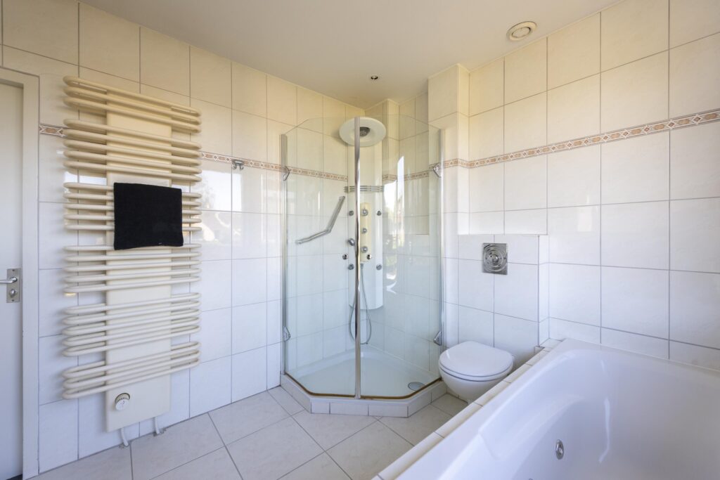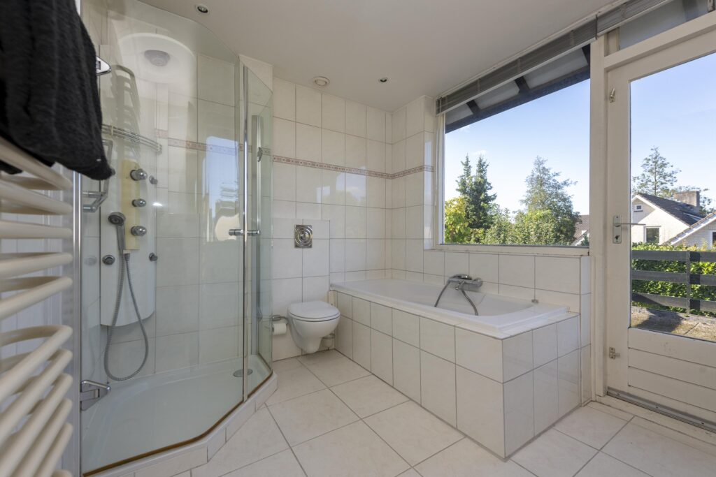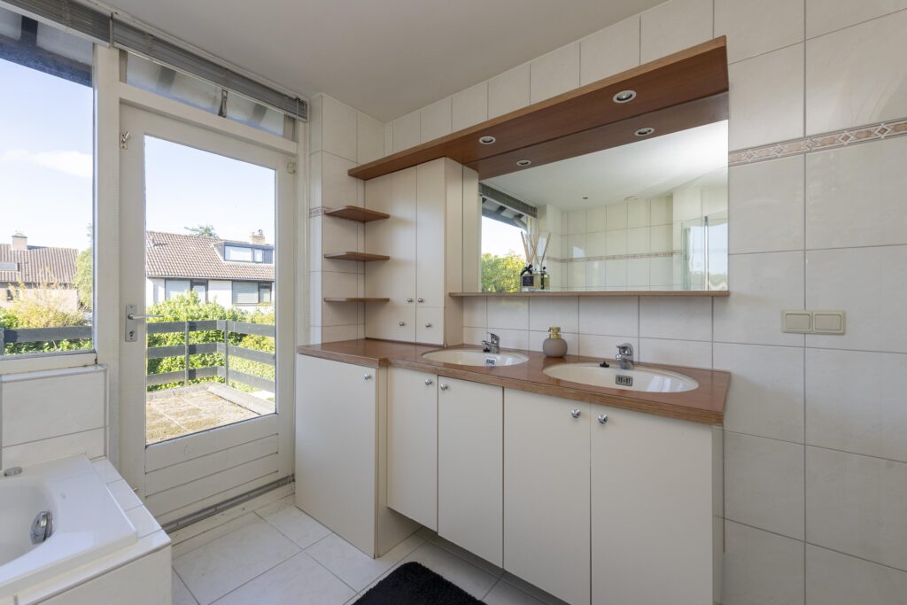 Ook de eerste verdieping biedt volop ruimte. Vanaf de overloop zijn drie goed bemeten slaapkamers bereikbaar. Elke slaapkamer is prettig licht en biedt genoeg plek voor een volledige inrichting, ideaal voor kinderen, gasten of als werkruimte. Alle slaapkamers zijn afgewerkt met vloerbedekking. Een van de slaapkamers aan de voorzijde geeft daarnaast toegang tot een balkon. De badkamer is compleet uitgevoerd met ligbad, douche, dubbele wastafel in meubel en een toilet. Vanuit de badkamer heeft u toegang tot een royaal dakterras waar u in alle rust heerlijk kunt genieten. Dit geeft de verdieping een extra luxe en open gevoel.