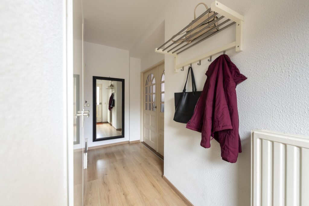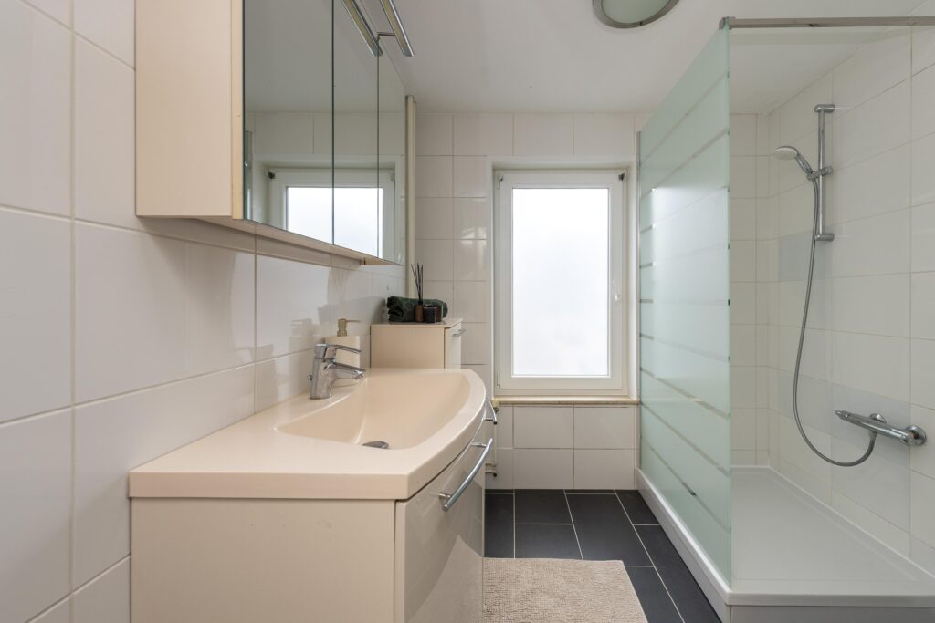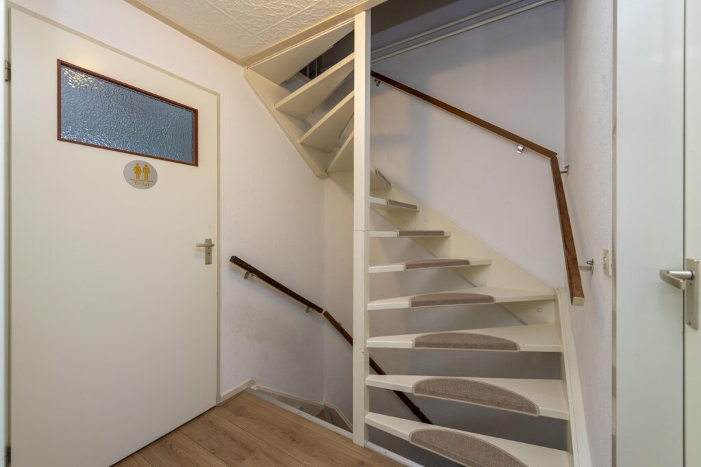 Via de trap bereikt u de ruime overloop, die toegang biedt tot drie slaapkamers en de badkamer. Aan de achterzijde liggen twee slaapkamers en aan de voorzijde bevindt zich de derde slaapkamer. Alle drie de slaapkamers zijn afgewerkt met een laminaatvloer, wat zorgt voor een warme en verzorgde uitstraling. Aangrenzend vindt u de badkamer, praktisch ingericht met een douche, toilet en een wastafel. Dankzij het aanwezige raam beschikt de badkamer over natuurlijke ventilatie. De eerste verdieping biedt hiermee een comfortabele en functionele indeling.