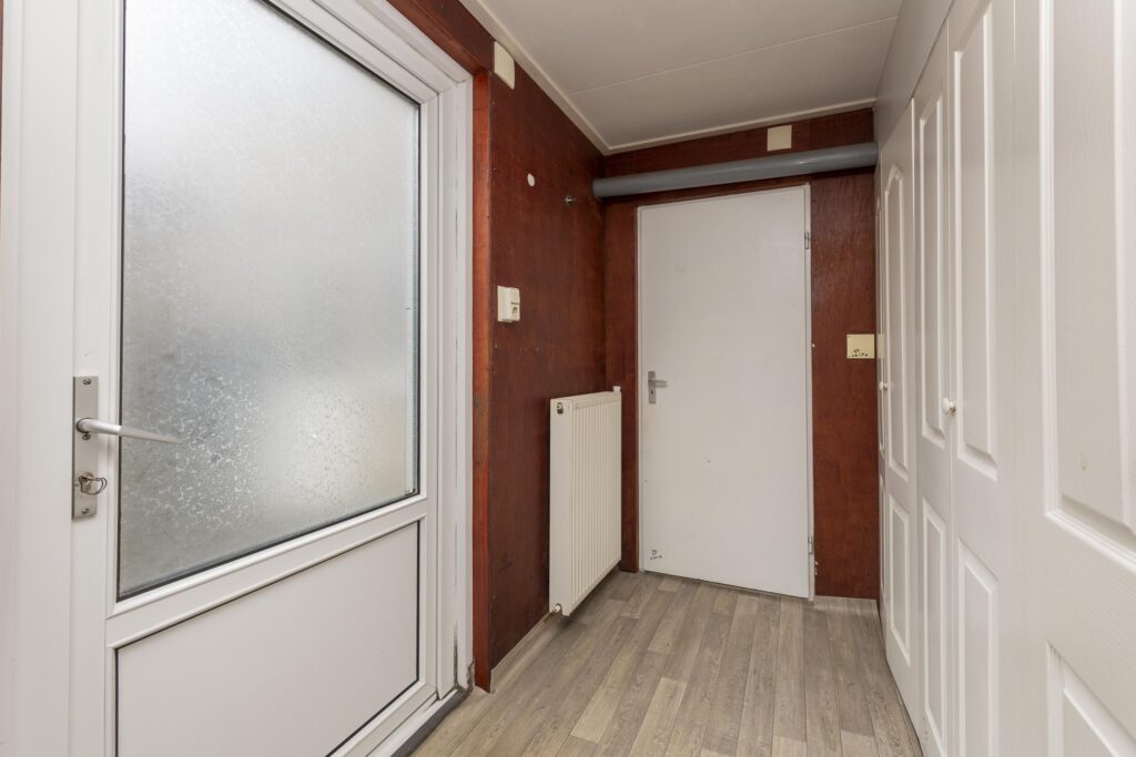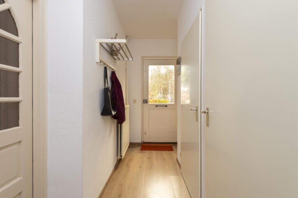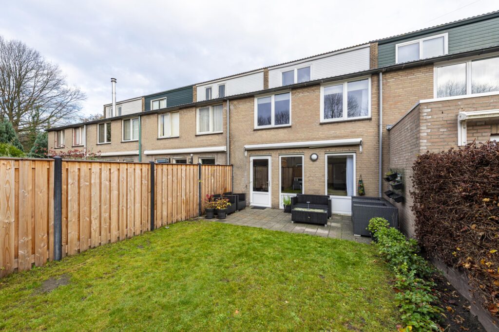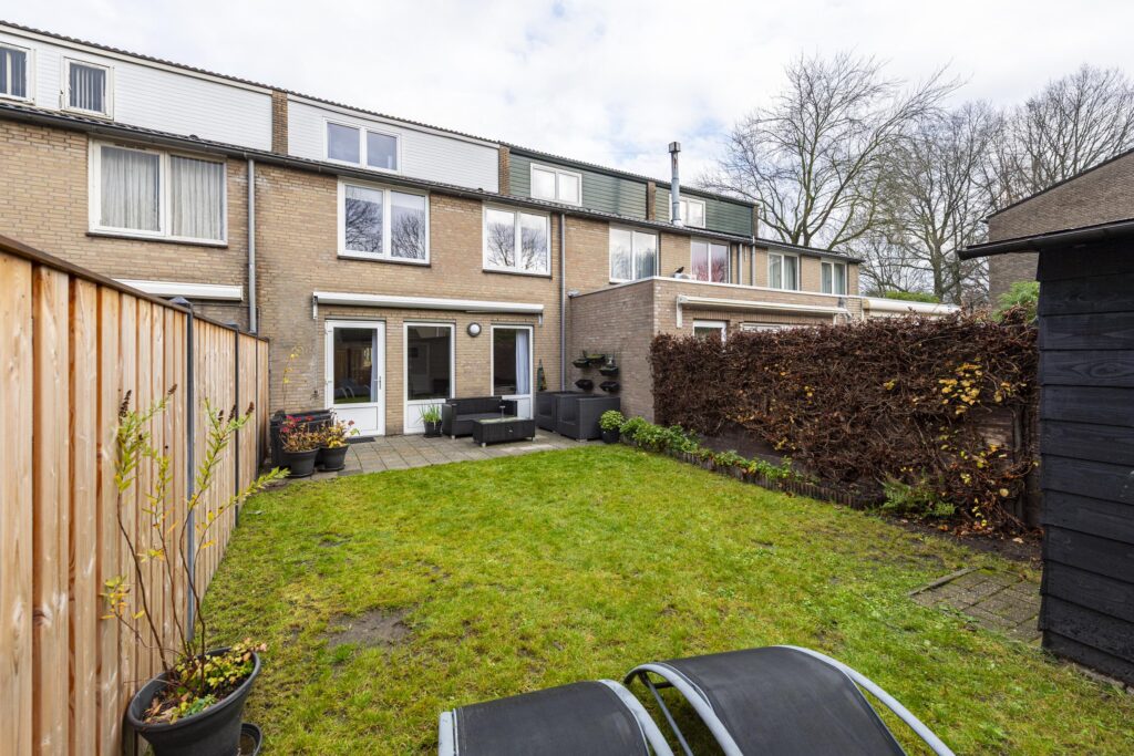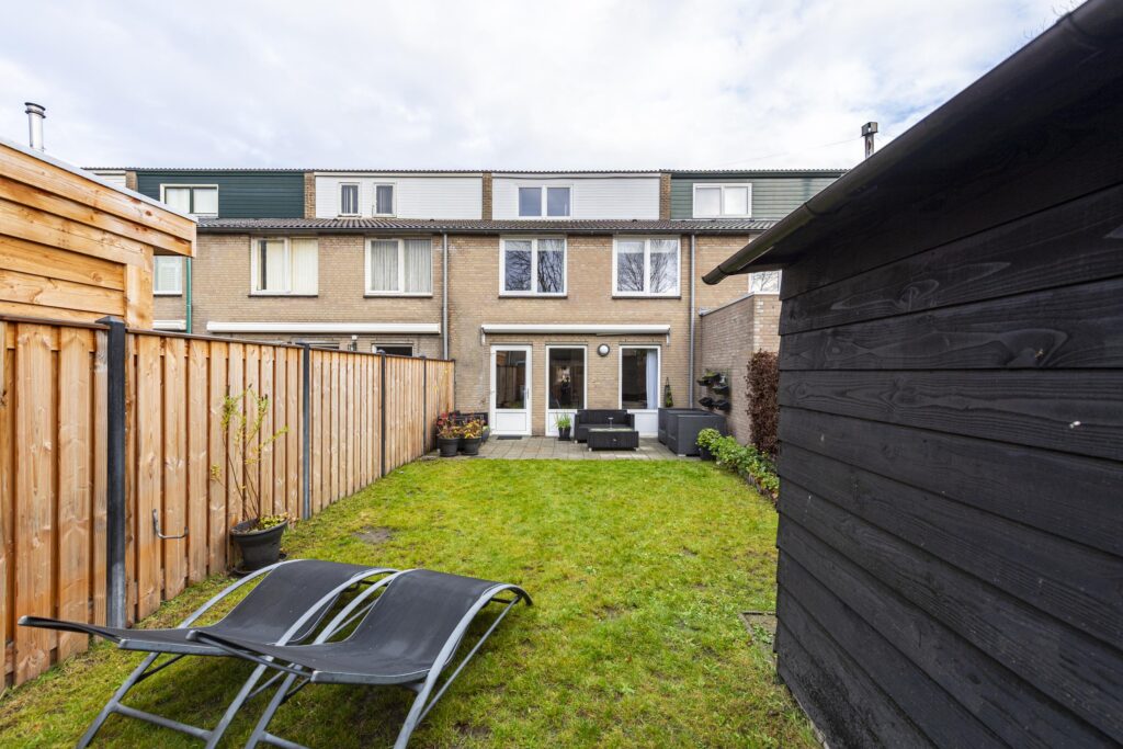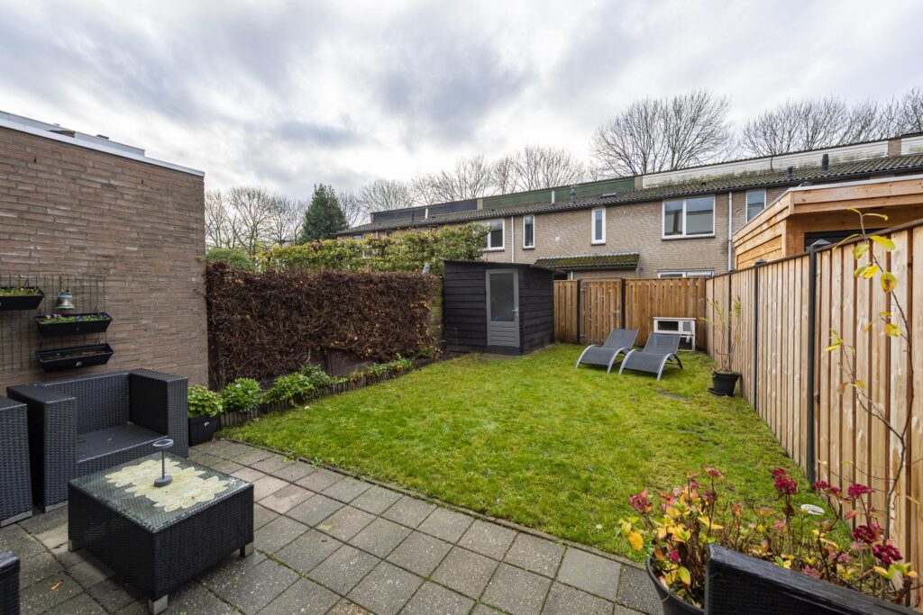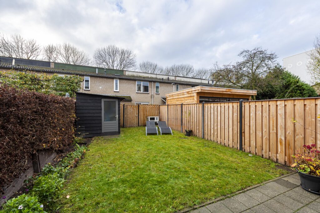 Wanneer u via de oprit de woning nadert, valt direct op dat u hier kunt parkeren op eigen terrein. De volledig bestraatte oprit biedt plaats voor de auto en vormt een nette en onderhoudsvriendelijke entree van de woning. Vanuit de woning loopt u door naar de zonnige achtertuin op het zuiden, waar u de hele dag door van de zon kunt genieten. De tuin is praktisch ingedeeld met een royaal terras direct aan de woning, een groot gazon en groene borders die zorgen voor een frisse en ruime sfeer. Achterin vindt u de achterom en een handige houten berging, ideaal voor tuinspullen, fietsen of extra opslag. De achterom komt uit op een breed pad waardoor u de achtertuin eenvoudig kunt bereiken. De ruime opzet biedt volop mogelijkheden voor ontspanning, spelen of het creëren van een gezellige loungehoek.