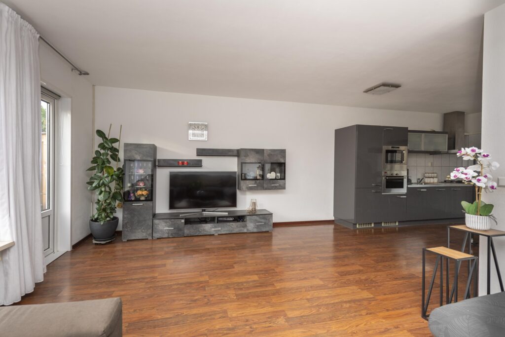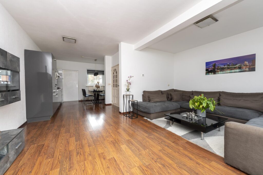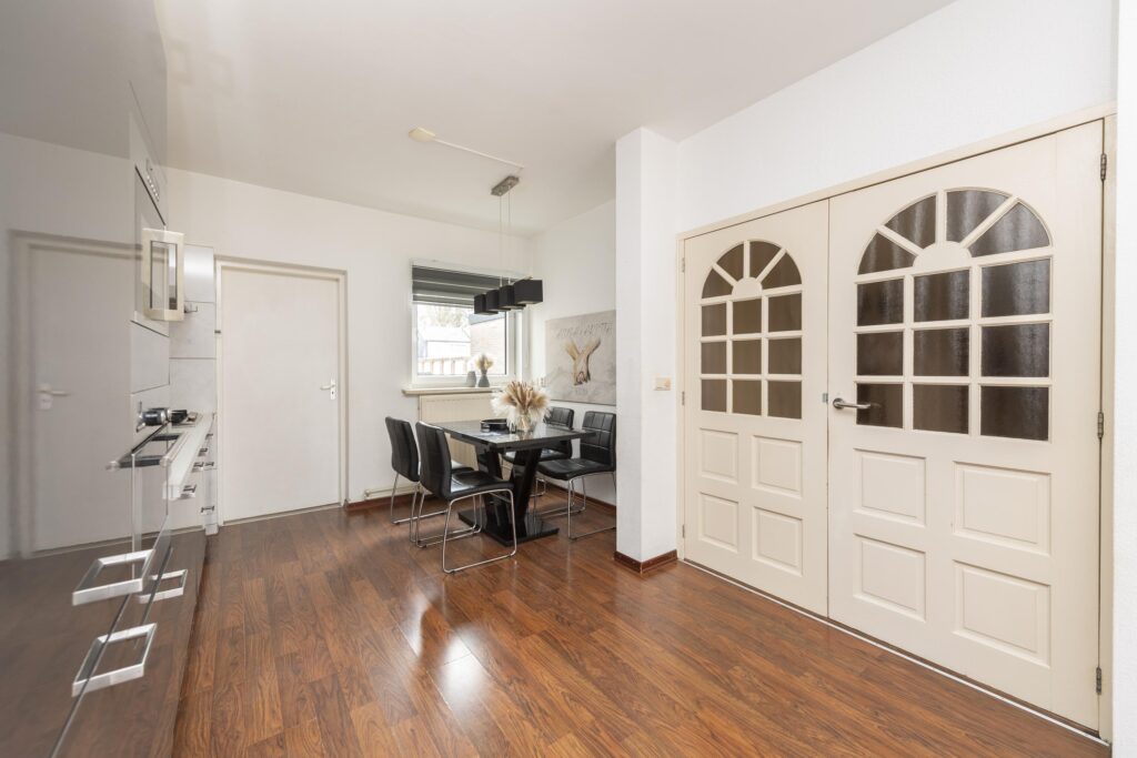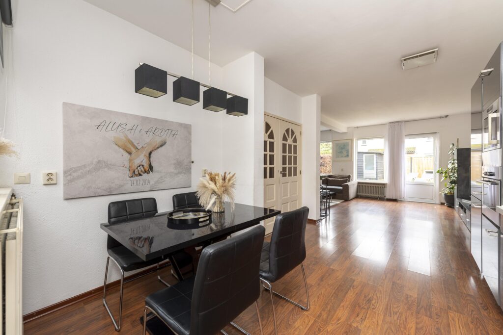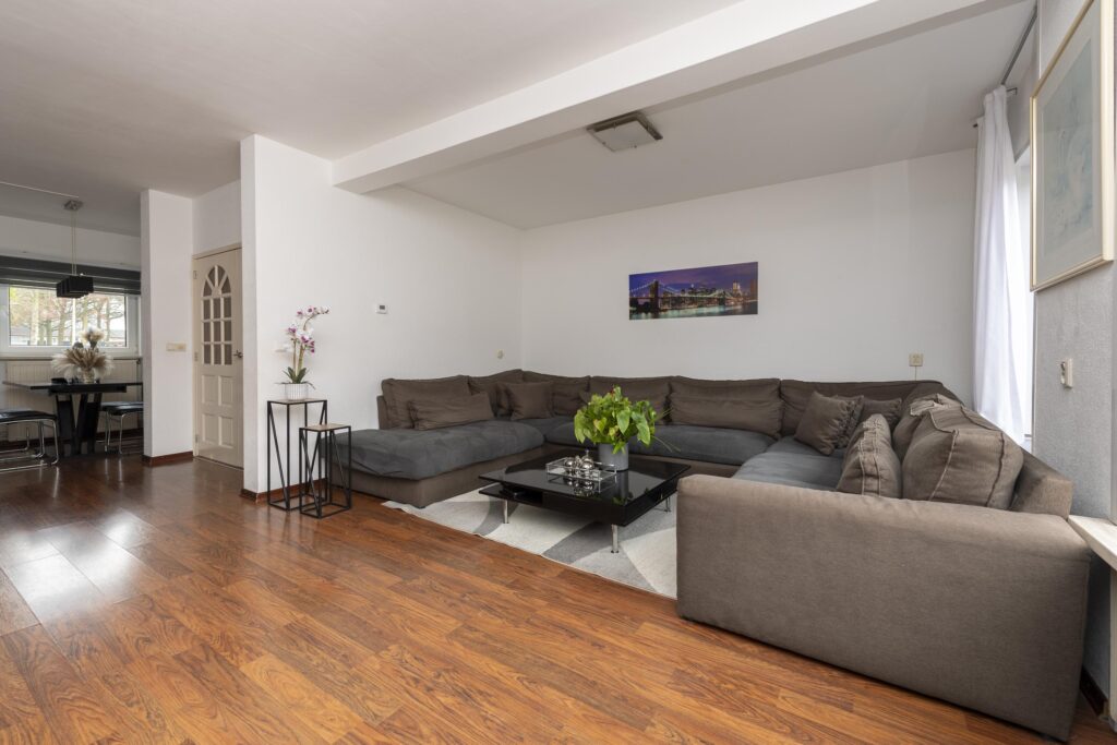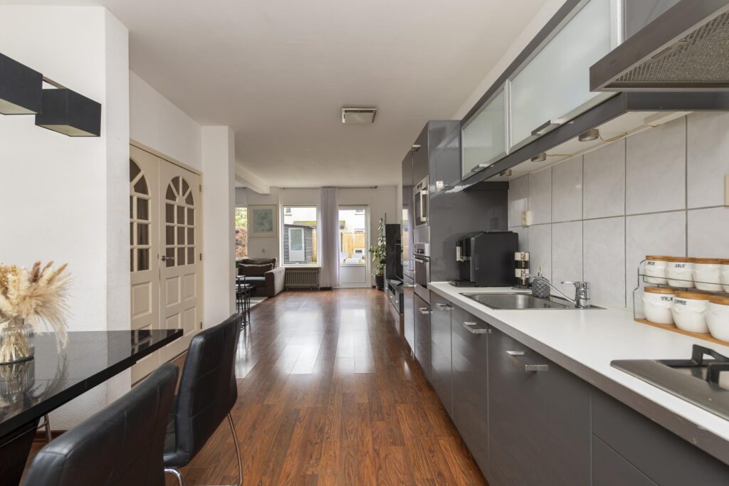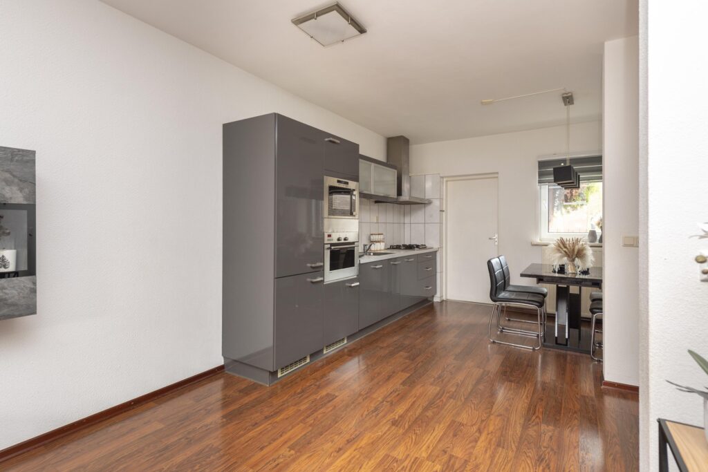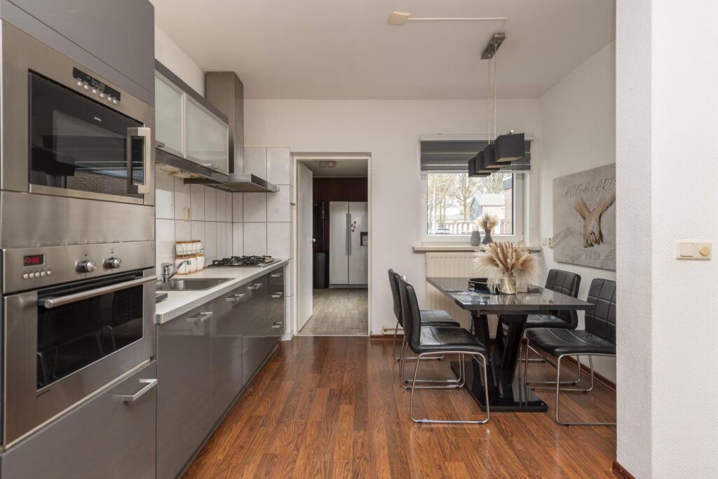 Wanneer u de woning binnenkomt, bereikt u via de hal met toiletruimte en trapopgang de keuken. Hier is voldoende ruimte voor een royale eettafel en geniet u van prettig lichtinval dankzij de ramen aan de voorzijde. De eethoek en keuken staan in open verbinding met de woonkamer. De keuken is compleet uitgerust met een gaskookplaat, afzuigkap, RVS spoelbak, magnetron, oven, vaatwasser en een koel-vriescombinatie, waardoor u beschikt over alle faciliteiten om comfortabel te koken. Aangrenzend bevindt zich een praktische berging, ideaal voor extra opslag of het gebruik als bijkeuken. Vanuit hier heeft u direct toegang tot de oprit. Vanuit de keuken komt u in de ruime en tuingerichte woonkamer. Deze strekt zich uit over de volledige breedte van de woning en biedt volop ruimte voor een fijne zithoek. Dankzij de grote raampartijen en de deur naar de achtertuin geniet u hier van veel natuurlijk licht en een directe verbinding met buiten. De volledige begane grond is afgewerkt met een laminaatvloer.