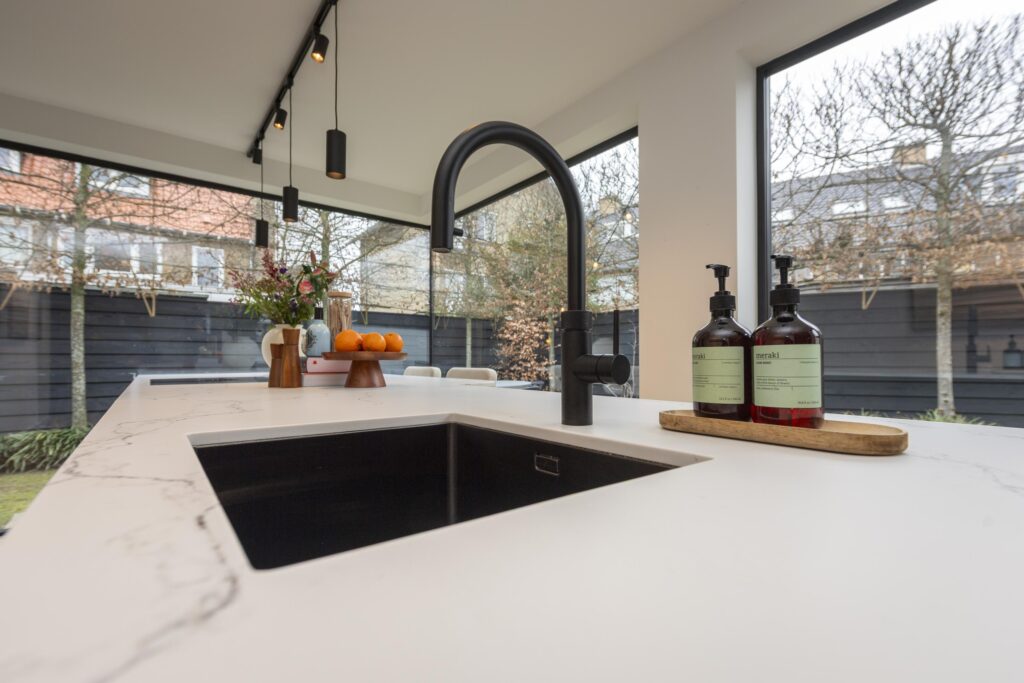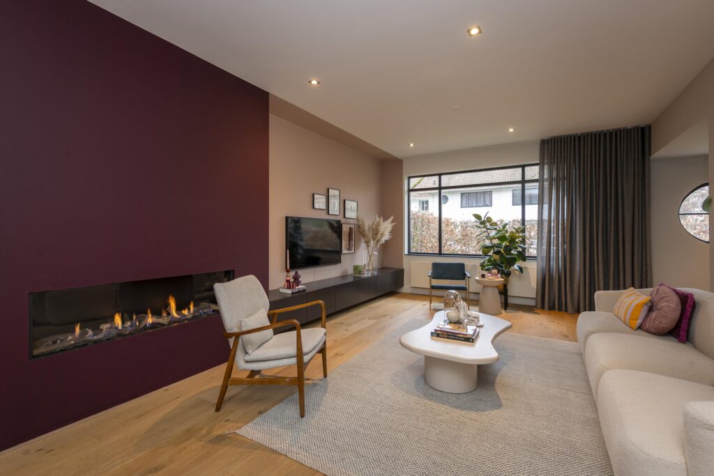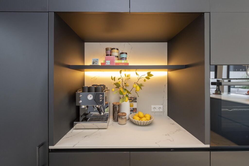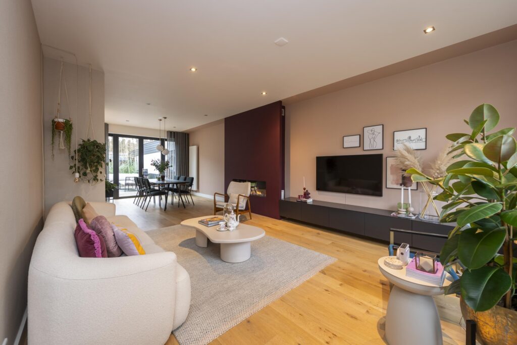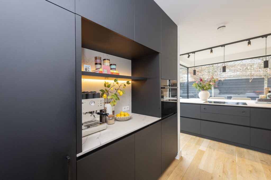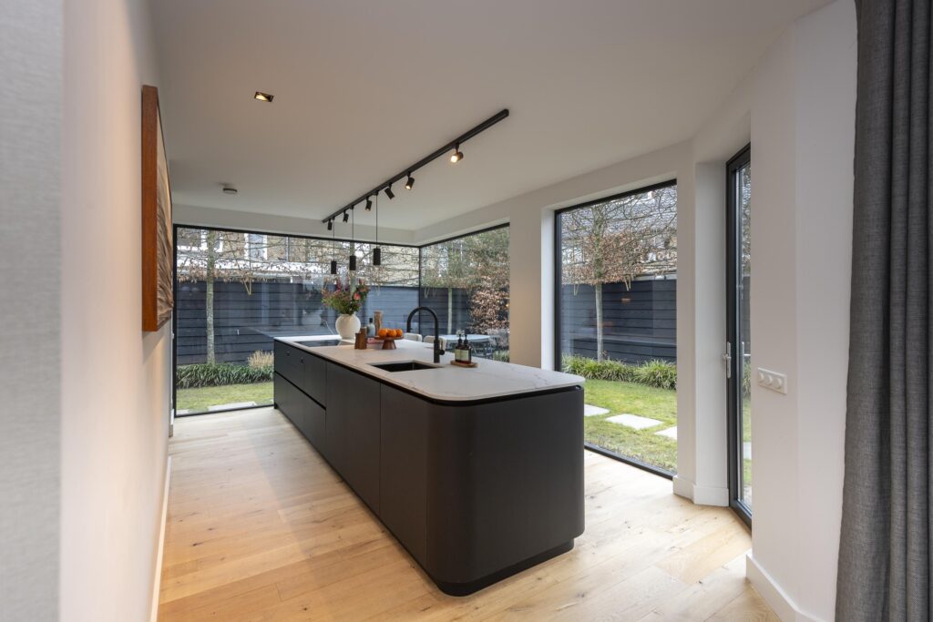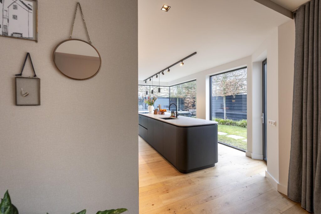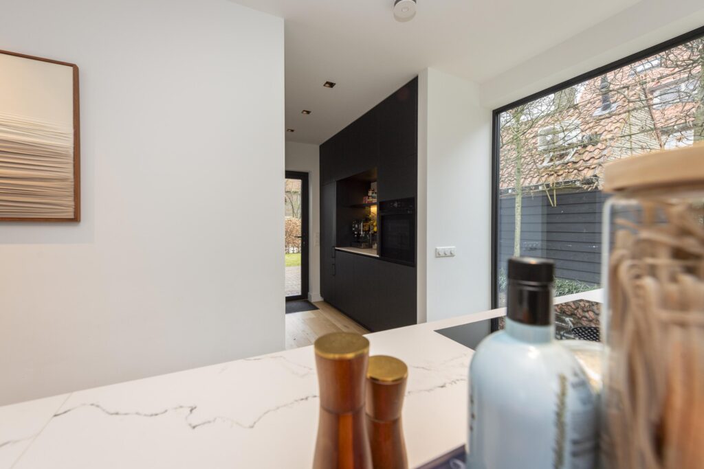 De riante hal/entree geeft toegang tot de woonkamer, trapopgang, kelder en de toiletruimte. De hoogwaardige toiletruimte (2022) is voorzien van een hangend toilet en een fontein met meubel. Een lichtstraat zorgt voor direct daglicht in de ruimte. De ruime woonkamer in L-vorm is prachtig afgewerkt met een houten vloer en strak stucwerk op de wanden en plafonds. In het plafond zijn inbouwspots aanwezig. Door de raampartijen aan zowel de voor- als achterzijde komt er veel prettig daglicht de ruimte binnen. Bij het zitgedeelte vindt u een sfeervolle gashaard. Via openslaande deuren heeft u aan de achterzijde toegang tot de achtertuin. De keuken staat in open verbinding met de woonkamer. De prachtig vormgegeven en hoogwaardige leefkeuken (maatwerk door Ecker Interieur) bevindt zich in de uitbouw die in 2022 is geplaatst. De uitbouw is rondom voorzien van grote raampartijen en heeft vloerverwarming. De keuken heeft een mooi en ruim spoel-/kookeiland met bar en een kastenwand met een nis voor bijvoorbeeld een koffiecorner. De keuken is voorzien van alle gemakken. Zo vindt u hier een RVS spoelbak met Quooker, vaatwasser, Bora inductiekookplaat, combi-oven, en een koel-vriescombinatie. Kers op de taart is het prachtige Caesarstone composietblad. Vanuit de keuken heeft u via een deur rechtstreeks toegang tot de voorzijde van de woning.