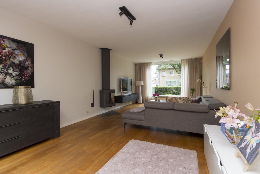De hal/entree geeft toegang tot de toiletruimte, trapopgang, meterkast en de woonkamer. De zeer ruime woonkamer strekt zich over de volledige diepte van de woning en is keurig afgewerkt met een parket vloer en stucwerk op de wanden en plafonds. Daarnaast is de woonkamer voorzien van een prachtige en sfeervolle design houtkachel (Harrie Leenders). De woonkamer is aan de achterzijde uitgebouwd en hier vindt u het eetgedeelte. Vanuit hier heeft u toegang tot de keuken en via een schuifpui tot de achtertuin. Door de grote raampartijen aan zowel de voor- als achterzijde en de aanwezige lichtstraat komt er veel daglicht de ruimte binnen. De keuken heeft een keukenblok in hoekopstelling en een kastenwand. De keuken is voorzien van veel gemakken. Zo vindt u hier een gaskookplaat, RVS afzuigkap, vaatwasser, RVS spoelbak, oven, magnetron, koelkast en een barretje. Daarnaast heeft u vanuit de keuken toegang tot de trapkast met veel bergruimte.