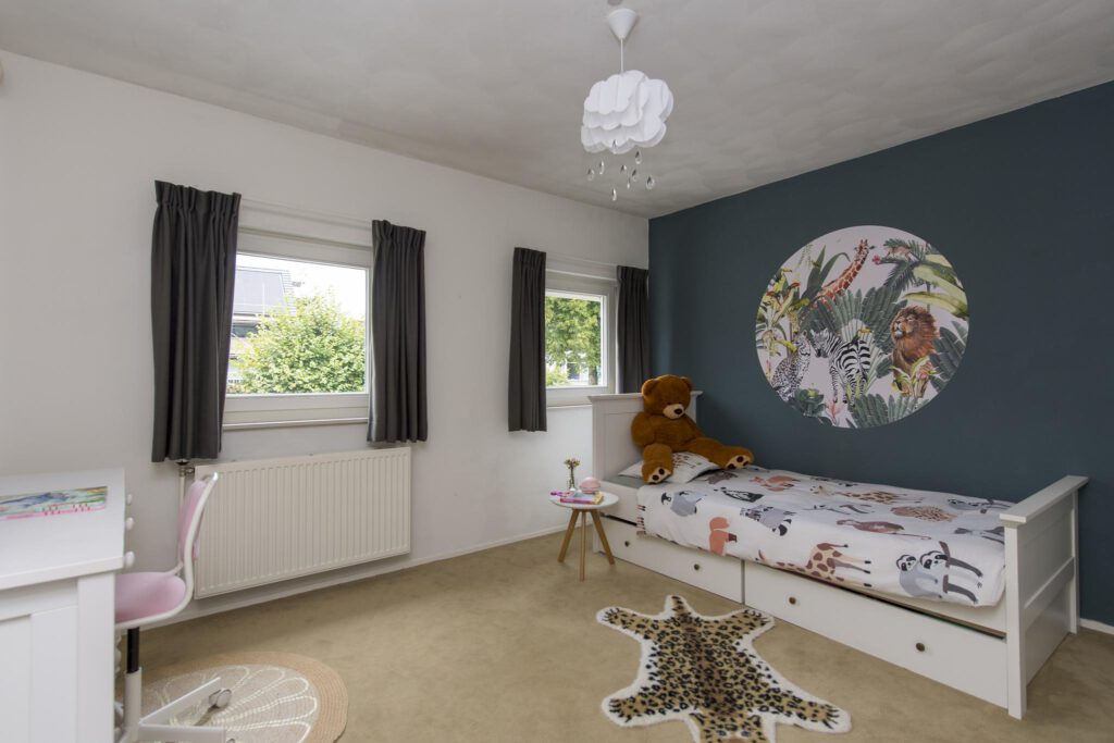 De overloop geeft toegang tot drie slaapkamers en de badkamer. Twee slaapkamers zijn gelegen aan de achterzijde van de woning en één aan de voorzijde. De slaapkamers zijn netjes afgewerkt met vloerbedekking en stucwerk op de wanden en plafonds. Daarnaast heeft de kleinste slaapkamer een handige vaste kastenwand. De badkamer is volledig betegeld en heeft een wastafel in meubel, een douchecabine, een hangend toilet en een designradiator. Via een deur heeft u vanuit de badkamer toegang tot het balkon (ca. 2 m²).