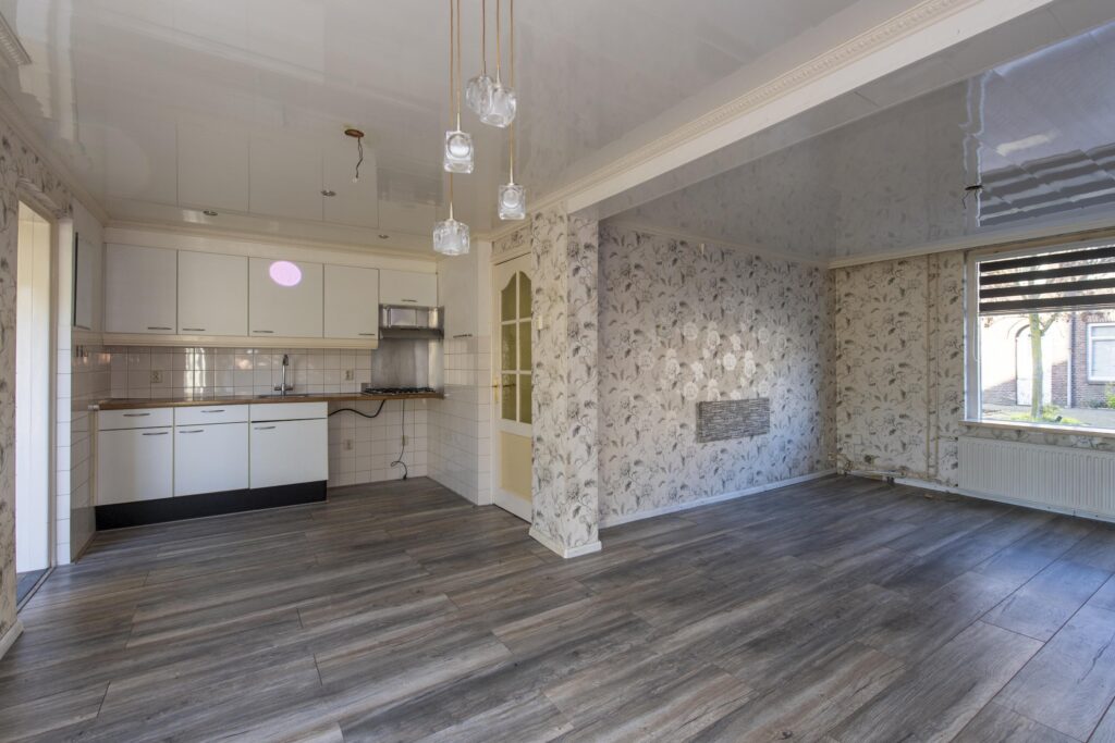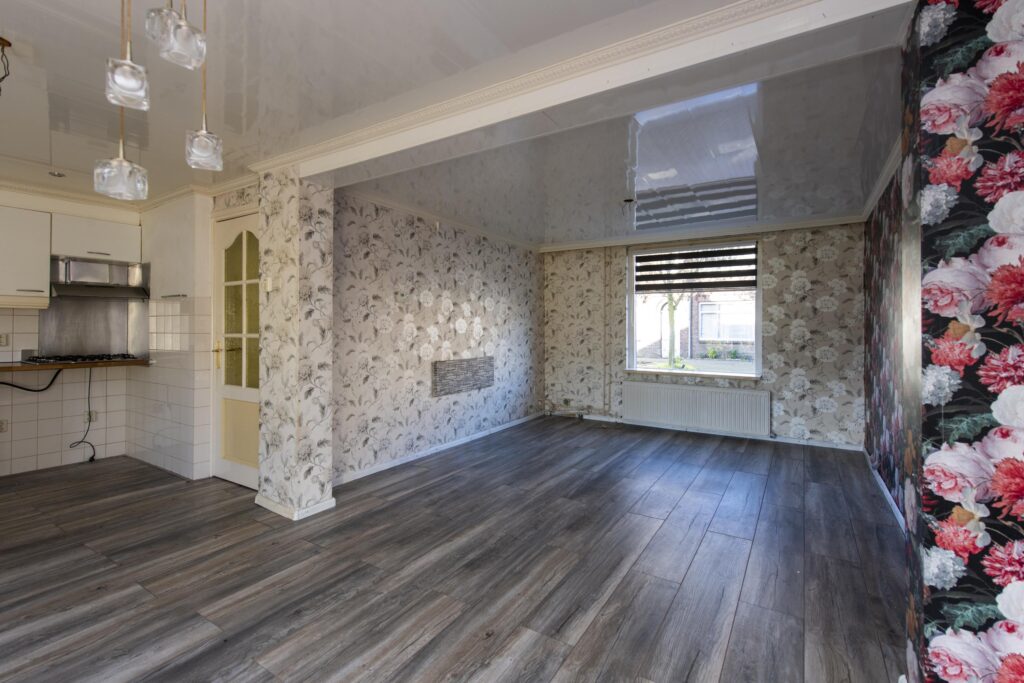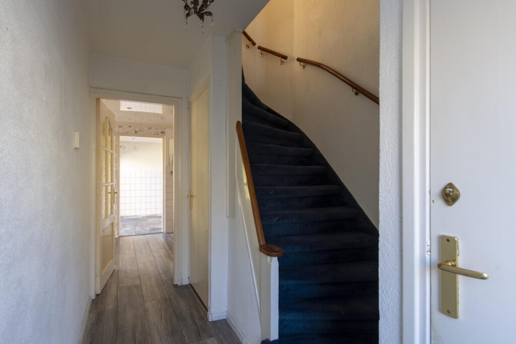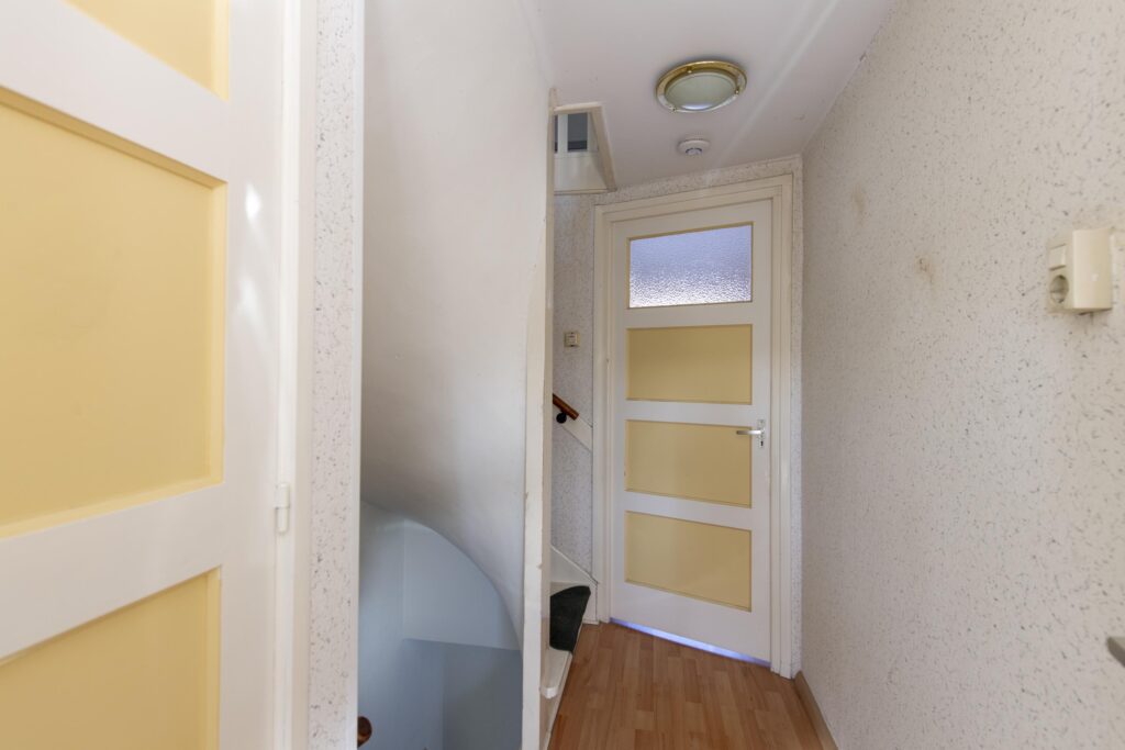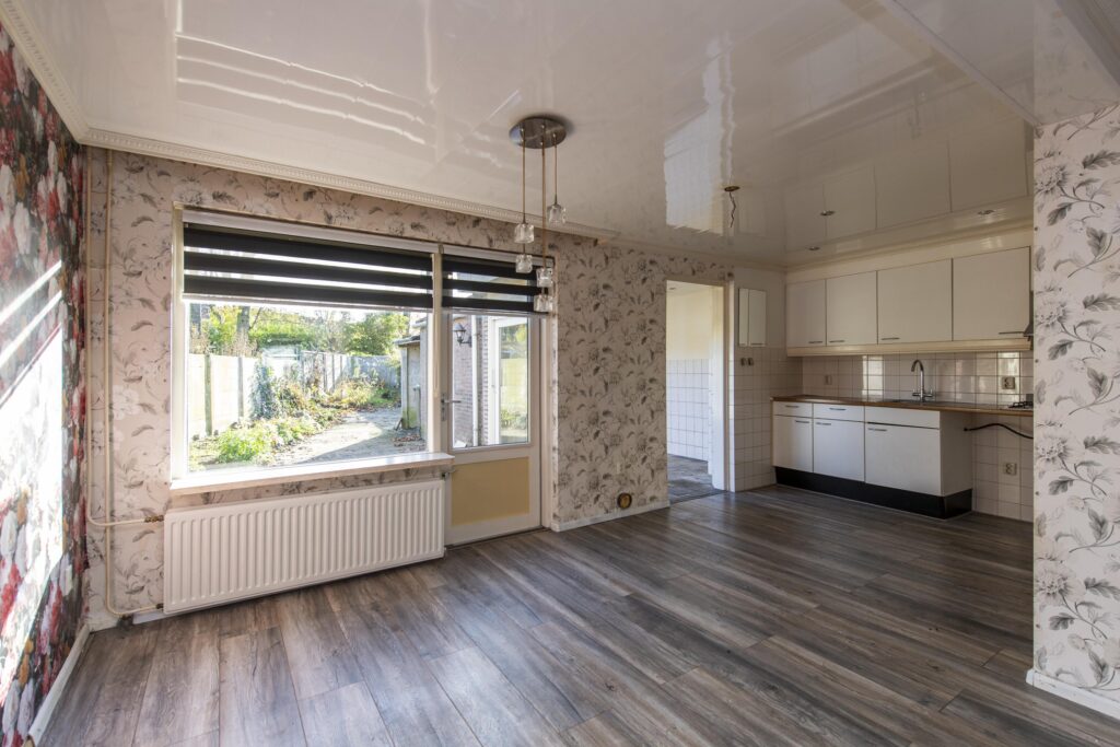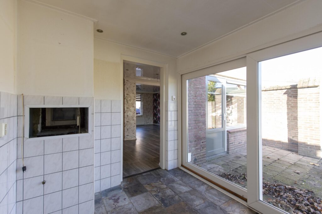 U betreedt de woning via de entree, waar zich het toilet en de trapopgang bevinden. De toiletruimte is betegeld en voorzien van een staand toilet. Vanuit de hal loopt u de woonkamer binnen. De woonkamer strekt zich uit over de volledige diepte van de woning. Door de grote raampartijen komt er veel prettige daglicht de ruimte binnen. De woonkamer biedt voldoende ruimte voor een ruime zit- en eethoek. De woonkamer staan in open verbinding met de keuken. De keuken heeft een eenvoudig keukenblok in rechte opstelling welke is voorzien van een RVS-spoelbak, gaskookplaat en een afzuigkap. Via de keuken komt u in de achtergelegen kamer, ideaal als bijvoorbeeld werk-, hobby- of speelkamer. Vanuit deze ruimte heeft u via een schuifpui toegang tot de achtertuin.