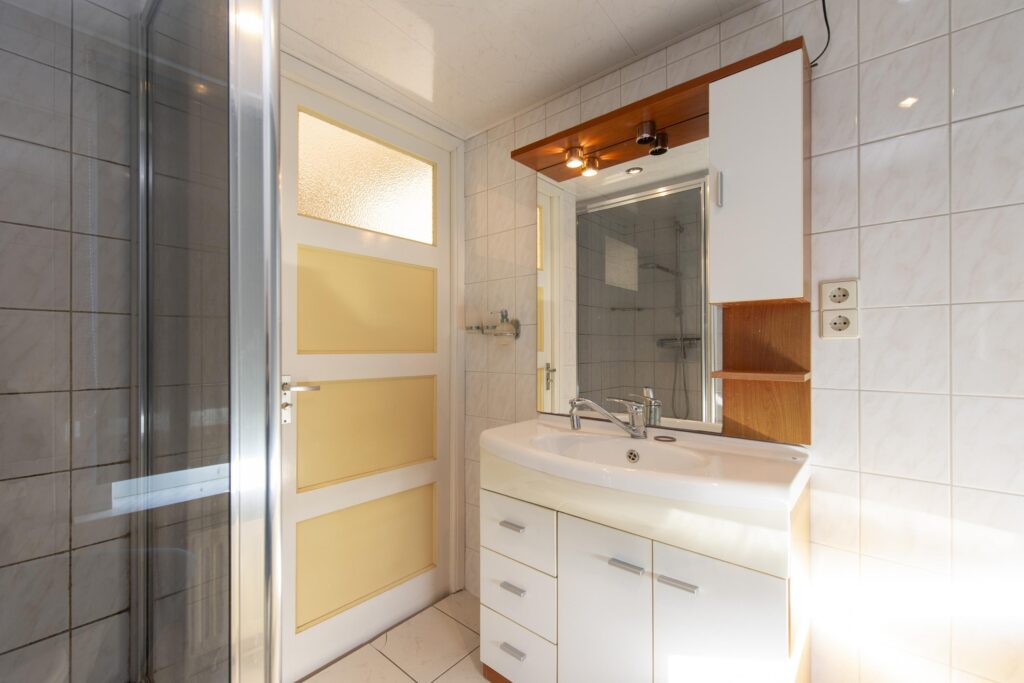 Op de eerste verdieping geeft de overloop toegang tot twee slaapkamers, de badkamer en een vaste kast. Aan de voorzijde van de woning ligt een ruime slaapkamer met twee handige vaste kasten. Aan de achterzijde van de woning ligt de tweede, eveneens ruime slaapkamer. Ook de badkamer is gelegen aan de achterzijde van de woning. De badkamer is betegeld en voorzien van een wastafel in meubel, toilet en een douche.