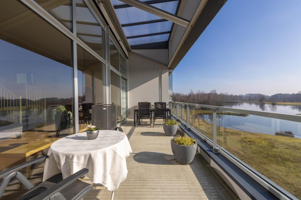 De woonkamer en woonkeuken zijn gelegen aan de achterzijde van het appartement. Door het speelse hoogteverschil heeft u direct een prachtig uitzicht over natuurgebied De Dongevallei. De luxe keuken heeft een keukenblok in rechte opstelling en een kookeiland. De keuken is voorzien van alle gemakken. Zo vindt u hier een inductie kookplaat. RVS afzuigkap (recirculatie), teppanyaki plaat, vaatwasser, RVS spoelbak met Quooker, combi-oven, combi-stoomoven en een koelkast. Het kookeiland heeft daarnaast een ruim barblad. In de keuken is voldoende plaats voor een riante eettafel. Vanuit de keuken heeft u via deuren toegang tot de patio en de werkkamer. De patio zorgt voor veel prettige lichtinval. De woonkamer staat in open verbinding met de keuken en is via een trapje bereikbaar. De grote raampartij in de woonkamer zorgt voor veel lichtinval en een schitterend en weids uitzicht over het natuurgebied. Zowel de woonkamer als de keuken zijn netjes afgewerkt met een laminaatvloer, stucwerk op de wanden en een spanplafond met spotjes. Via een schuifpui heeft u vanuit de woonkamer toegang tot het balkon. Het riante balkon is ca. 19 m² en biedt ruimte voor meerdere zitjes zodat u maximaal van het prachtige uitzicht kunt genieten. Het balkon is gelegen op het zonnige zuidoosten. Doordat het balkon niet direct aan het water is gelegen heeft u geen last van de schitteringen. Het balkon is voorzien van zonwering.