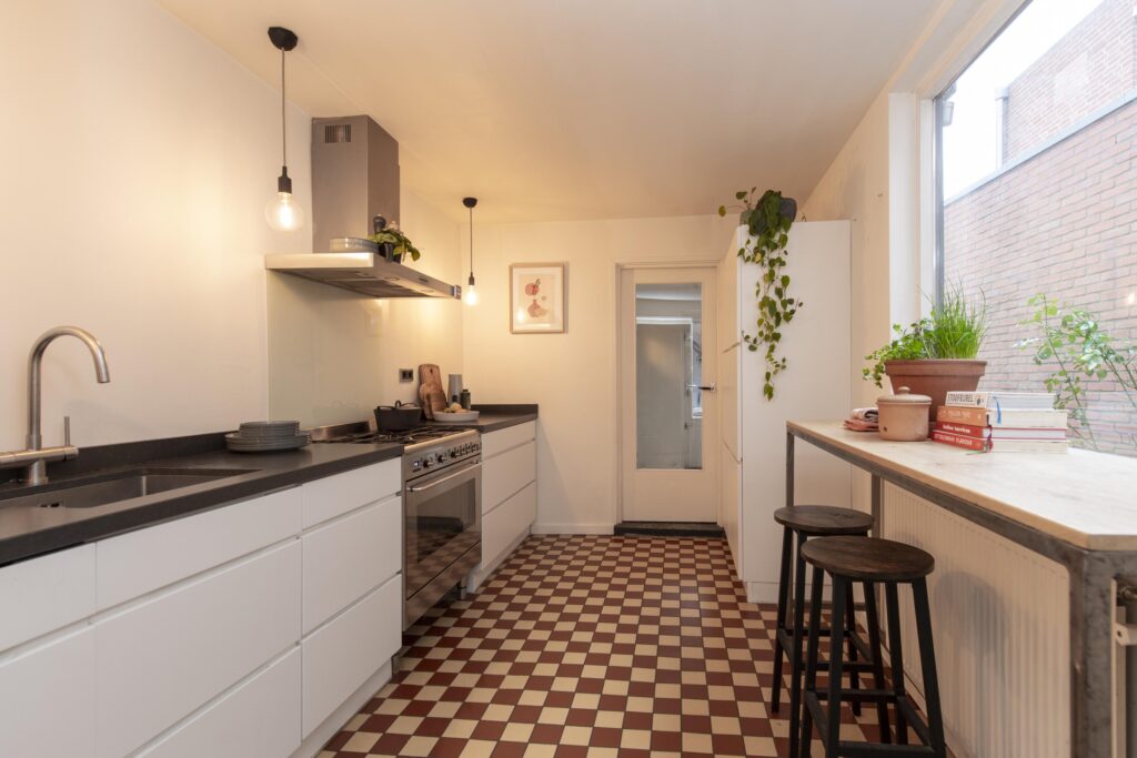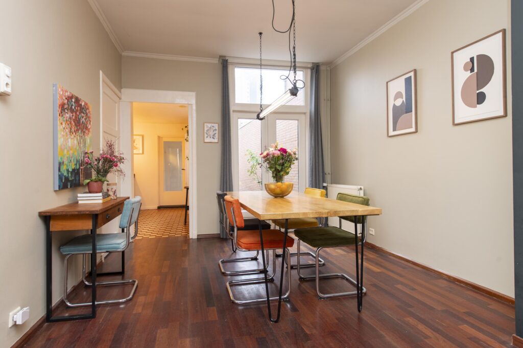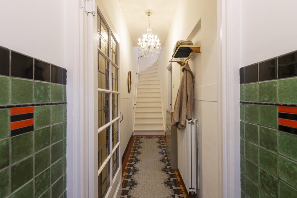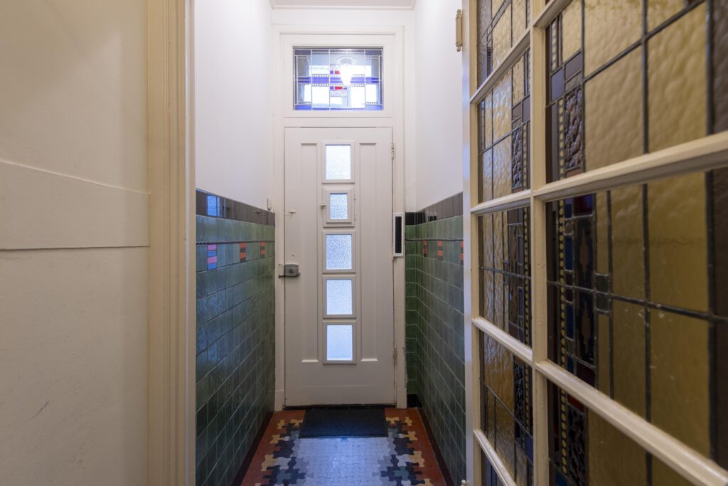 Via de entree bereikt u de hal. Door het glas-in-lood, de statige trapopgang en de authentieke tegels op de vloer en wanden proeft u hier direct de karakteristieke sfeer van de woning. De woonkamer strekt zich over de volledige diepte van de woning. Het zitgedeelte vindt u aan de voorzijde van de woning. Naast een vaste kast vindt u hier ook een sfeervolle gashaard. Het eetgedeelte vindt u aan de achterzijde. Vanuit hier heeft u via openslaande deuren toegang tot de achtertuin. De woonkamer is voorzien van een houten vloer en stukwerk op de wanden en plafond. De keuken staat in een open verbinding met de woonkamer en heeft een keukenblok in rechte opstelling en een kastenwand. De luxe keuken (2017) is voorzien van veel gemakken. Zo vindt u hier een gasfornuis met oven (Smeg), RVS afzuigkap, RVS spoelbak met kokend waterkraan, koelkast, vriezer, vaatwasser en een composiet aanrechtblad. Na de keuken komt u in de bijkeuken. Hier vindt u een kast met de opstelling van de CV-ketel (Vaillant CW5, 2017) en de aansluitingen voor de wasapparatuur. Tevens heeft u vanuit deze ruimte toegang tot een handige bergzolder. De toiletruimte is volledig betegeld en voorzien van een hangend closet. Vanuit de bijkeuken heeft u via een deur toegang tot de achtertuin. Zowel de keuken als de bijkeuken hebben een tegelvloer en stukwerk op de wanden en plafond.