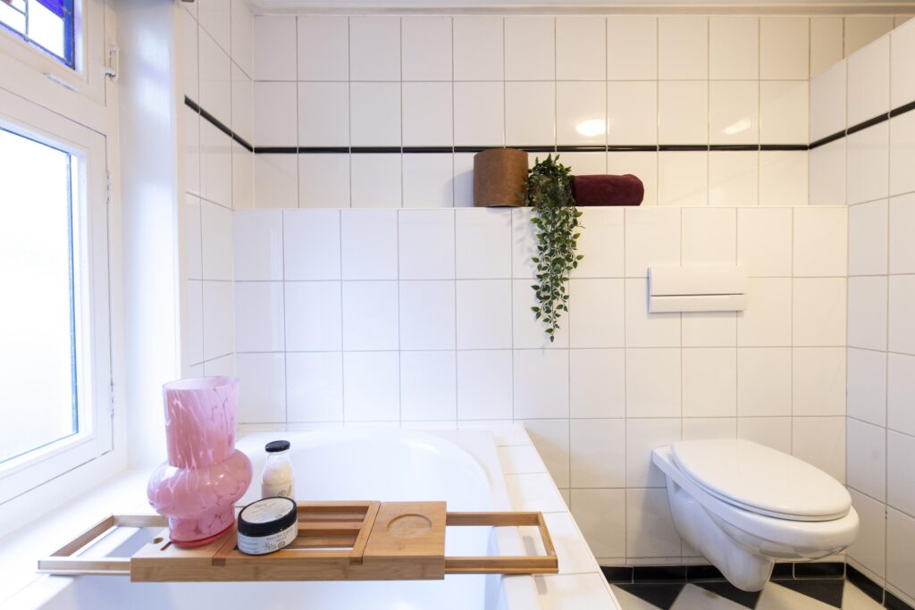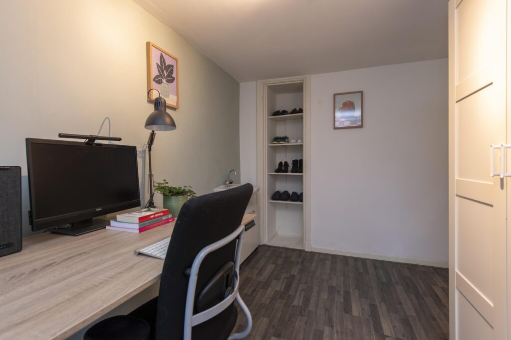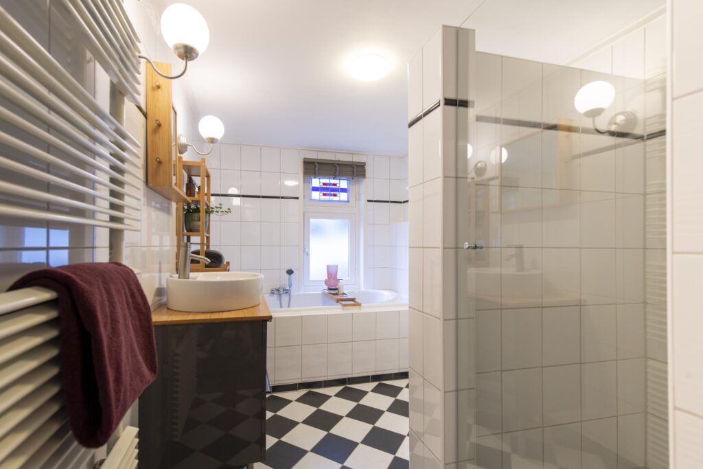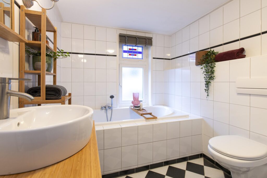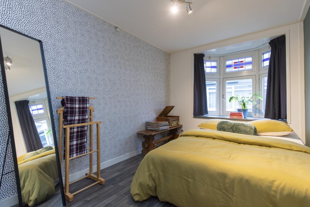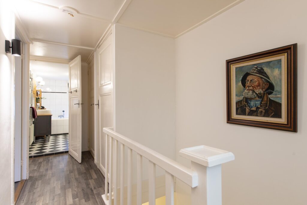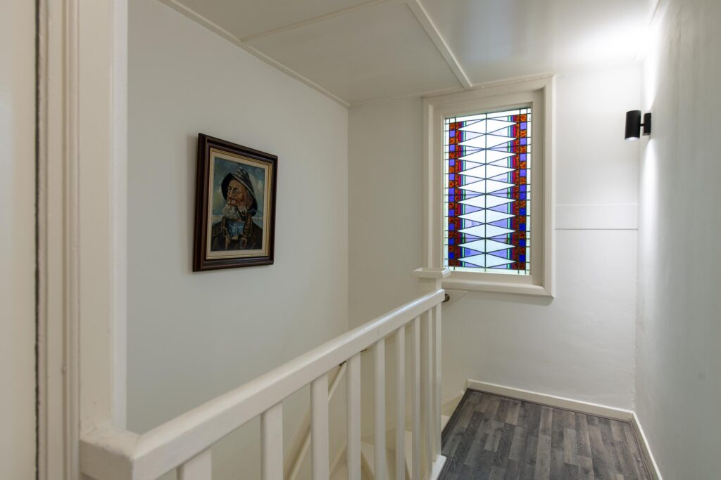 De overloop geeft toegang tot twee slaapkamers, de badkamer en een handige vaste kast. Daarnaast vindt u op de overloop een vaste boekenkast. Zowel aan de voorzijde als de achterzijde van de woning is een slaapkamer gelegen. Beide zijn netjes afgewerkt met een laminaatvloer en stukwerk op de wanden en plafond. Ook hebben beide slaapkamers een vaste kast. De slaapkamer aan de voorzijde is daarnaast voorzien van een mooie erker met glas-in-lood. De badkamer, gelegen aan de voorzijde van de woning, is volledig betegeld. Verder is deze voorzien van een wastafel in meubel, ligbad, toilet en een douche.