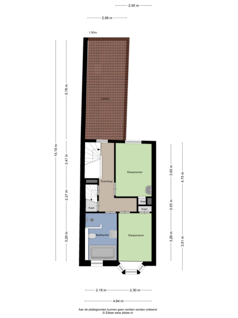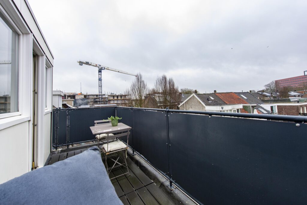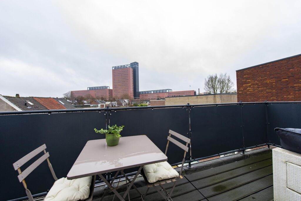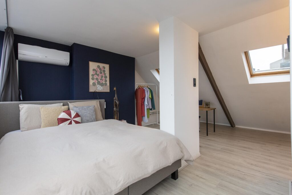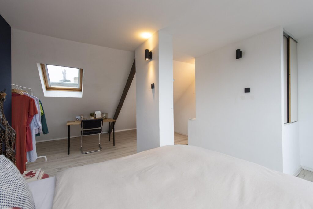 Ook deze verdieping is via een vaste trap bereikbaar en hier vindt u de derde slaapkamer. Deze ruime slaapkamer is strak afgewerkt met een laminaatvloer en stukwerk op de wanden en het plafond. Ook heeft de verdieping airconditioning. Aan de voorzijde van de woning is de kamer voorzien van twee Velux dakramen. Aan de achterzijde vindt u een groot dakkapel over de volledige breedte van de woning. Via een deur heeft u toegang tot het riante dakterras (ca. 9 m²). Dit terras is afgewerkt met vlonder planken en biedt een mooi uitzicht over de stad. Hier is het uitstekend vertoeven in de zon.