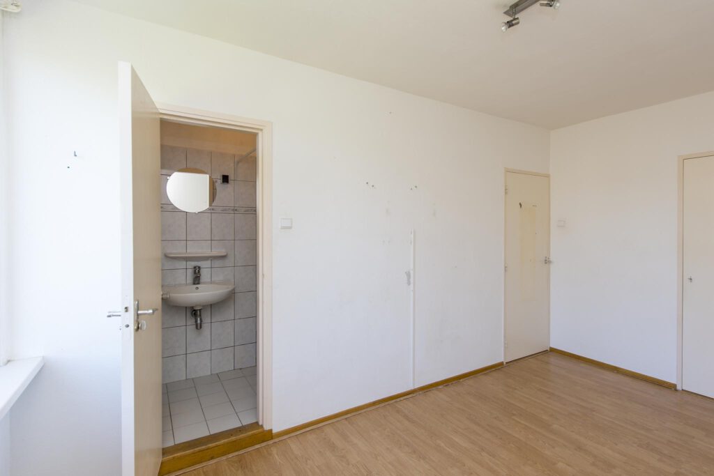 Alle slaapkamers zijn afgewerkt met een laminaatvloer en stucwerk op de wanden. De kleinste slaapkamer heeft een vaste kast en hier vindt u de u daarnaast ook de aansluiting voor de wasmachine. Een andere slaapkamer geeft via een deur toegang tot de badkamer. De badkamer heeft een douche en een wastafel in meubel. De derde slaapkamer biedt toegang tot het grote balkon (ca. 4 m²) welke is gelegen op het zonnige zuidwesten.