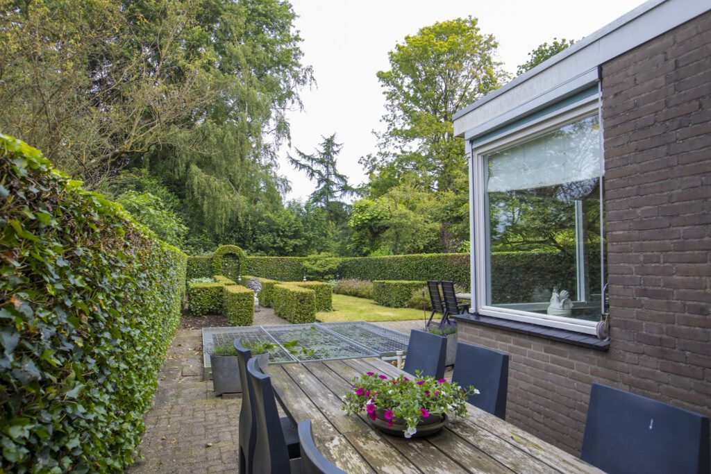 De woning heeft zowel een voor- als achtertuin. De zeer diepe en zonnige achtertuin is gelegen op het noordwesten. De tuin is bijzonder fraai aangelegd met een terras, gazon, plantenborders, hagen en een vijver. In deze prachtige tuin vindt u altijd ergens een plekje in de zon of juist in de schaduw. Doordat de woning aan de achterzijde vrij is gelegen biedt de tuin zeer veel privacy.