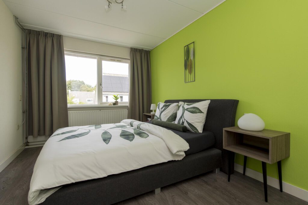 De overloop geeft toegang tot drie slaapkamers en de badkamer. Twee slaapkamers zijn gelegen aan de voorzijde van de woning en één aan de achterzijde. Alle slaapkamers zijn netjes afgewerkt met een laminaatvloer en spachtelputz op de wanden. De luxe badkamer (2022) is modern betegeld en voorzien van een ligbad, wastafel in meubel, toilet en een inloopdouche.