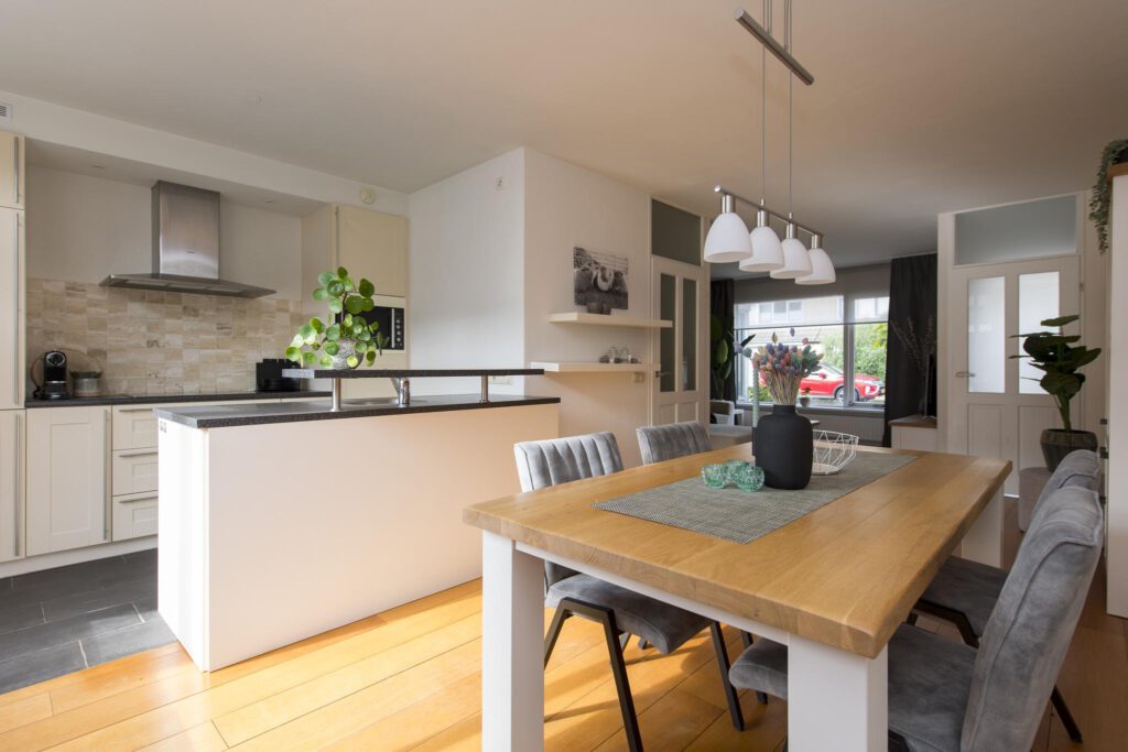 De hal/entree geeft toegang tot de meterkast en de woonkamer. Het zitgedeelte is gelegen aan de voorzijde van de woning en de keuken en de eetkamer aan de achterzijde. De volledige begane grond is keurig afgewerkt met een houten vloer, spachtelputz op de wanden en stucwerk op het plafond. De keuken heeft een keukenblok in rechte opstelling en een spoeleiland met barretje. De keuken is voorzien van veel gemakken. Zo vindt u hier een elektrische kookplaat, RVS afzuigkap, combi-magnetron, koelkast, RVS spoelbak en een vaatwasser (2019). Vanuit de keuken heeft u via een deur toegang tot de achtertuin. Tussen de woonkamer en de keuken vindt u een hal met de toiletruimte en de trapopgang naar de verdieping. De toiletruimte is betegeld en voorzien van een hangend toilet en een fonteintje.