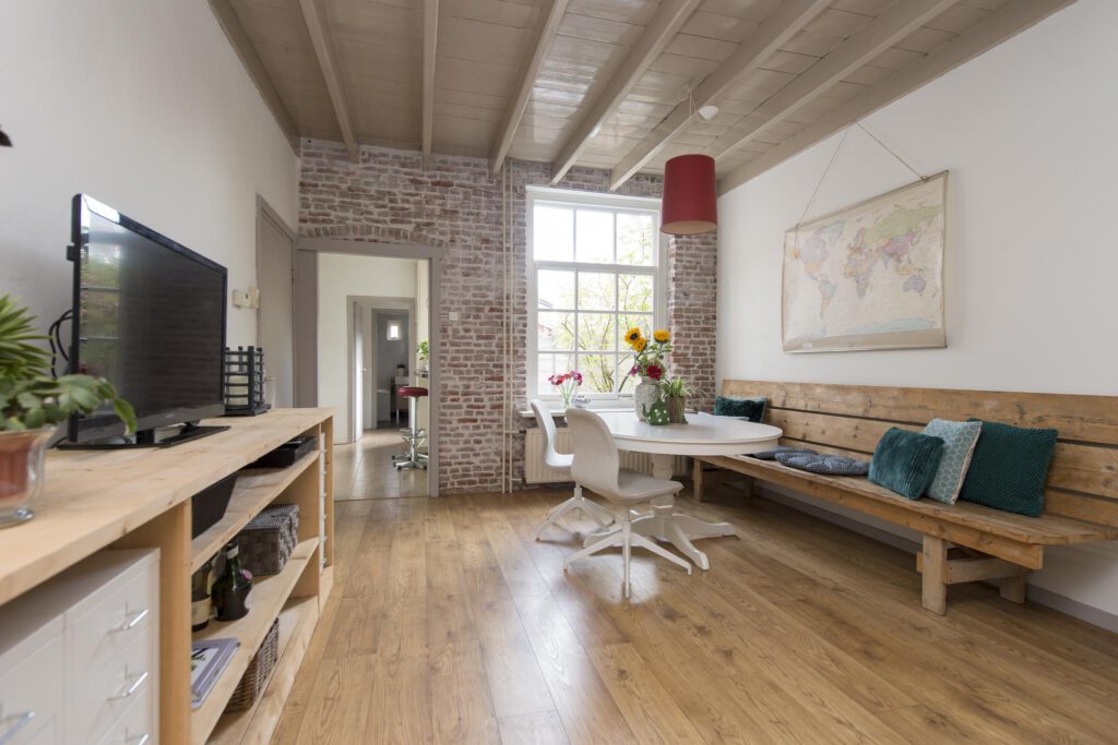 De hal/entree geeft toegang tot de trapopgang en de woonkamer. De riante woonkamer is keuring afgewerkt met een houten vloer en stucwerk op de wanden. Of het nu de rasters in de ramen, het balkenplafond of de bakstenen muur met schuifraam is, de woonkamer barst van het karakter. Tevens vindt u in de woonkamer een zeer riante (voorraad)kast. De woonkamer staat aan de achterzijde in een open verbinding met de keuken. De keuken heeft een keukenblok in rechte opstelling en is voorzien van veel gemakken. Zo vindt u hier een gaskookplaat, RVS afzuigkap, combi-oven, vaatwasser, koelkast en een RVS spoelbak. Na de keuken bereikt u de bijkeuken. Hier vindt u de aansluiting van de wasapparatuur en de toiletruimte. Tevens heeft u vanuit hier toegang tot de badkamer en de achtertuin. De toiletruimte is modern betegeld en voorzien van een hangend toilet en een designradiator. Ook de badkamer is modern betegeld en daarnaast heeft deze een inloopdouche, ligbad, wastafel in meubel en een designradiator.