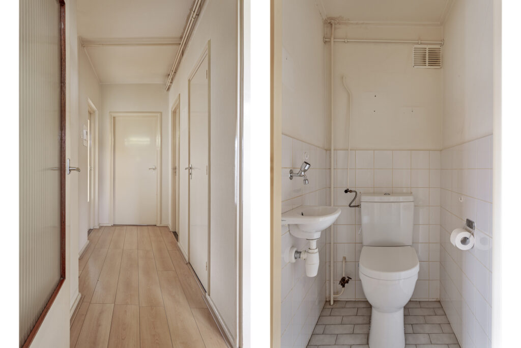 De hal en gang geven toegang tot alle ruimtes van het appartement. Zo ook tot de toiletruimte, deze is betegeld en voorzien van een staand closet en een fonteintje.