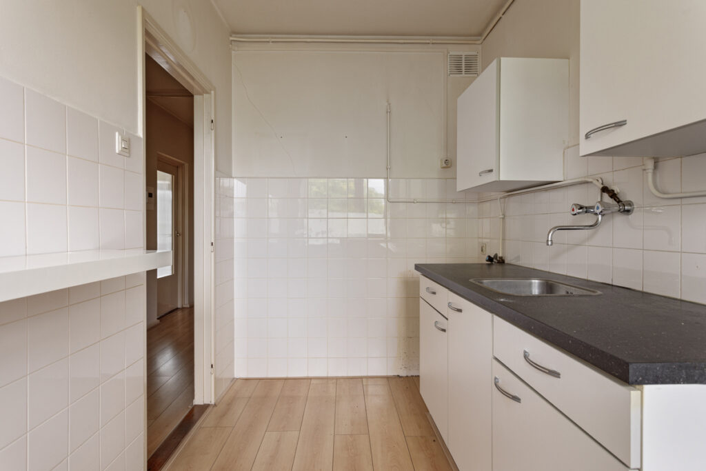 De afgesloten keuken is voorzien van een eenvoudig keukenblok met RVS spoelbak. Daarnaast vindt u hier de aansluitingen voor de wasapparatuur. De ruime woonkamer is voorzien van een laminaatvloer. De woonkamer is verdeeld in twee ruimtes die in een open verbinding met elkaar staan. Vanuit beide ruimtes heeft u via een deur toegang tot het balkon. Door de grote raampartijen komt er veel daglicht de ruimte binnen. Het balkon is voorzien van een zonnescherm en biedt zicht op de Tilburgse binnenstad.