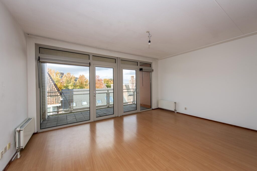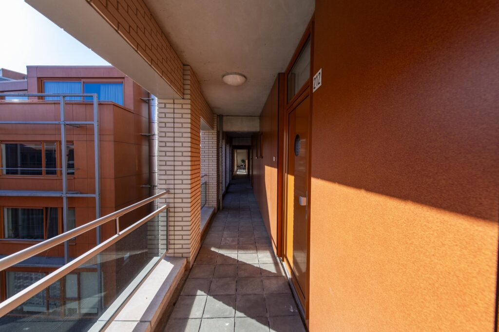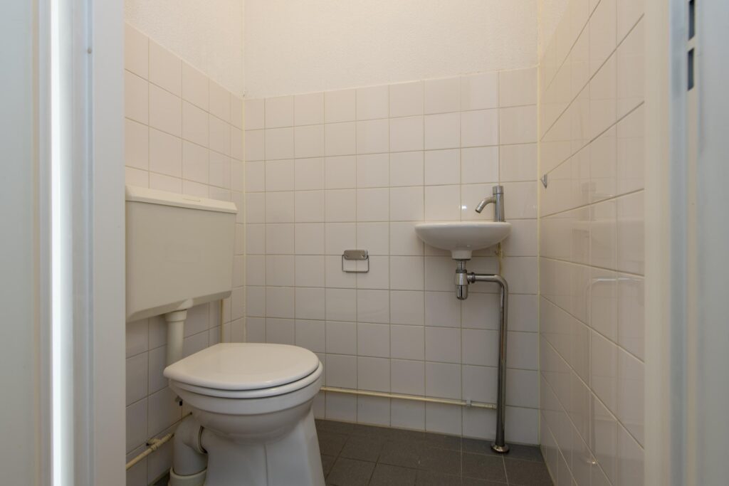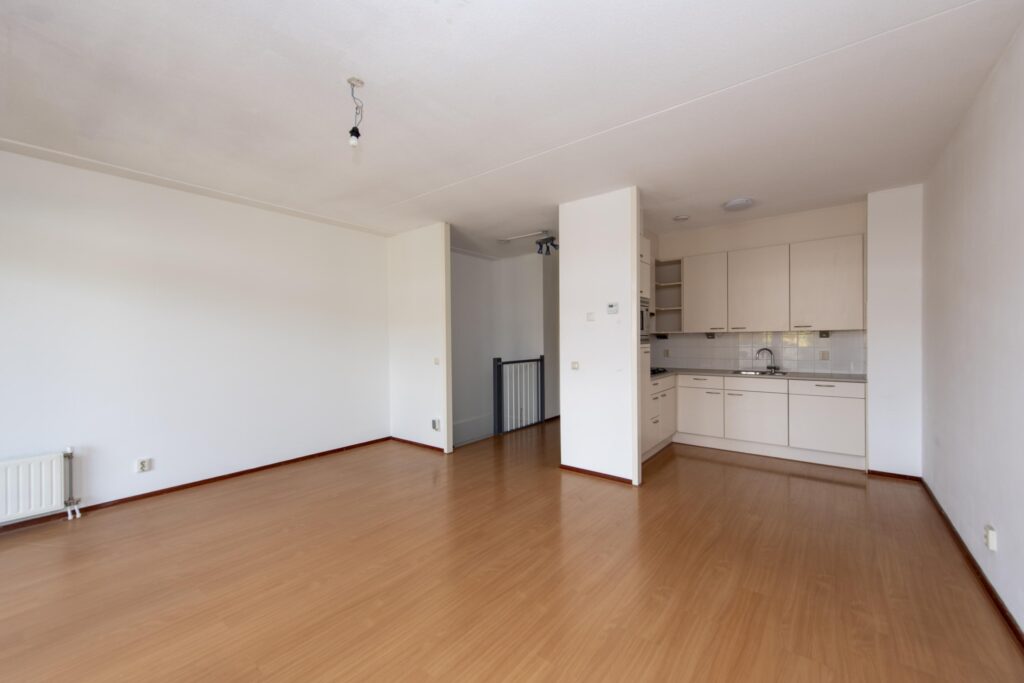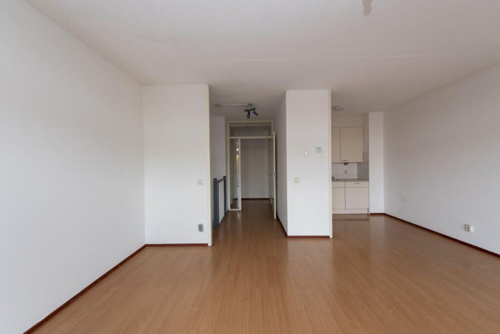 Op deze verdieping vindt u de woonkamer, keuken, technische ruimte en een toiletruimte. De woonkamer is afgewerkt met een laminaatvloer en geeft via twee deuren toegang tot het tweede balkon. Ook dit balkon is ca. 10 m² groot. De keuken heeft een keukenblok in hoekopstelling en is voorzien van een koelkast, combi-oven, gaskookplaat, afzuigkap, RVS spoelbak en een vaatwasser. De toiletruimte is betegeld en heeft een hangend toilet en een fonteintje. In de technische ruimte vindt u naast handige bergruimte ook de aansluitingen voor de wasapparatuur, de opstelling van de CV-ketel (AWB, 2022) en de unit van de mechanische ventilatie.
