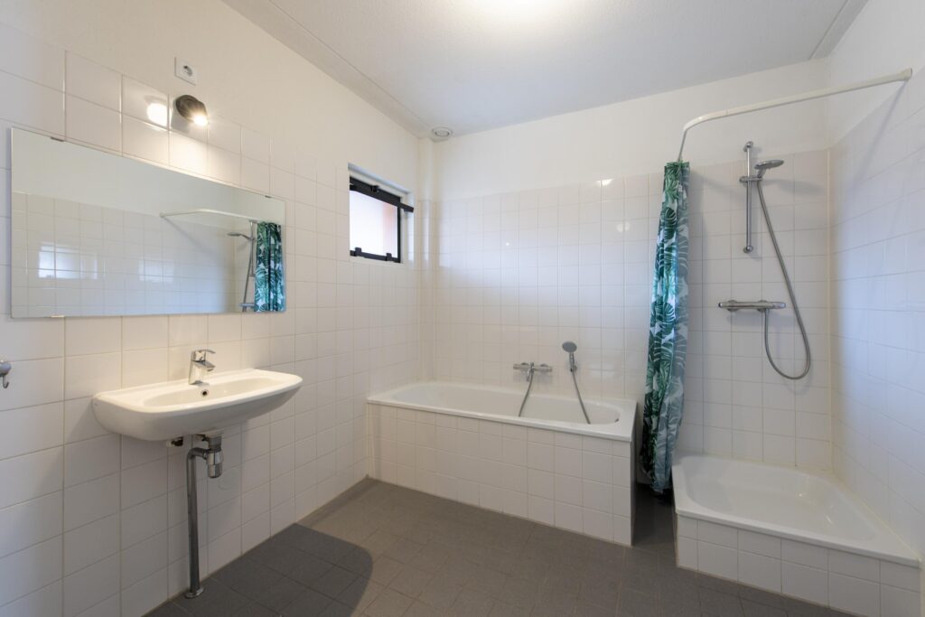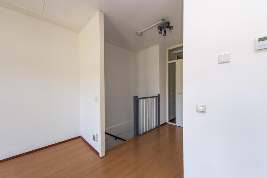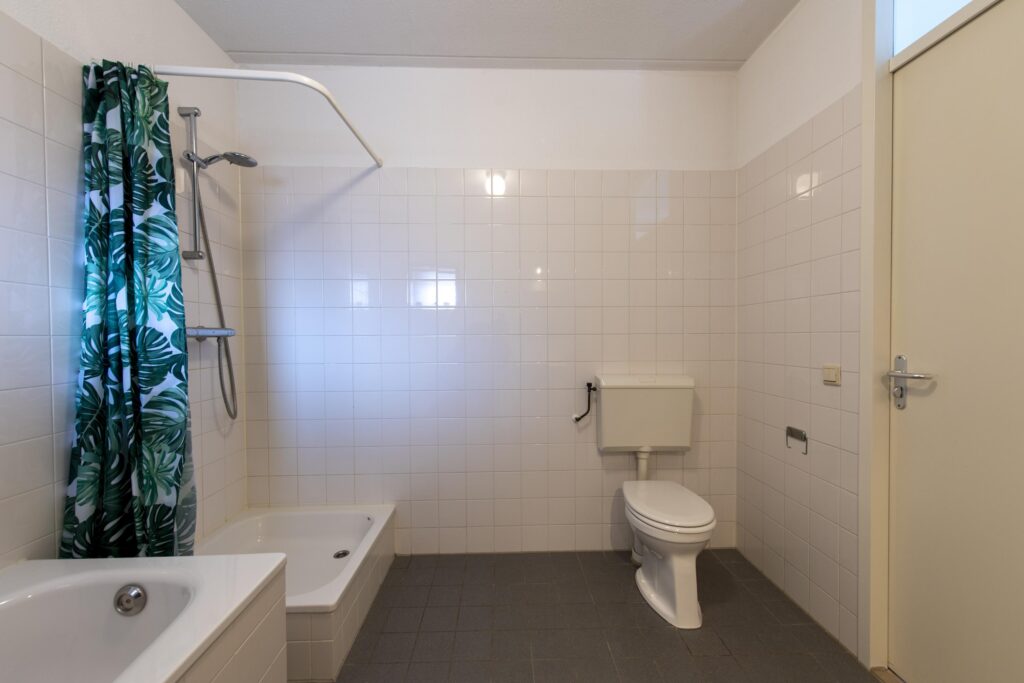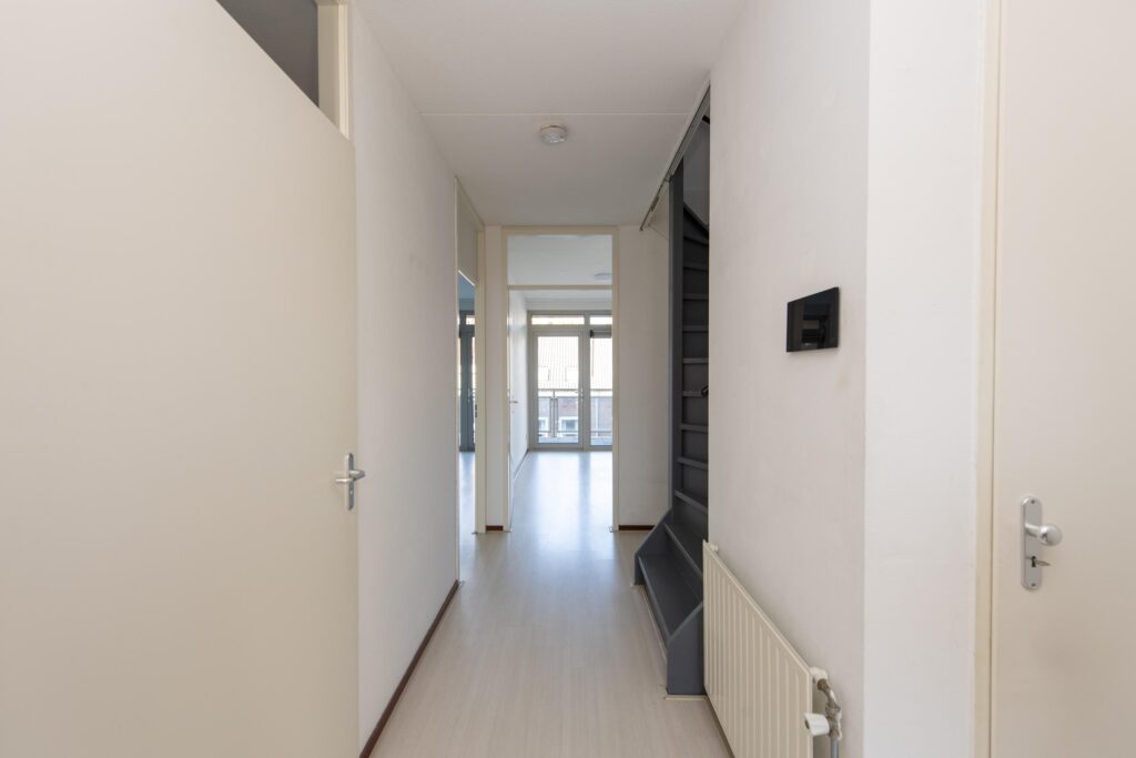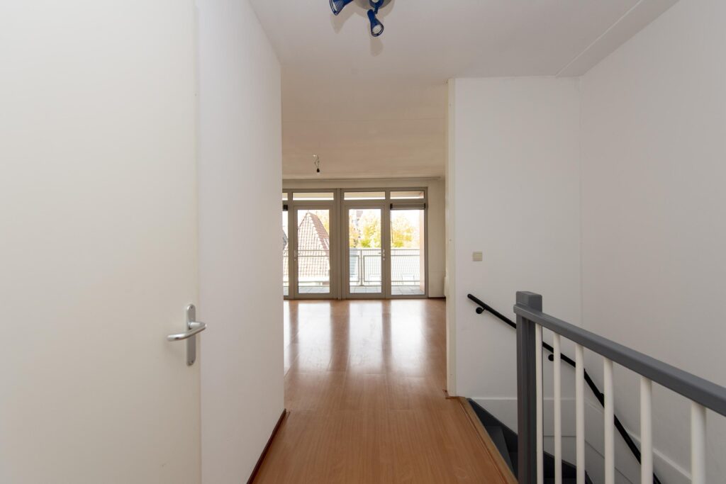 U komt het appartement binnen via de hal. Deze hal geeft toegang tot de twee slaapkamers, badkamer, meterkast en de trapopgang naar de tweede woonlaag. De twee slaapkamers zijn gelegen aan de voorzijde van het appartement. Beide geven met een deur toegang tot het balkon van ca. 10 m². De badkamer is betegeld en voorzien van een ligbad, douche, wastafel en een toilet.