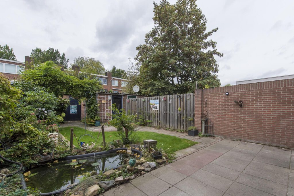 De woning heeft een ruime achtertuin gelegen op het zonnige noordwesten. Door de diepte van de tuin is er altijd een plekje in de zon of schaduw te vinden. De tuin is netjes aangelegd met gazon, sierbestrating en plantenborders met veel groen. Ook heeft de tuin een vijver. Achterin de tuin vindt u de vrijstaande stenen berging (ca. 8 m²) en de achterom.