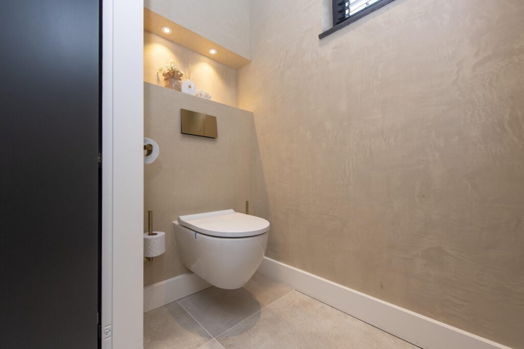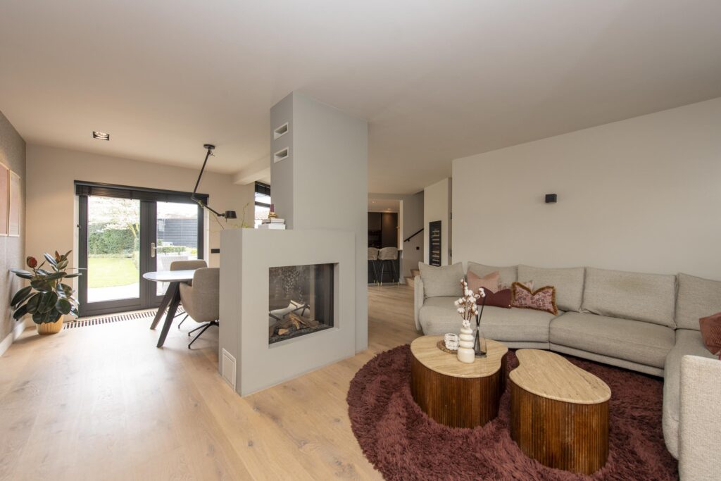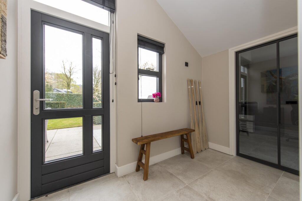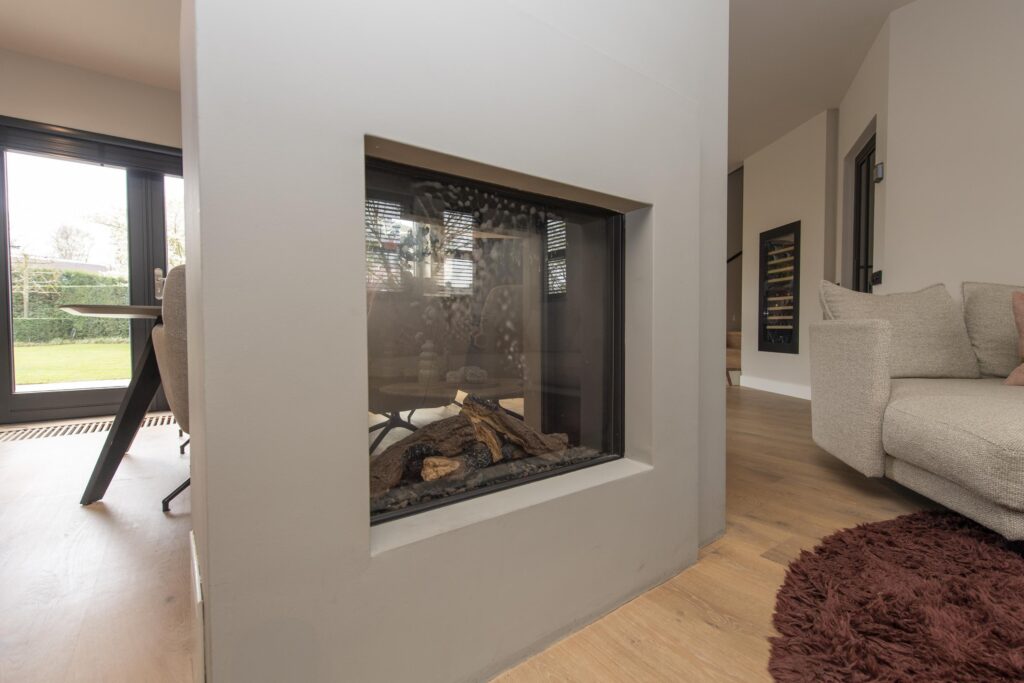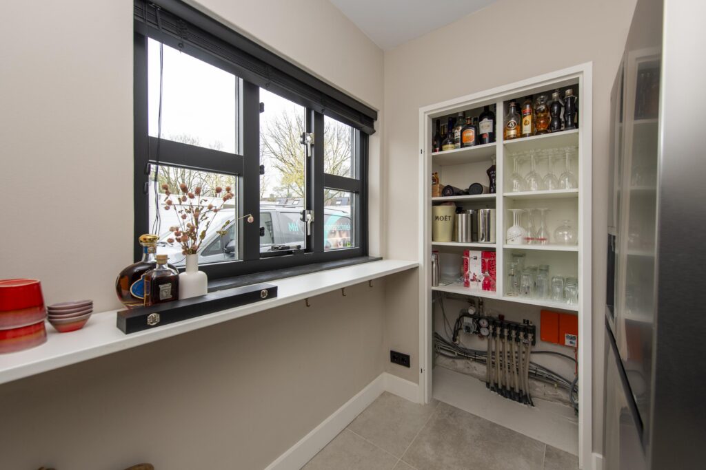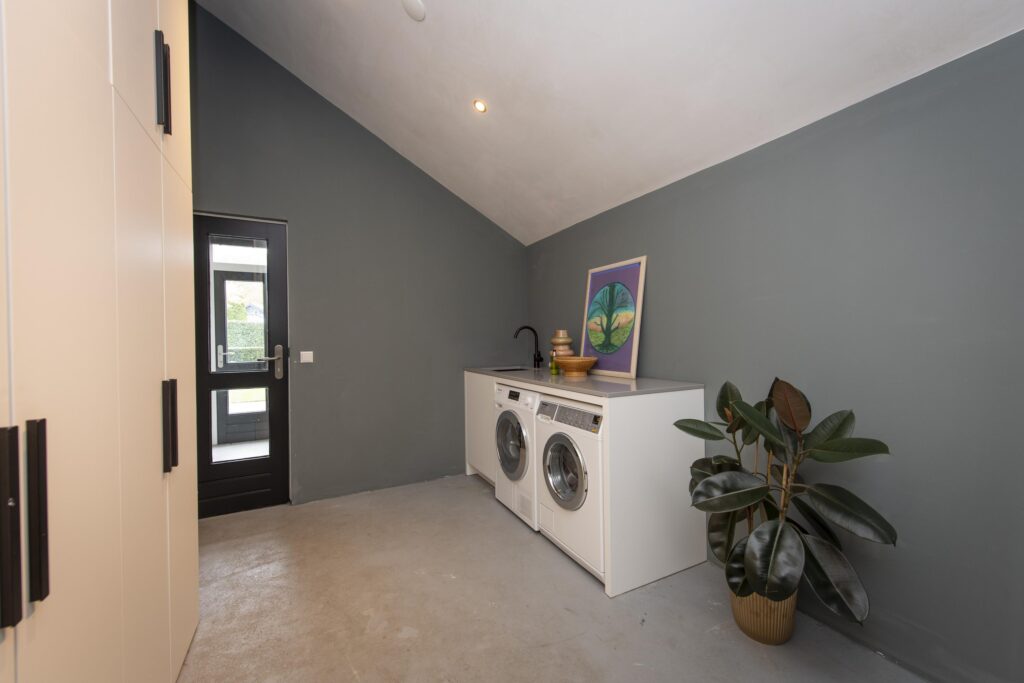Via de entree komt u in de hal met toegang tot de woonkamer, toiletruimte en de meterkast (18 groepen). De ruime toiletruimte is voorzien van een hangend toilet en een fonteintje. De prachtige woonkamer is afgewerkt met stucwerk op de wanden en plafonds en een houten vloer. Daarnaast is de woonkamer voorzien van en een sfeervolle gashaard, wat zorgt voor extra comfort en een aangename leefruimte. Door de grote raampartijen komt er veel daglicht de ruimte binnen. Via openslaande deuren heeft u vanuit de woonkamer toegang tot de achtertuin. De luxe keuken is uitgevoerd met een kookeiland en een kastenwand en is voorzien van alle gemakken. Zo vindt u hier een Bora inductiekookplaat met geïntegreerde afzuiging, een spoelbak met Quooker, vaatwasser, combi-magnetron, oven, koelkast en een vriezer. Ook is strak in de muur een wijnkoelkast geïntegreerd. Aansluitend aan de keuken bevinden zich de bijkeuken met ruimte voor bijvoorbeeld een extra koelkast en voorraad. Via een deur, die prachtig in de kastenwand van de keuken is verwerkt, heeft u toegang tot een gang. Via deze gang bereikt u een extra kamer en de berging. De kamer kan uitstekend gebruikt worden als bijvoorbeeld kantoor, speelkamer of hobbyruimte. Prettig detail is dat deze ruimte een eigen ingang heeft vanaf de oprit. In de inpandige berging vindt u naast handige bergruimte ook de aansluitingen voor de wasapparatuur. Ook deze ruimte is toegankelijk vanaf de oprit. De hal, toilet, keuken, bijkeuken en (de doorgang naar) het kantoor zijn voorzien van vloerverwarming.