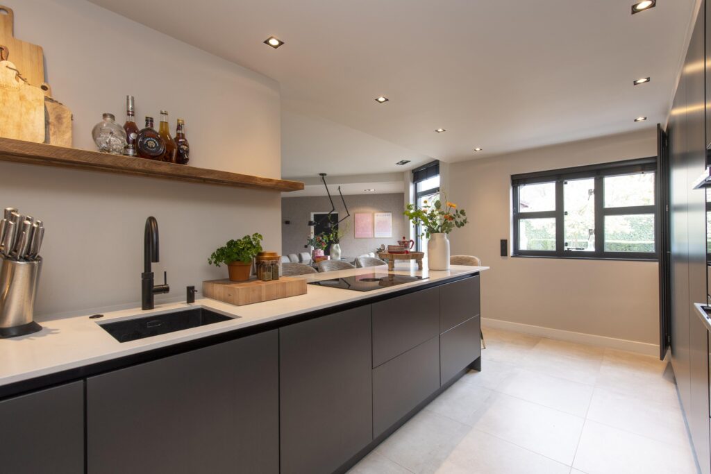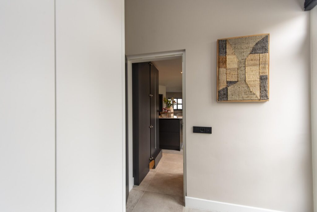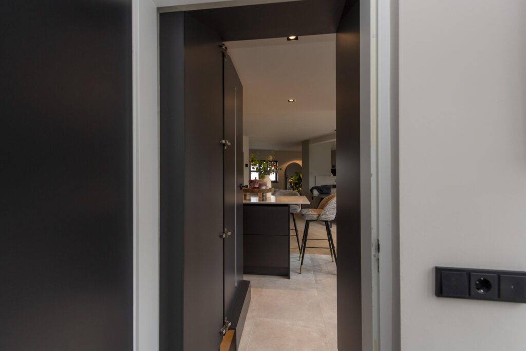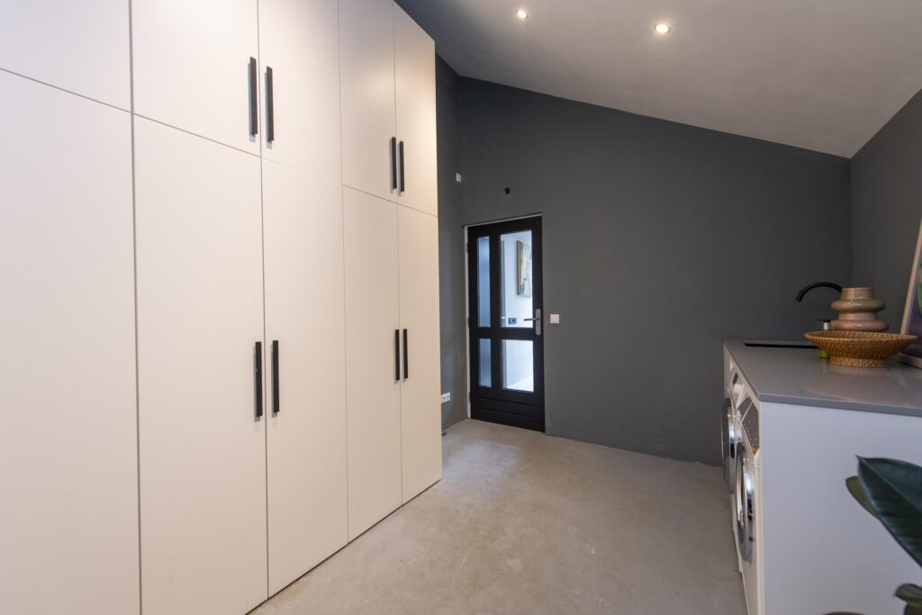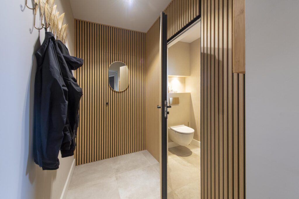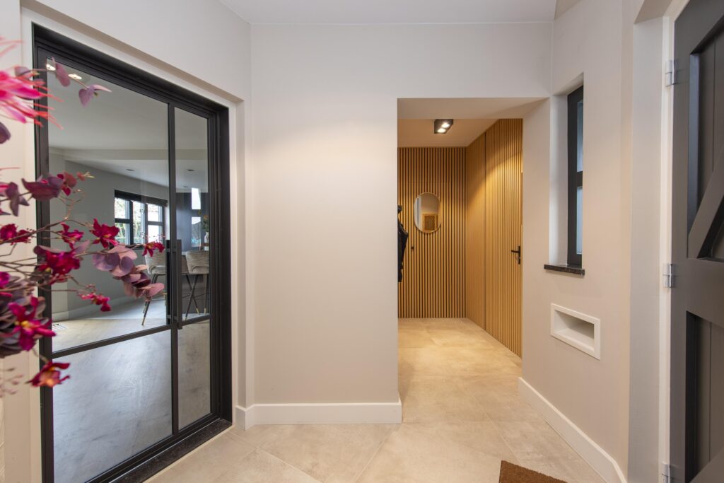 Via de entree komt u in de hal met toegang tot de woonkamer, toiletruimte en de meterkast (18 groepen). De ruime toiletruimte is voorzien van een hangend toilet en een fonteintje. De prachtige woonkamer is afgewerkt met stucwerk op de wanden en plafonds en een houten vloer. Daarnaast is de woonkamer voorzien van en een sfeervolle gashaard, wat zorgt voor extra comfort en een aangename leefruimte. Door de grote raampartijen komt er veel daglicht de ruimte binnen. Via openslaande deuren heeft u vanuit de woonkamer toegang tot de achtertuin. De luxe keuken is uitgevoerd met een kookeiland en een kastenwand en is voorzien van alle gemakken. Zo vindt u hier een Bora inductiekookplaat met geïntegreerde afzuiging, een spoelbak met Quooker, vaatwasser, combi-magnetron, oven, koelkast en een vriezer. Ook is strak in de muur een wijnkoelkast geïntegreerd. Aansluitend aan de keuken bevinden zich de bijkeuken met ruimte voor bijvoorbeeld een extra koelkast en voorraad. Via een deur, die prachtig in de kastenwand van de keuken is verwerkt, heeft u toegang tot een gang. Via deze gang bereikt u een extra kamer en de berging. De kamer kan uitstekend gebruikt worden als bijvoorbeeld kantoor, speelkamer of hobbyruimte. Prettig detail is dat deze ruimte een eigen ingang heeft vanaf de oprit. In de inpandige berging vindt u naast handige bergruimte ook de aansluitingen voor de wasapparatuur. Ook deze ruimte is toegankelijk vanaf de oprit. De hal, toilet, keuken, bijkeuken en (de doorgang naar) het kantoor zijn voorzien van vloerverwarming.