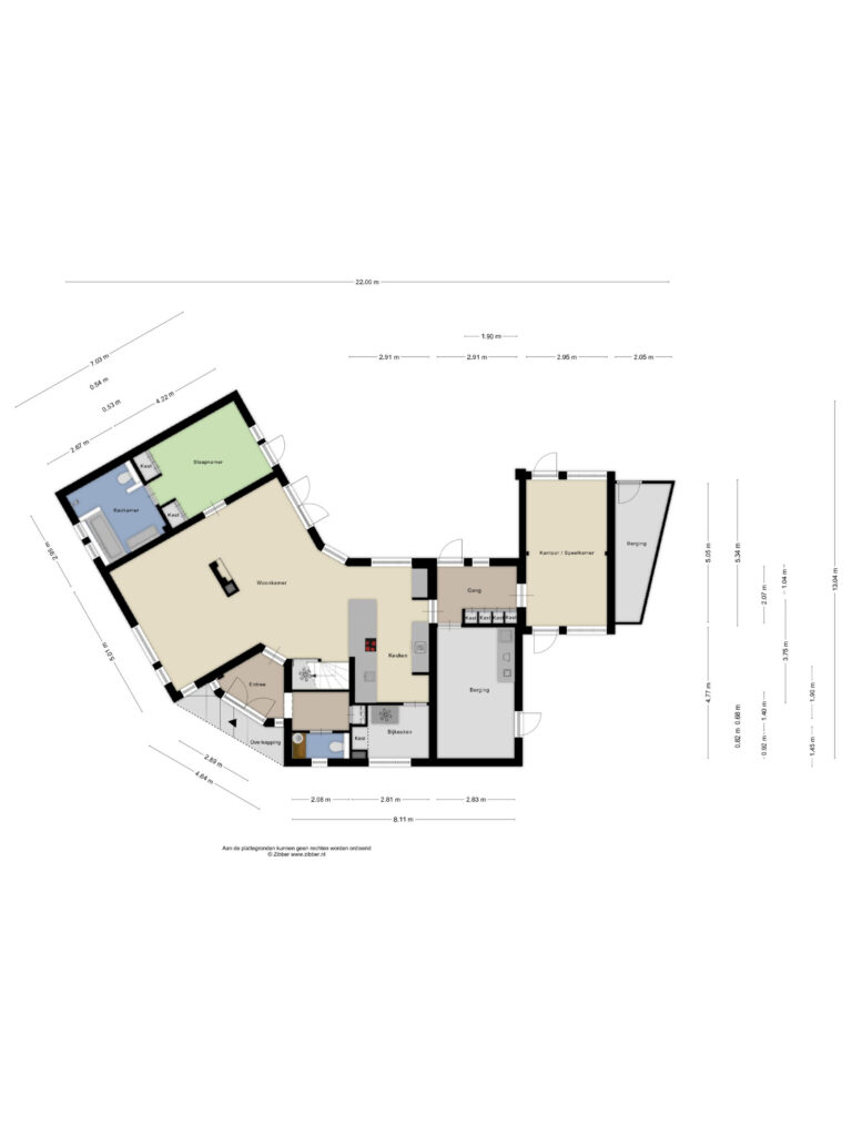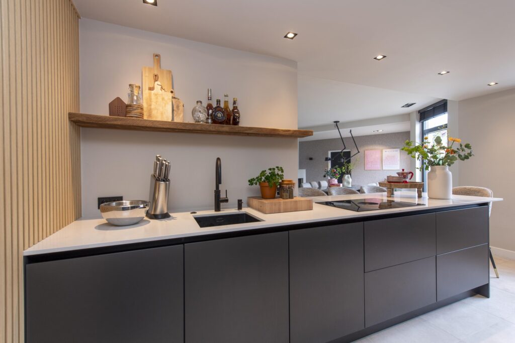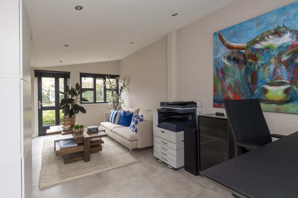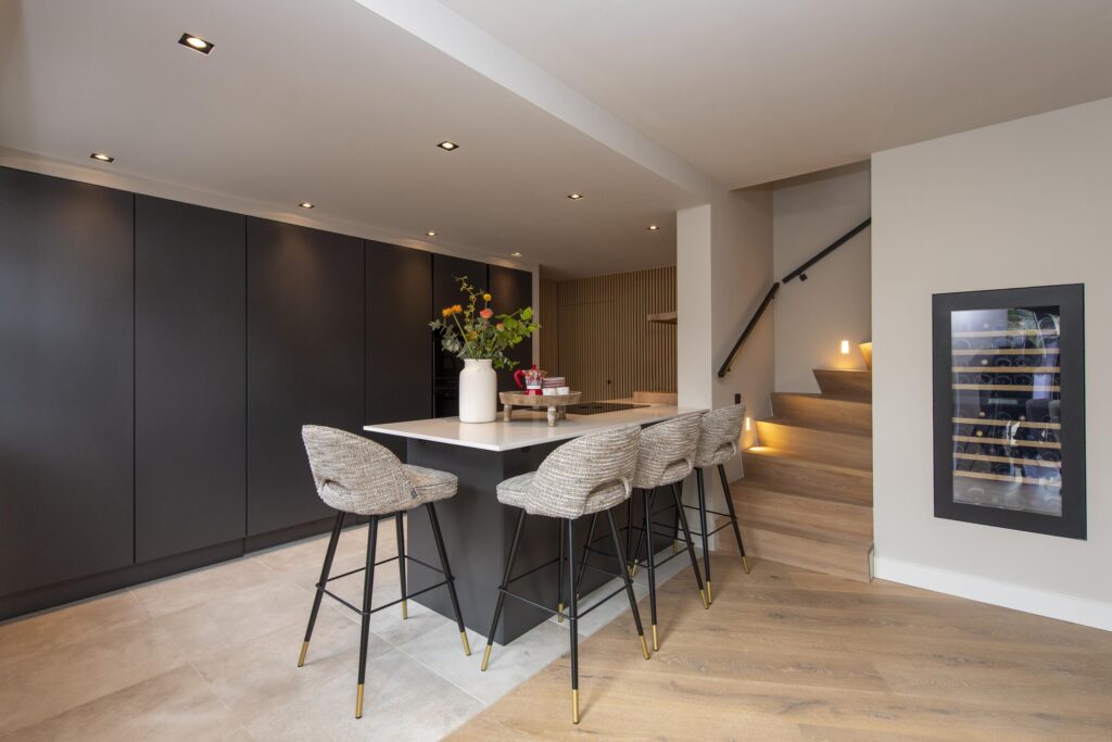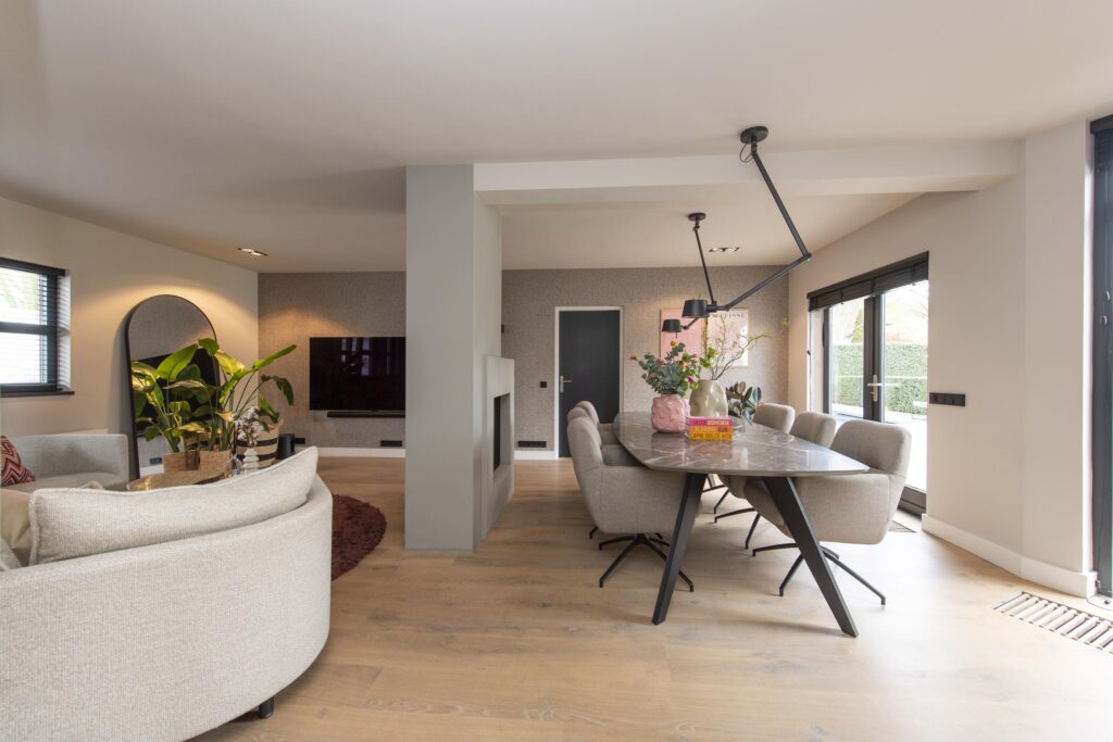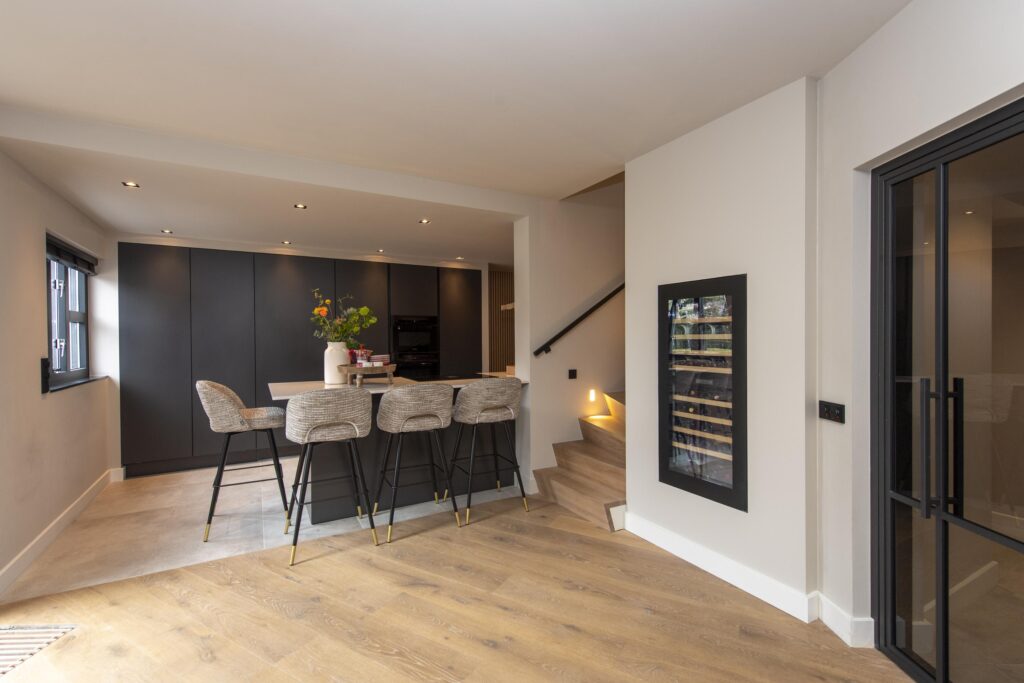 Via de entree komt u in de hal met toegang tot de woonkamer, toiletruimte en de meterkast (18 groepen). De ruime toiletruimte is voorzien van een hangend toilet en een fonteintje. De prachtige woonkamer is afgewerkt met stucwerk op de wanden en plafonds en een houten vloer. Daarnaast is de woonkamer voorzien van en een sfeervolle gashaard, wat zorgt voor extra comfort en een aangename leefruimte. Door de grote raampartijen komt er veel daglicht de ruimte binnen. Via openslaande deuren heeft u vanuit de woonkamer toegang tot de achtertuin. De luxe keuken is uitgevoerd met een kookeiland en een kastenwand en is voorzien van alle gemakken. Zo vindt u hier een Bora inductiekookplaat met geïntegreerde afzuiging, een spoelbak met Quooker, vaatwasser, combi-magnetron, oven, koelkast en een vriezer. Ook is strak in de muur een wijnkoelkast geïntegreerd. Aansluitend aan de keuken bevinden zich de bijkeuken met ruimte voor bijvoorbeeld een extra koelkast en voorraad. Via een deur, die prachtig in de kastenwand van de keuken is verwerkt, heeft u toegang tot een gang. Via deze gang bereikt u een extra kamer en de berging. De kamer kan uitstekend gebruikt worden als bijvoorbeeld kantoor, speelkamer of hobbyruimte. Prettig detail is dat deze ruimte een eigen ingang heeft vanaf de oprit. In de inpandige berging vindt u naast handige bergruimte ook de aansluitingen voor de wasapparatuur. Ook deze ruimte is toegankelijk vanaf de oprit. De hal, toilet, keuken, bijkeuken en (de doorgang naar) het kantoor zijn voorzien van vloerverwarming.