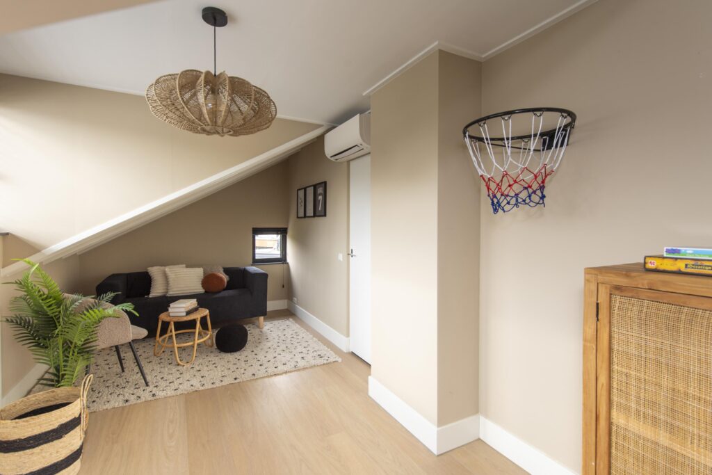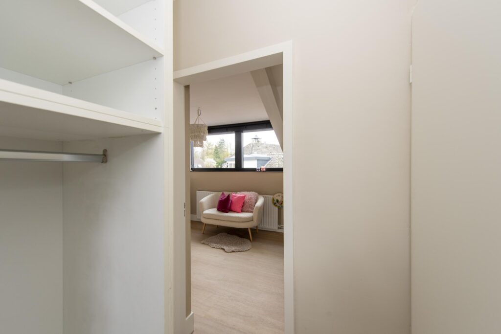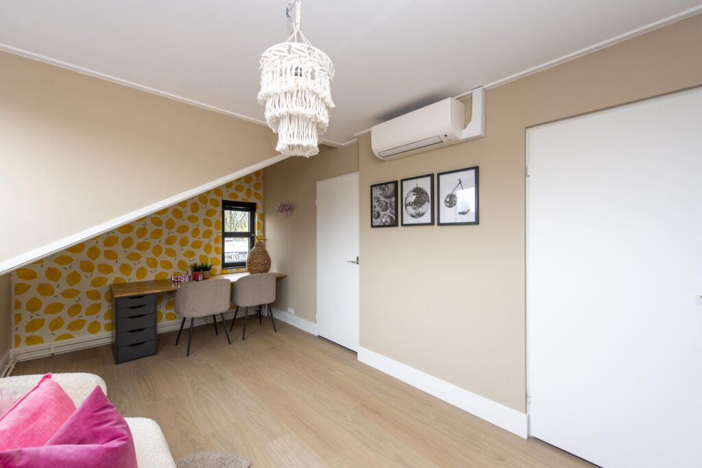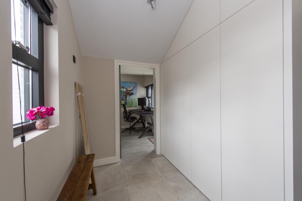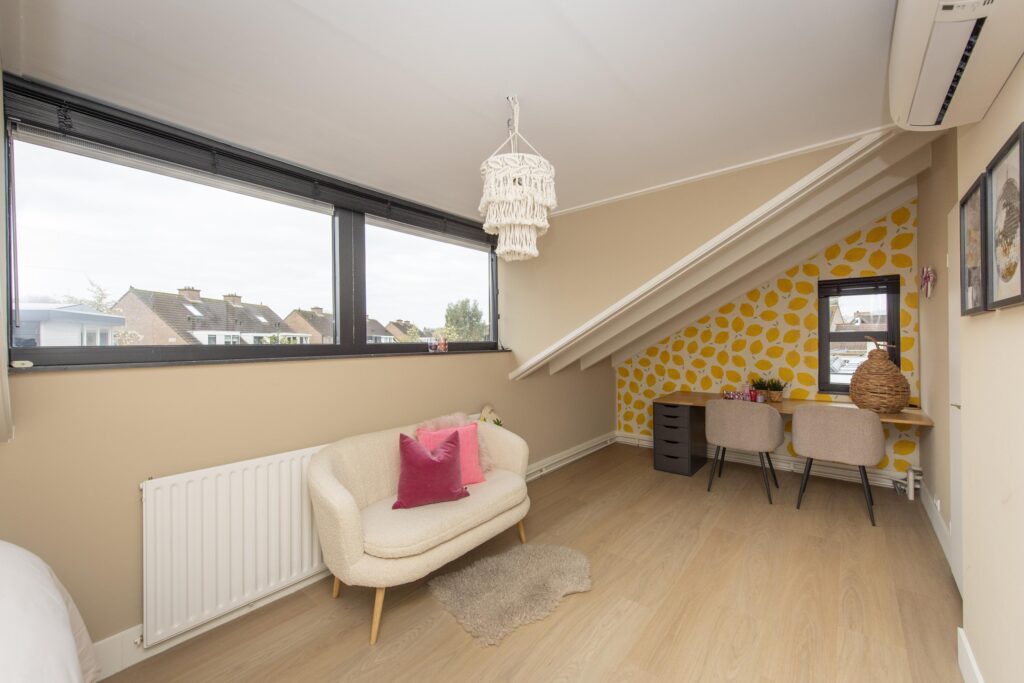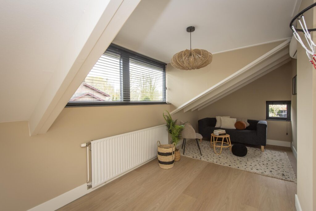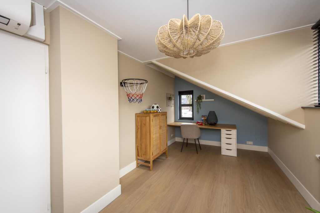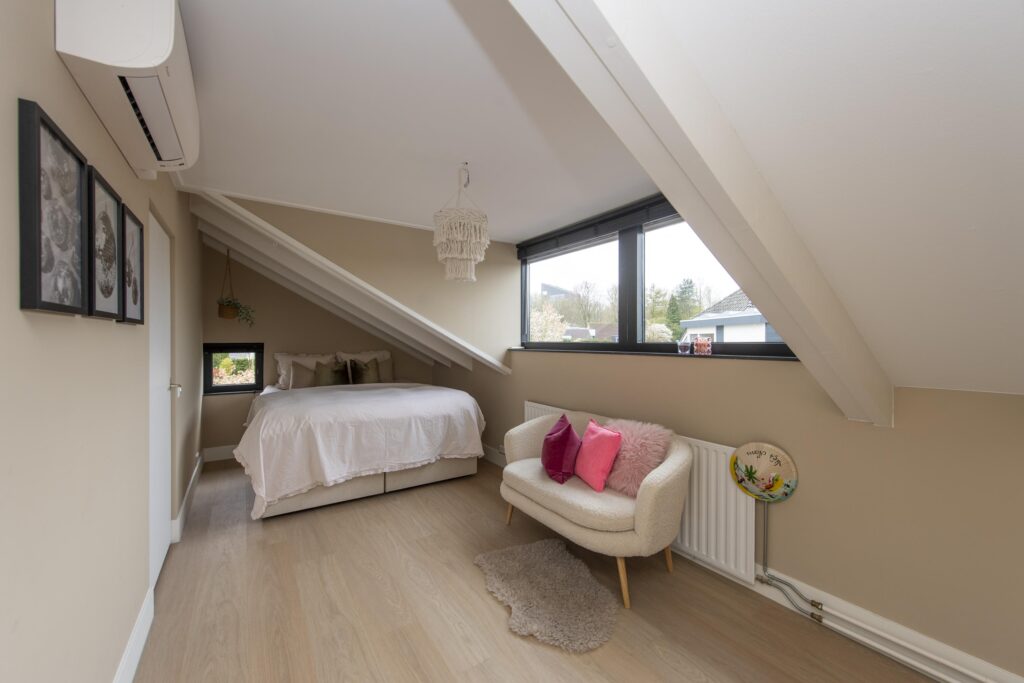 Via de trap bereikt u de ruime overloop, die door zijn royale afmetingen uitstekend geschikt is als extra kantoorruimte, tv-kamer of speelkamer. Vanuit deze centrale ruimte heeft u toegang tot de verschillende vertrekken op deze verdieping. Aan de linkerzijde bevindt zich een ruime slaapkamer met een speelse kapconstructie, wat zorgt voor extra sfeer en karakter. Naast deze slaapkamer ligt de badkamer, voorzien van een douche, dubbele wastafel in meubel en een toilet. Aan de rechterzijde van de verdieping bevindt zich de tweede slaapkamer, eveneens met een prettig lichtinval en speelse indeling. Vanuit deze slaapkamer heeft u toegang tot een walk-in closet en een aparte berging, ideaal voor het opbergen van kleding en bijvoorbeeld seizoensspullen. De slaapkamers en de overloop zijn strak afgewerkt met stucwerk op de wanden en een mooie PVC vloer. Ook zijn beide voorzien van airconditioning. Deze verdieping biedt door de indeling en de grote overloop verrassende mogelijkheden.