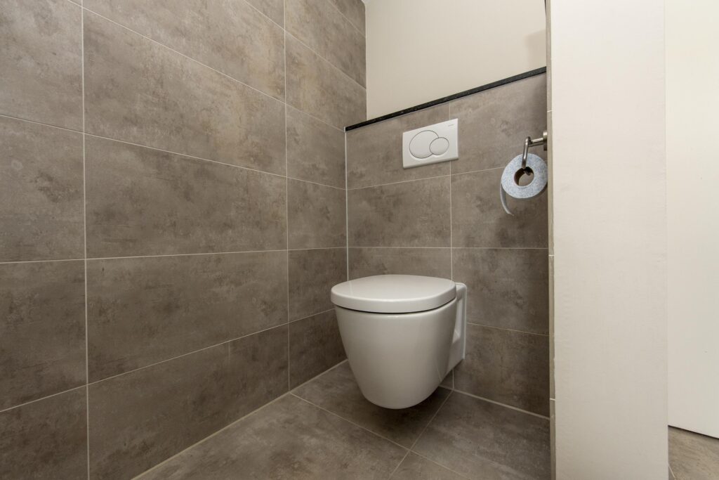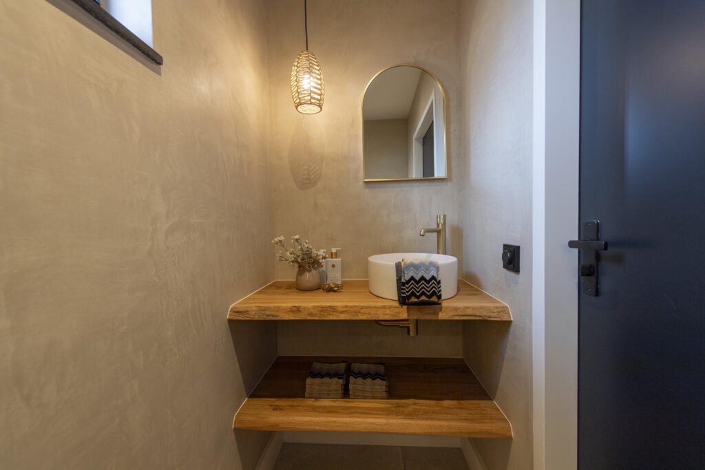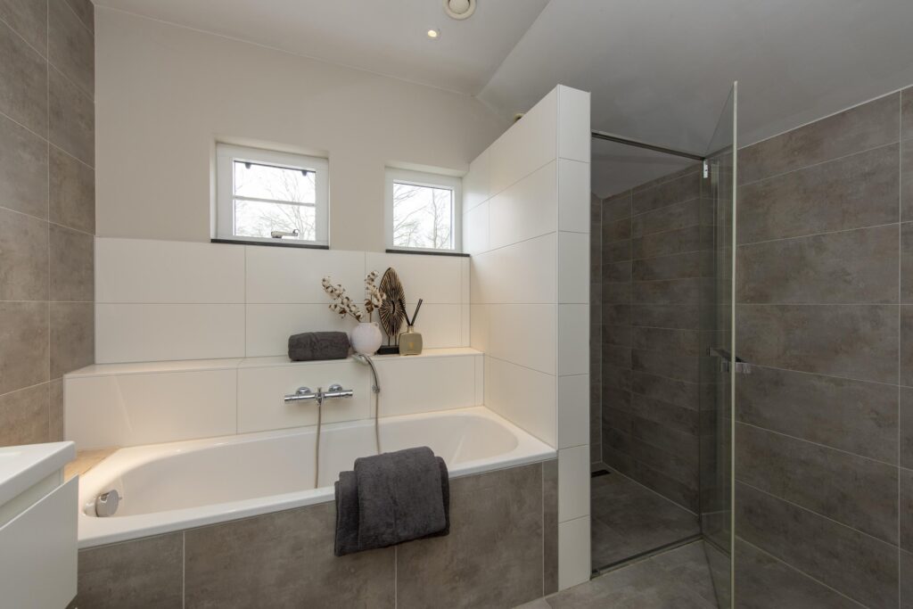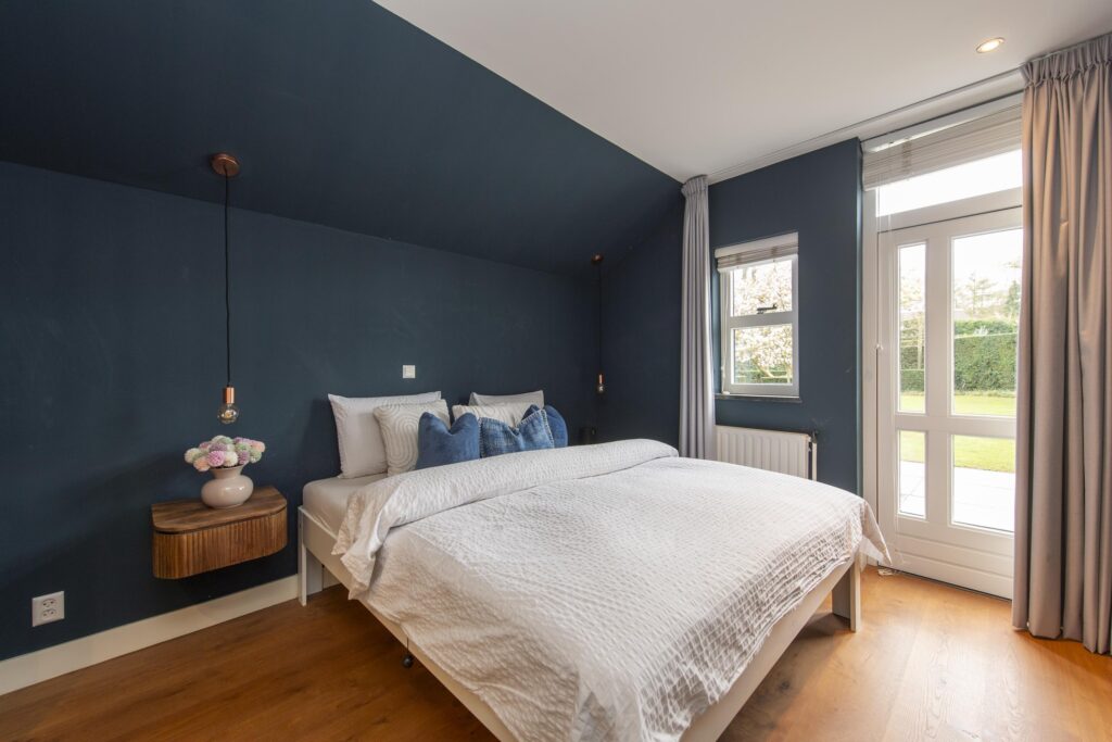 De slaapkamer op de begane grond is afgewerkt met een houten vloer en stucwerk op de wanden en het plafond. Vanuit de slaapkamer geeft een deur direct toegang tot de achtertuin, wat deze kamer uitermate geschikt maakt als ouderslaapkamer. De badkamer is compleet uitgevoerd en voorzien van een douche, ligbad, dubbele wastafel in meubel en een toilet.