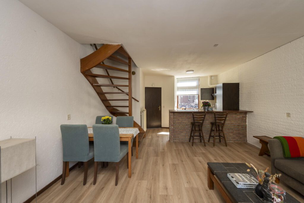 De hal/entree geeft toegang de meterkast, toiletruimte en de woonkamer. De toiletruimte is betegeld en is voorzien van een staand toilet en een fonteintje. De keuken is gelegen aan de voorzijde van de woning en heeft een eenvoudig keukenblok in rechte opstelling en een bar. Het keukenblok is voorzien van een RVS spoelbak. Daarnaast heeft de keuken een afzuigkap en een losse gaskookplaat en koelkast (blijven niet achter). De keuken staat in open verbinding met de woonkamer. Door de grote raampartij aan zowel de voor- als achterzijde komt er veel daglicht de ruimte binnen. Aan de achterzijde heeft u via een deur toegang tot de achtertuin. De volledige begane grond is afgewerkt met een vinyl vloer.