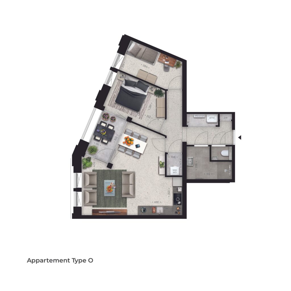 Type O, gelegen op de 14e tot en met 19e verdieping, is een appartement op het zuidoosten met een woningoppervlakte van 74 m². Het balkon bevindt zich op het zuidoosten, waar je heerlijk kan genieten van de zon. Het appartement heeft een woonkamer met open keuken van 31 m², slaapkamers van 11 m² & 9 m² en een volledig ingerichte badkamer en separaat toilet.