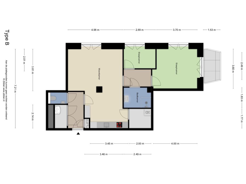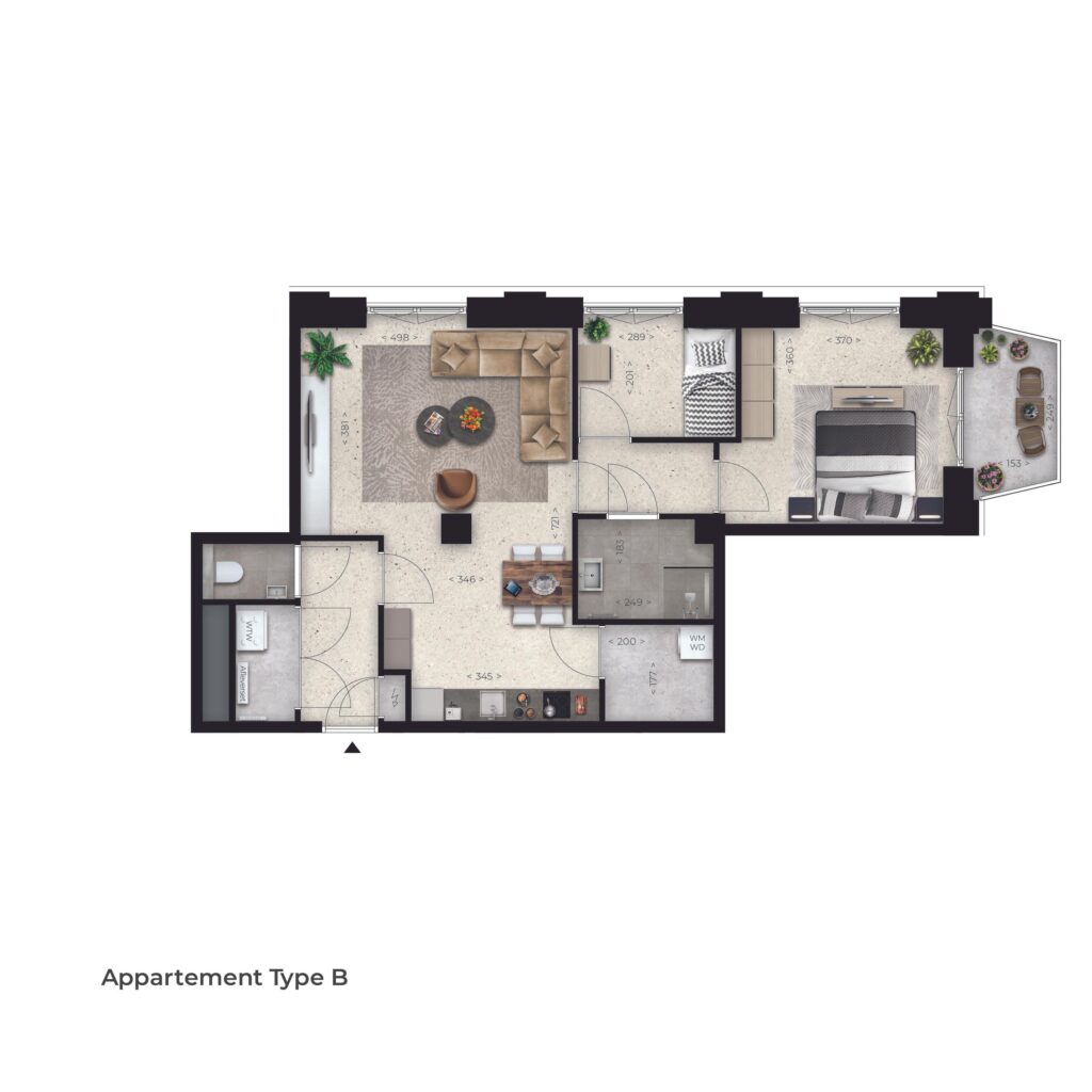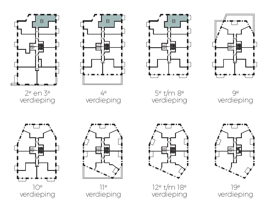 Type B, gelegen op de 2e tot en met 8e verdieping, is een hoek appartement op het zuidwesten met een woningoppervlakte van 75 m². Het balkon bevindt zich op de westzijde, waar je heerlijk kan genieten van de avondzon. Het appartement heeft een woonkamer met open keuken van 36 m², een slaapkamer van 16 m², een volledig ingerichte badkamer en separaat toilet.