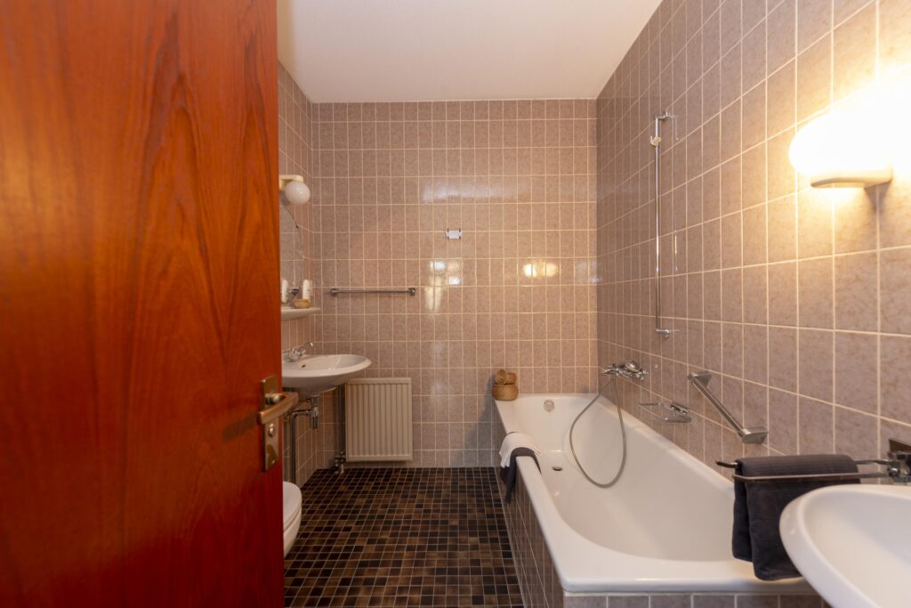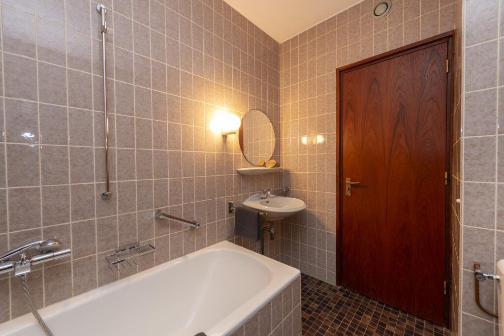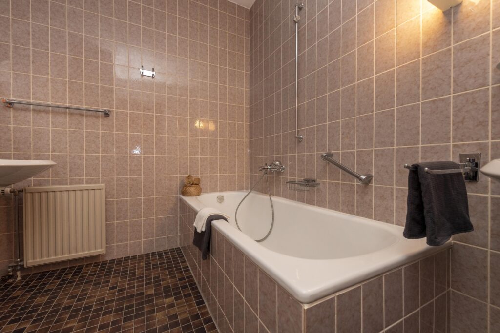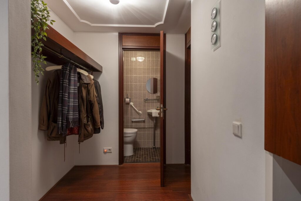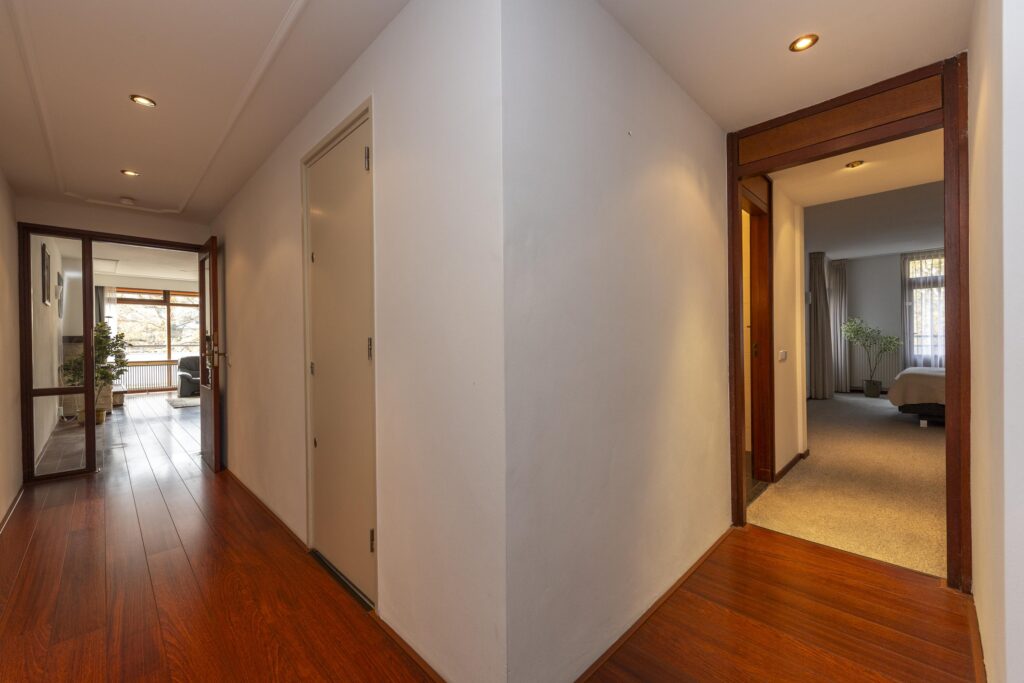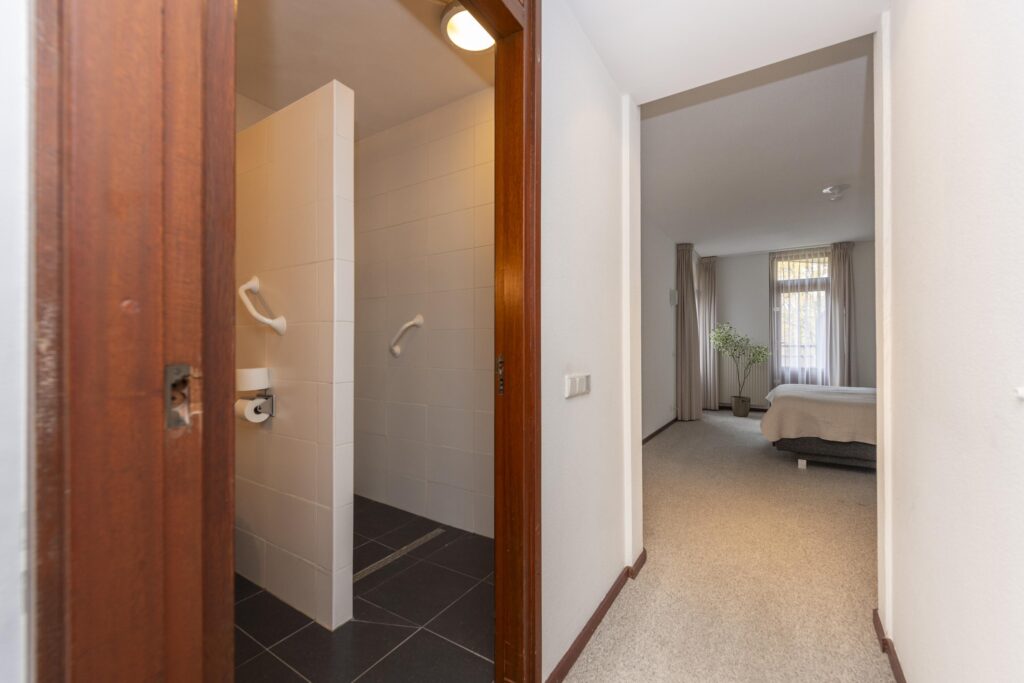 Vanaf de kleinschalige portiek heeft u toegang tot het appartement. De entree geeft toegang tot verschillende ruimtes van het appartement. Ook vindt u hier de garderobe, toiletruimte en een handige bergruimte met de aansluitingen voor de wasapparatuur. De toiletruimte is betegeld en voorzien van een staand toilet en een fonteintje.
