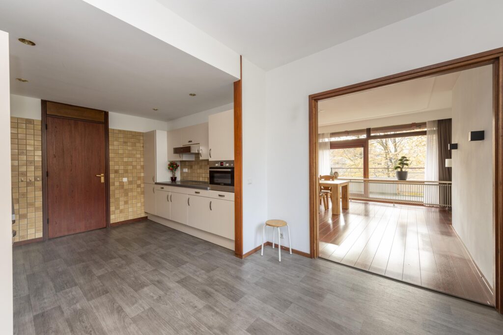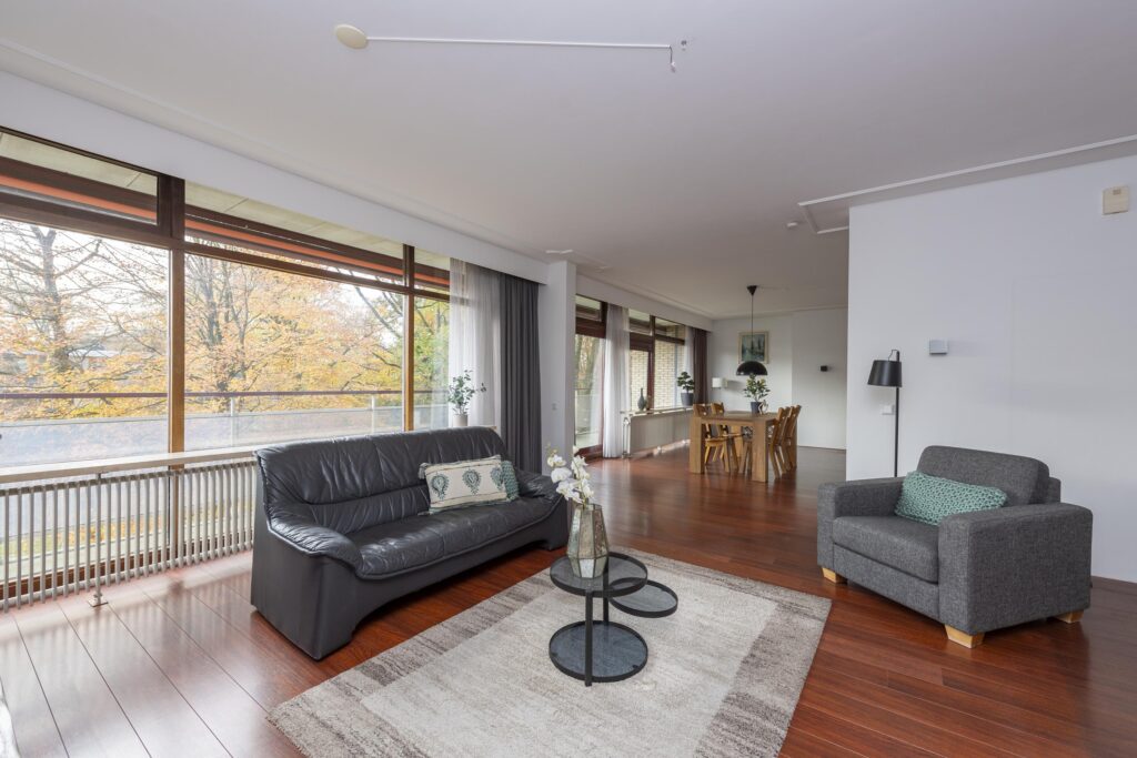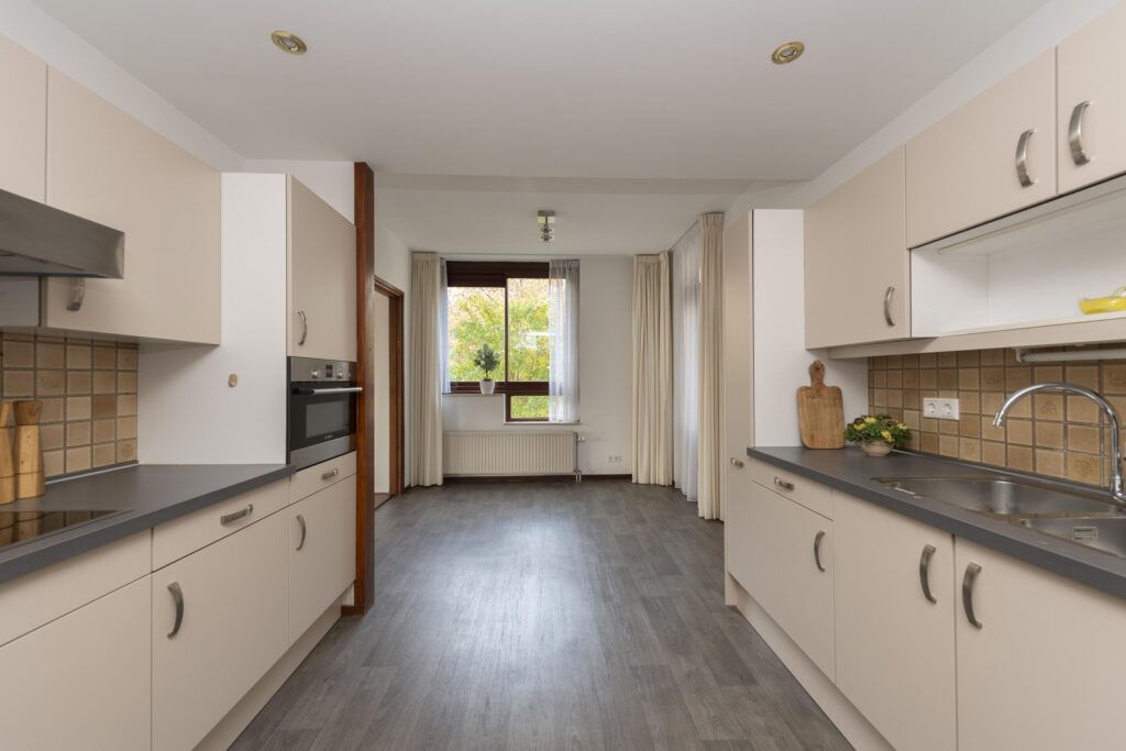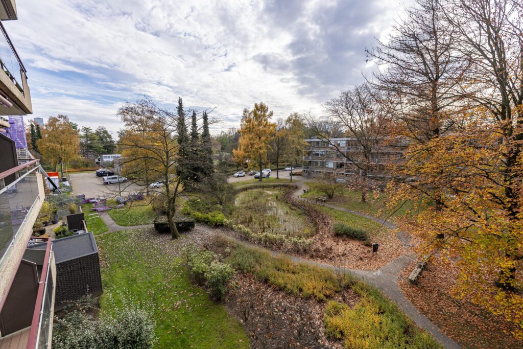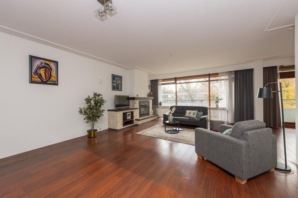 De zeer riante woonkamer heeft en L-vorm en is keurig afgewerkt met een laminaatvloer en stucwerk op de wanden en het plafond. Bij het zitgedeelte vindt u daarnaast een sfeervolle gashaard. Door de grote raampartij komt er veel prettig daglicht de ruimte binnen. Via een schuifpui heeft u vanuit de woonkamer toegang tot het balkon. Het balkon is ca. 17 m² groot en is gelegen op het zonnige zuiden. Vanaf het balkon heeft u een prachtig uitzicht over de groene omgeving en de ondergelegen vijver. De keuken staat in open verbinding met de woonkamer en heeft een dubbel keukenblok. De keuken is voorzien van een RVS spoelbak, keramische kookplaat, afzuigkap, koelkast, vriezer en een combi-oven.