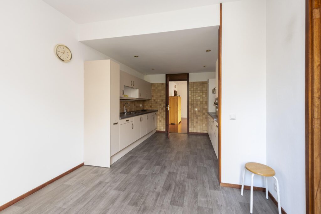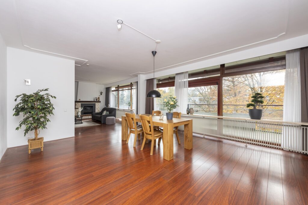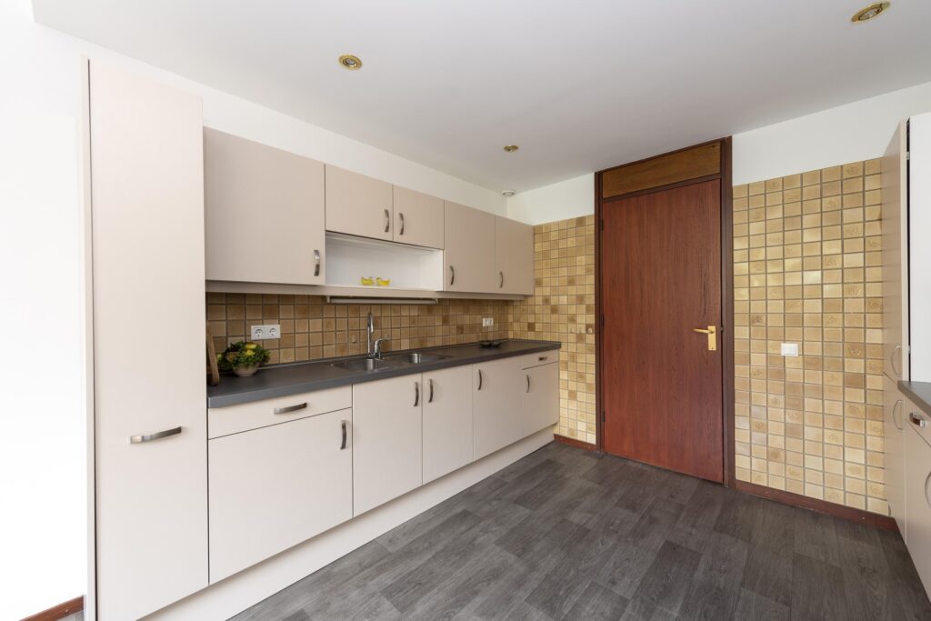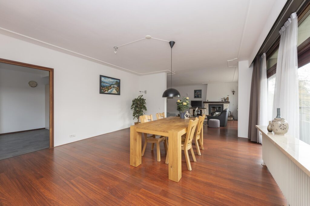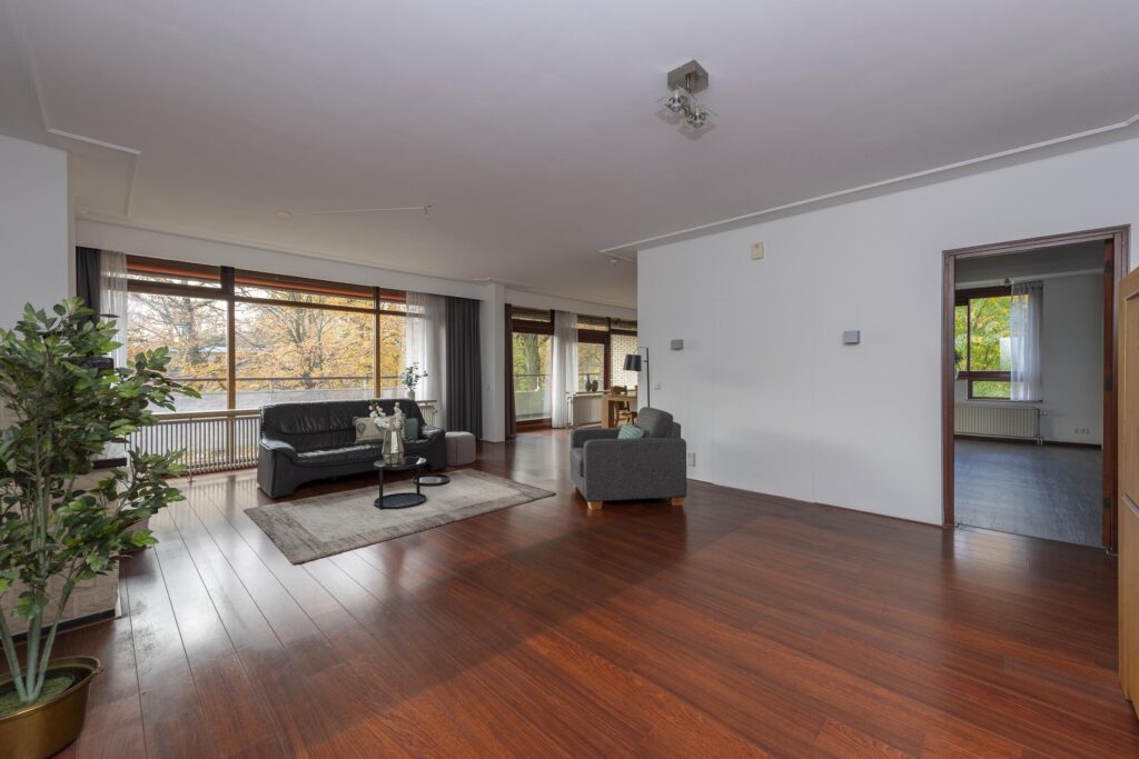 De zeer riante woonkamer heeft en L-vorm en is keurig afgewerkt met een laminaatvloer en stucwerk op de wanden en het plafond. Bij het zitgedeelte vindt u daarnaast een sfeervolle gashaard. Door de grote raampartij komt er veel prettig daglicht de ruimte binnen. Via een schuifpui heeft u vanuit de woonkamer toegang tot het balkon. Het balkon is ca. 17 m² groot en is gelegen op het zonnige zuiden. Vanaf het balkon heeft u een prachtig uitzicht over de groene omgeving en de ondergelegen vijver. De keuken staat in open verbinding met de woonkamer en heeft een dubbel keukenblok. De keuken is voorzien van een RVS spoelbak, keramische kookplaat, afzuigkap, koelkast, vriezer en een combi-oven.