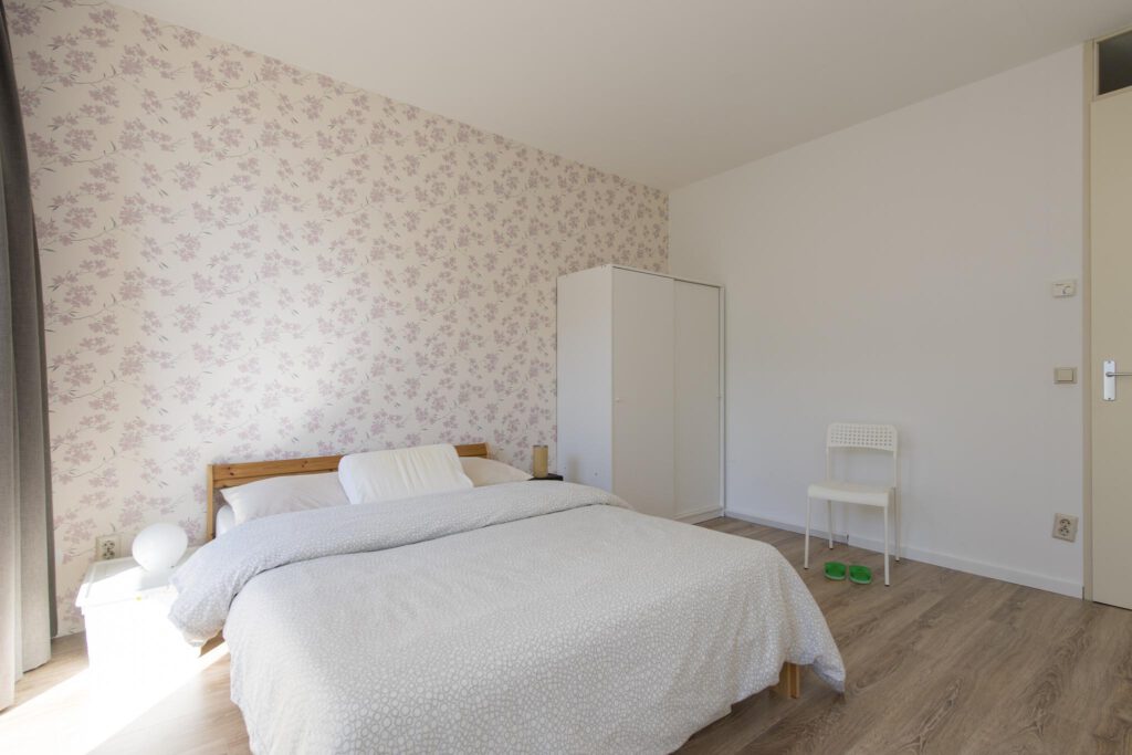 Beide slaapkamers zijn voorzien van dezelfde laminaatvloer als de hal en de woonkamer. Tevens zijn de muren ook hier voorzien van stukwerk. Beide slaapkamers geven via een deur toegang tot het een balkon (ca. 9,5 m² & 4 m²). De badkamer is volledig betegeld en voorzien van een inloopdouche en een wastafel in meubel. De toiletruimte is deels betegeld en is voorzien van een hangend toilet en een fonteintje.