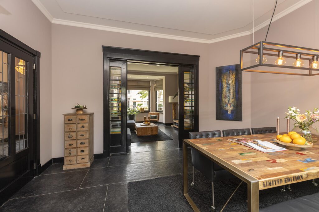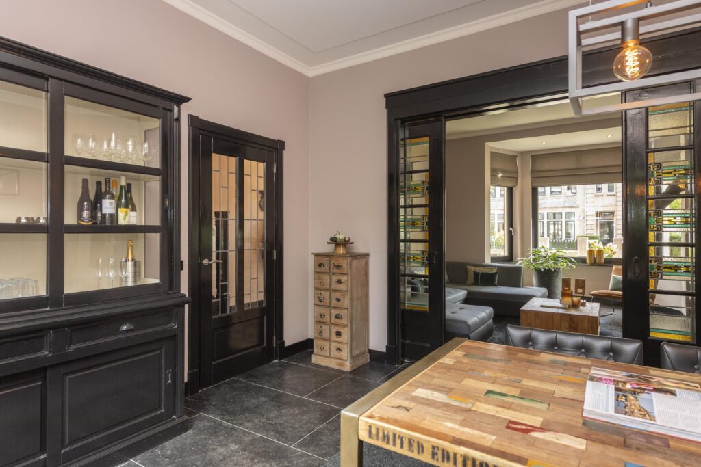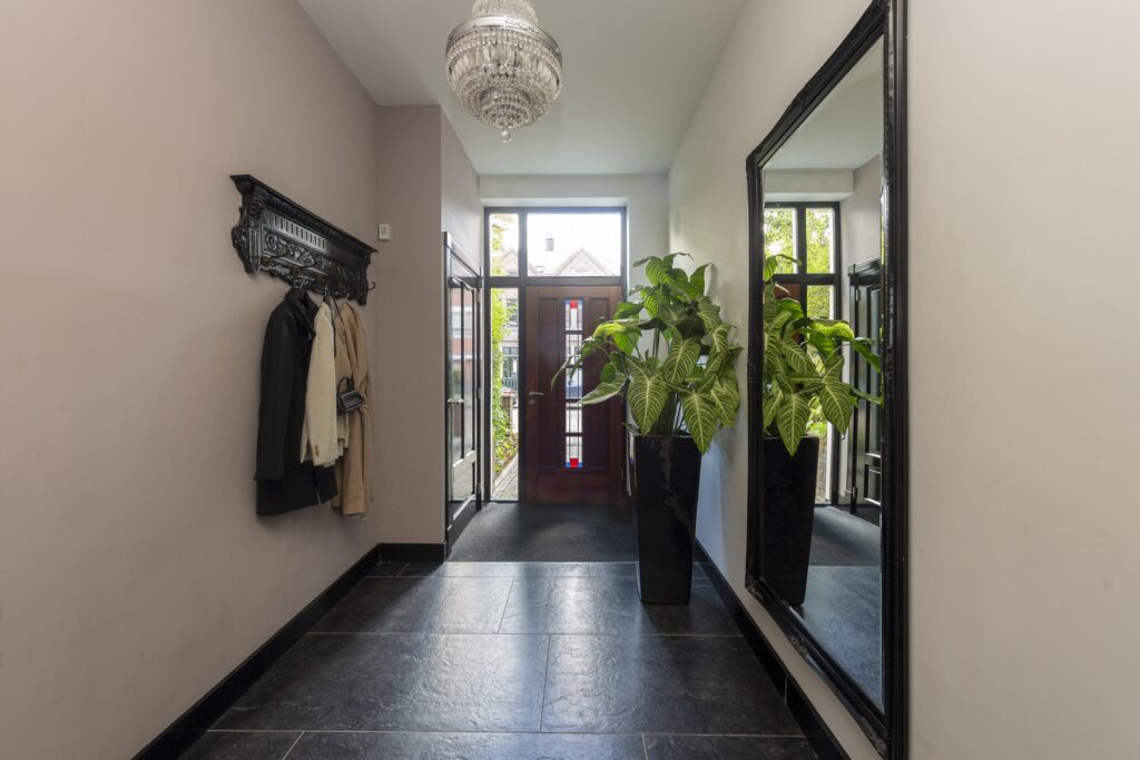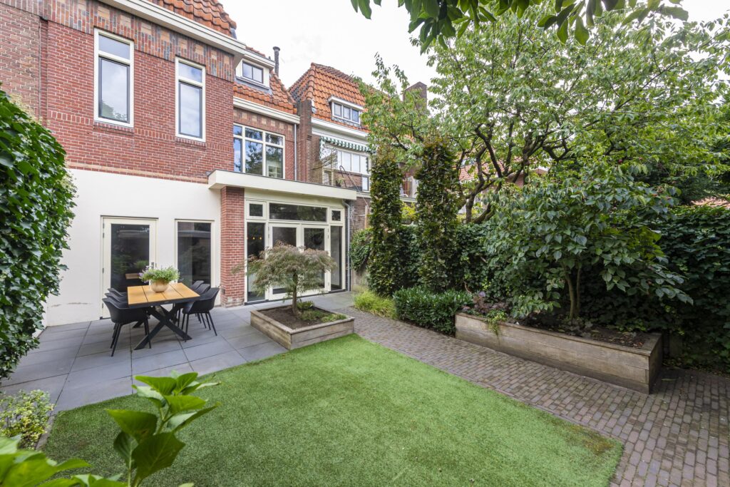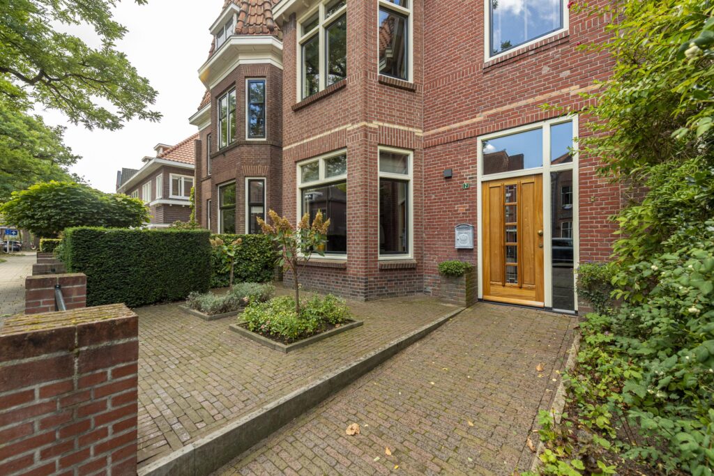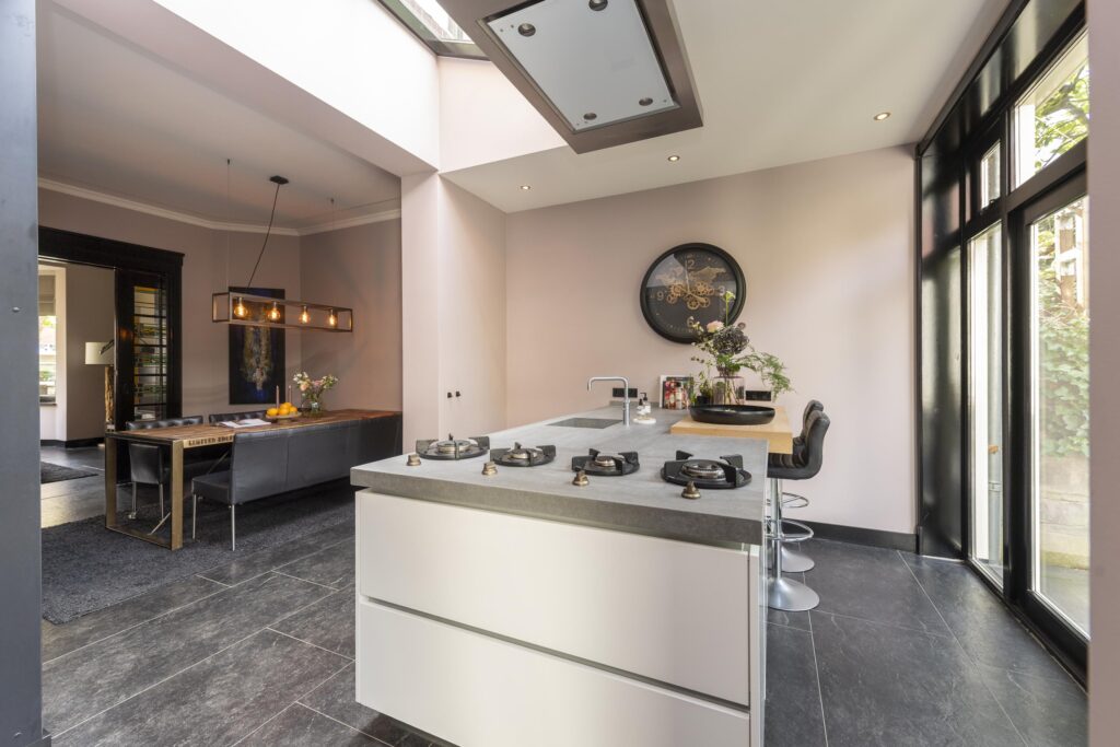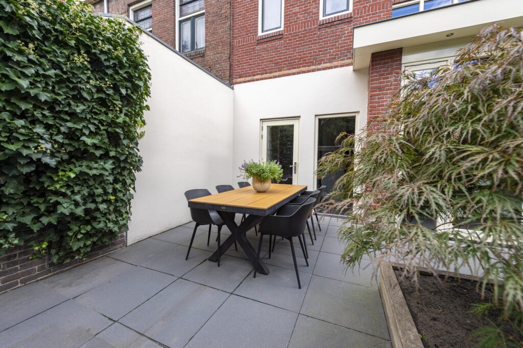 We stappen de woning binnen via de statige entree waardoor u direct wordt verrast door de ruimtelijke indeling van de begane grond. De entree is royaal opgezet en biedt toegang tot de meterkast, trapopgang, twee kasten en het woongedeelte. De sfeervolle woonkamer aan de voorzijde van de woning kenmerkt zich door een charmante erker, die zorgt voor veel natuurlijk lichtinval en een prachtig uitzicht op de rustige en groene straat. De ensuite-indeling met schuifdeuren met het originele Glas-in-lood, leidt je naar de ruime eetkamer, een ideale plek voor lange diners en andere gezellige momenten. De eetkamer staat in directe verbinding met de moderne keuken aan de achterzijde. Deze keuken heeft een royaal eiland, een kastenwand en hoogwaardige inbouwapparatuur. De keuken is voorzien van een RVS spoelbak met Quooker, vaatwasser, 4-pits gasfornuis, afzuigkap, combi-oven, koffieautomaat, koelkast en een vriezer. Ook heeft de keuken een lichtstraat voor extra lichtinval. Dankzij de dubbele openslaande tuindeuren stap je zo de zonnige achtertuin in, perfect voor wie binnen en buiten graag laat samenkomen. Naast de keuken bevindt zich een praktische gang met extra kastruimte, de toiletruimte en toegang tot de tuin. De ruime toiletruimte is betegeld en voorzien van een hangend toilet en een fonteintje met meubel. De volledige begane grond is afgewerkt met een mooie tegelvloer (met vloerverwarming) en strak stucwerk op de wanden en plafonds.