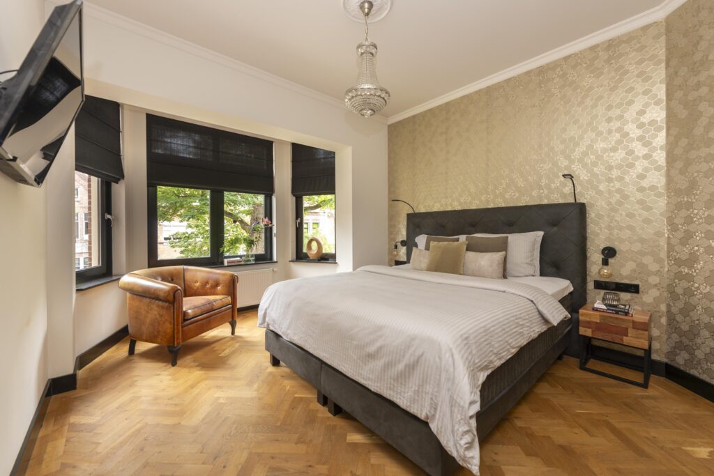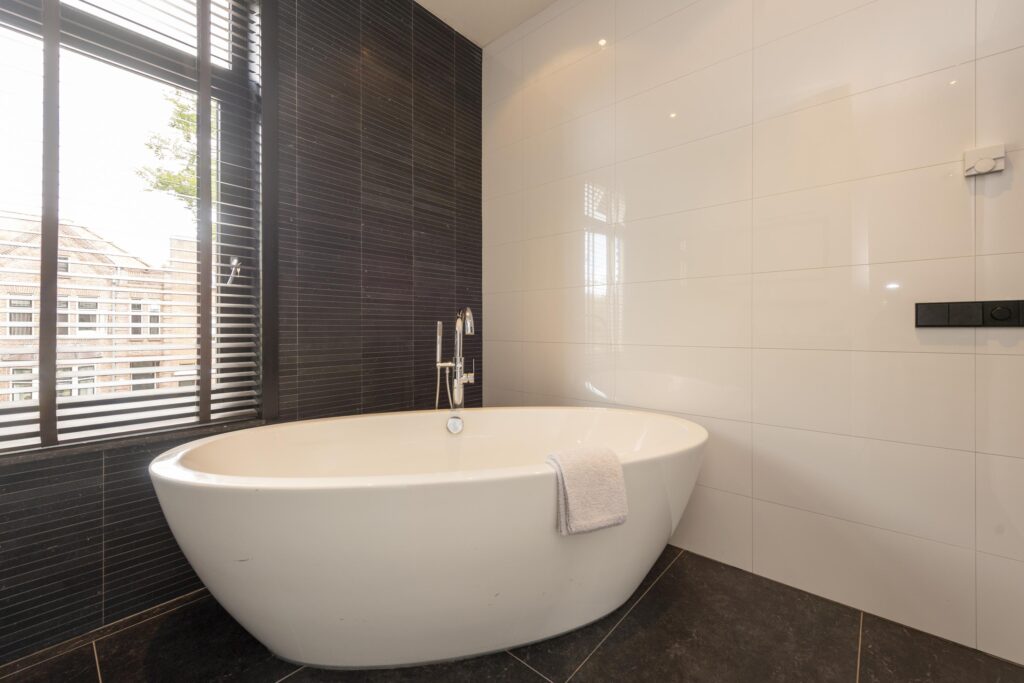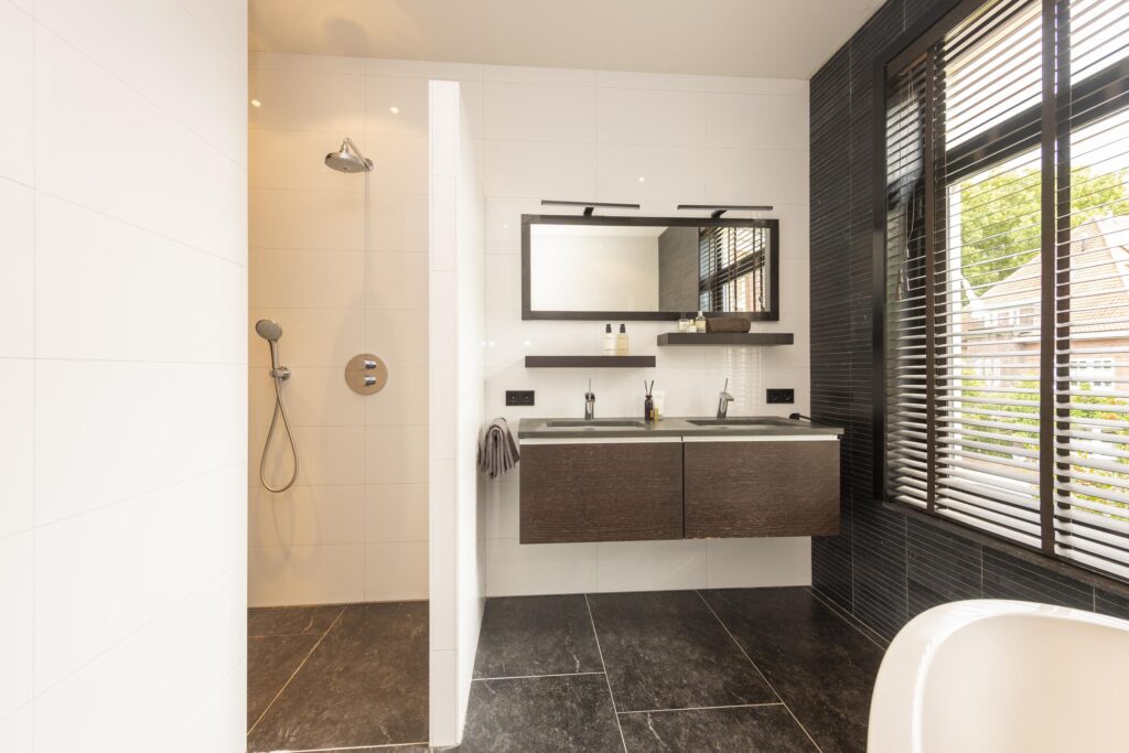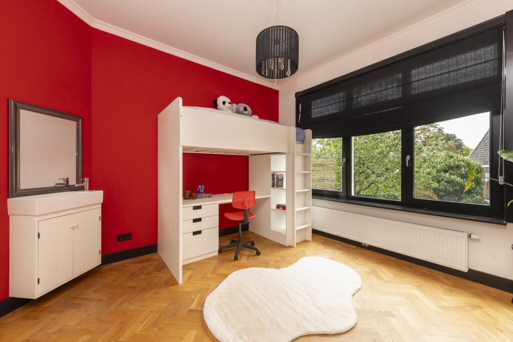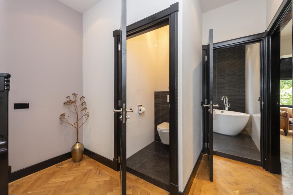 Ook de eerste verdieping biedt volop ruimte en comfort. De overloop geeft toegang tot twee slaapkamers, de badkamer, separate toiletruimte en de walk-in closet. Aan de voorzijde ligt een royale slaapkamer met karakteristieke erker die zorgt voor veel lichtinval en een sfeervolle uitstraling. De tweede slaapkamer is gelegen aan de achterzijde van de woning. Beide slaapkamers zijn prachtig afgewerkt met een parketvloer en strak stucwerk op de wanden. Ook is een van de wanden voorzien van behang. De moderne badkamer is volledig betegeld en voorzien van een luxe ligbad, inloopdouche met dubbele douche en een dubbele wastafel in meubel. Ook is de badkamer voorzien van vloerverwarming. Hier kunt u dus optimaal genieten en ontspannen. De separate toiletruimte heeft een hangend toilet. Wat deze verdieping extra bijzonder maakt, is de walk-in closet. Deze biedt een luxe toevoeging met volop bergruimte.